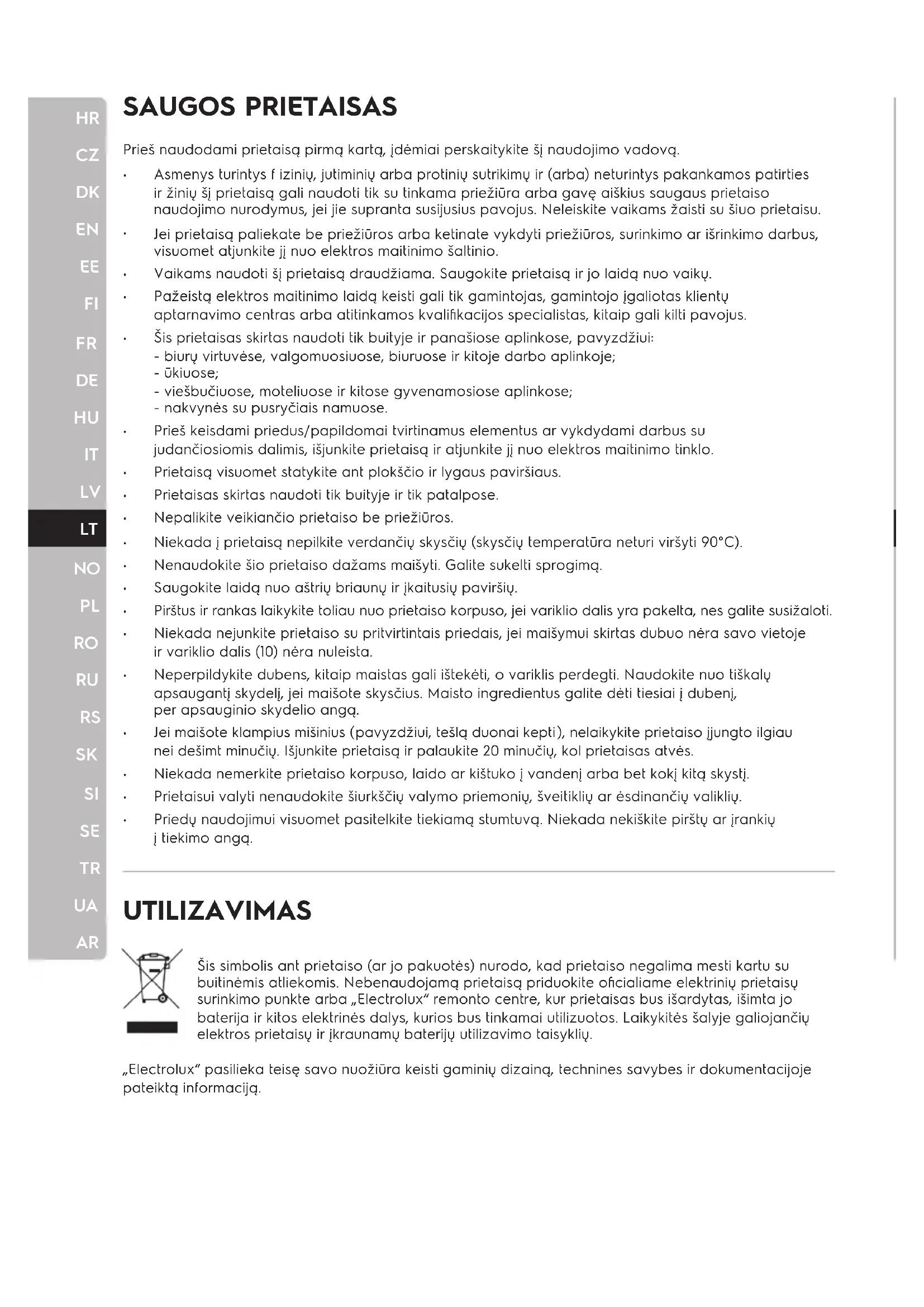 ARSAUGOS PRIETAISAS UTILIZAVIMAS Šis simbolis ant prietaiso (ar jo pakuotės) nurodo, kad prietaiso negalima mesti kartu su buitinėmis atliekomis. Nebenaudojamą prietaisą priduokite oficialiame elektrinių prietaisų surinkimo punkte arba „Electrolux“ remonto centre, kur prietaisas bus išardytas, išimta jo baterija ir kitos elektrinės dalys, kurios bus tinkamai utilizuotos. Laikykitės šalyje galiojančių elektros prietaisų ir įkraunamų baterijų utilizavimo taisyklių. „Electrolux“ pasilieka teisę savo nuožiūra keisti gaminių dizainą, technines savybes ir dokumentacijoje pateiktą informaciją. Prieš naudodami prietaisą pirmą kartą, įdėmiai perskaitykite šį naudojimo vadovą. Asmenys turintys f izinių, jutiminių arba protinių sutrikimų ir (arba) neturintys pakankamos patirties ir žinių šį prietaisą gali naudoti tik su tinkama priežiūra arba gavę aiškius saugaus prietaiso naudojimo nurodymus, jei jie supranta susijusius pavojus. Neleiskite vaikams žaisti su šiuo prietaisu. Jei prietaisą paliekate be priežiūros arba ketinate vykdyti priežiūros, surinkimo ar išrinkimo darbus, visuomet atjunkite jį nuo elektros maitinimo šaltinio. Vaikams naudoti šį prietaisą draudžiama. Saugokite prietaisą ir jo laidą nuo vaikų. Pažeistą elektros maitinimo laidą keisti gali tik gamintojas, gamintojo įgaliotas klientų aptarnavimo centras arba atitinkamos kvalifikacijos specialistas, kitaip gali kilti pavojus. Šis prietaisas skirtas naudoti tik buityje ir panašiose aplinkose, pavyzdžiui: - biurų virtuvėse, valgomuosiuose, biuruose ir kitoje darbo aplinkoje; - ūkiuose; - viešbučiuose, moteliuose ir kitose gyvenamosiose aplinkose; - nakvynės su pusryčiais namuose. Prieš keisdami priedus/papildomai tvirtinamus elementus ar vykdydami darbus su judančiosiomis dalimis, išjunkite prietaisą ir atjunkite jį nuo elektros maitinimo tinklo. Prietaisą visuomet statykite ant plokščio ir lygaus paviršiaus. Prietaisas skirtas naudoti tik buityje ir tik patalpose. Nepalikite veikiančio prietaiso be priežiūros. Niekada į prietaisą nepilkite verdančių skysčių (skysčių temperatūra neturi viršyti 90°C). Nenaudokite šio prietaiso dažams maišyti. Galite sukelti sprogimą. Saugokite laidą nuo aštrių briaunų ir įkaitusių paviršių. Pirštus ir rankas laikykite toliau nuo prietaiso korpuso, jei variklio dalis yra pakelta, nes galite susižaloti. Niekada nejunkite prietaiso su pritvirtintais priedais, jei maišymui skirtas dubuo nėra savo vietoje ir variklio dalis (10) nėra nuleista. Neperpildykite dubens, kitaip maistas gali ištekėti, o variklis perdegti. Naudokite nuo tiškalų apsaugantį skydelį, jei maišote skysčius. Maisto ingredientus galite dėti tiesiai į dubenį, per apsauginio skydelio angą. Jei maišote klampius mišinius (pavyzdžiui, tešlą duonai kepti), nelaikykite prietaiso įjungto ilgiau nei dešimt minučių. Išjunkite prietaisą ir palaukite 20 minučių, kol prietaisas atvės. Niekada nemerkite prietaiso korpuso, laido ar kištuko į vandenį arba bet kokį kitą skystį. Prietaisui valyti nenaudokite šiurkščių valymo priemonių, šveitiklių ar ėsdinančių valiklių. Priedų naudojimui visuomet pasitelkite tiekiamą stumtuvą. Niekada nekiškite pirštų ar įrankių į tiekimo angą.