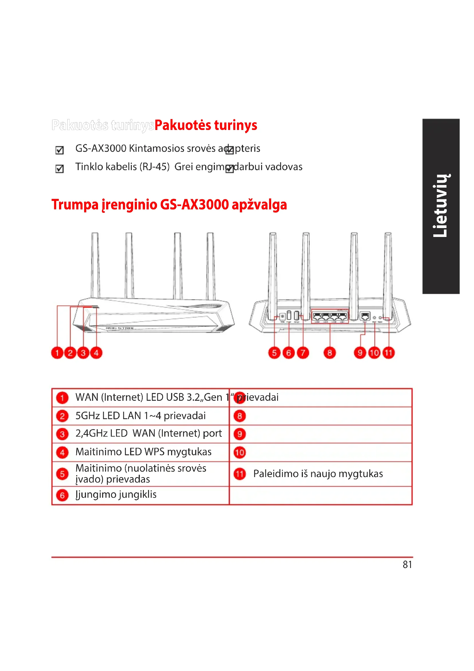 - Potete consultare il manuale utente online all'indirizzo http://www.asus.com/it/ support81 Lietuvių Trumpa įrenginio GS-AX3000 apžvalgaTrumpa įrenginio GS-AX3000 apžvalga Pakuotės turinysPakuotės turinys GS-AX3000 Kintamosios srovės adapteris Tinklo kabelis (RJ-45) Grei engimo darbui vadovas WAN (Internet) LED USB 3.2„Gen 1“ prievadai 5GHz LED LAN 1~4 prievadai 2,4GHz LED WAN (Internet) port Maitinimo LED WPS mygtukas Maitinimo (nuolatinės srovės įvado) prievadas Paleidimo iš naujo mygtukas Įjungimo jungiklis82 Lietuvių Vietos išrinkimas belaidžiam maršruto parinktuvuiVietos išrinkimas belaidžiam maršruto parinktuvui Kad belaidis signalas tarp belaidžio maršruto parinktuvo ir prie jo prijungtų tinklo įtaisų būtų kuo stipresnis: