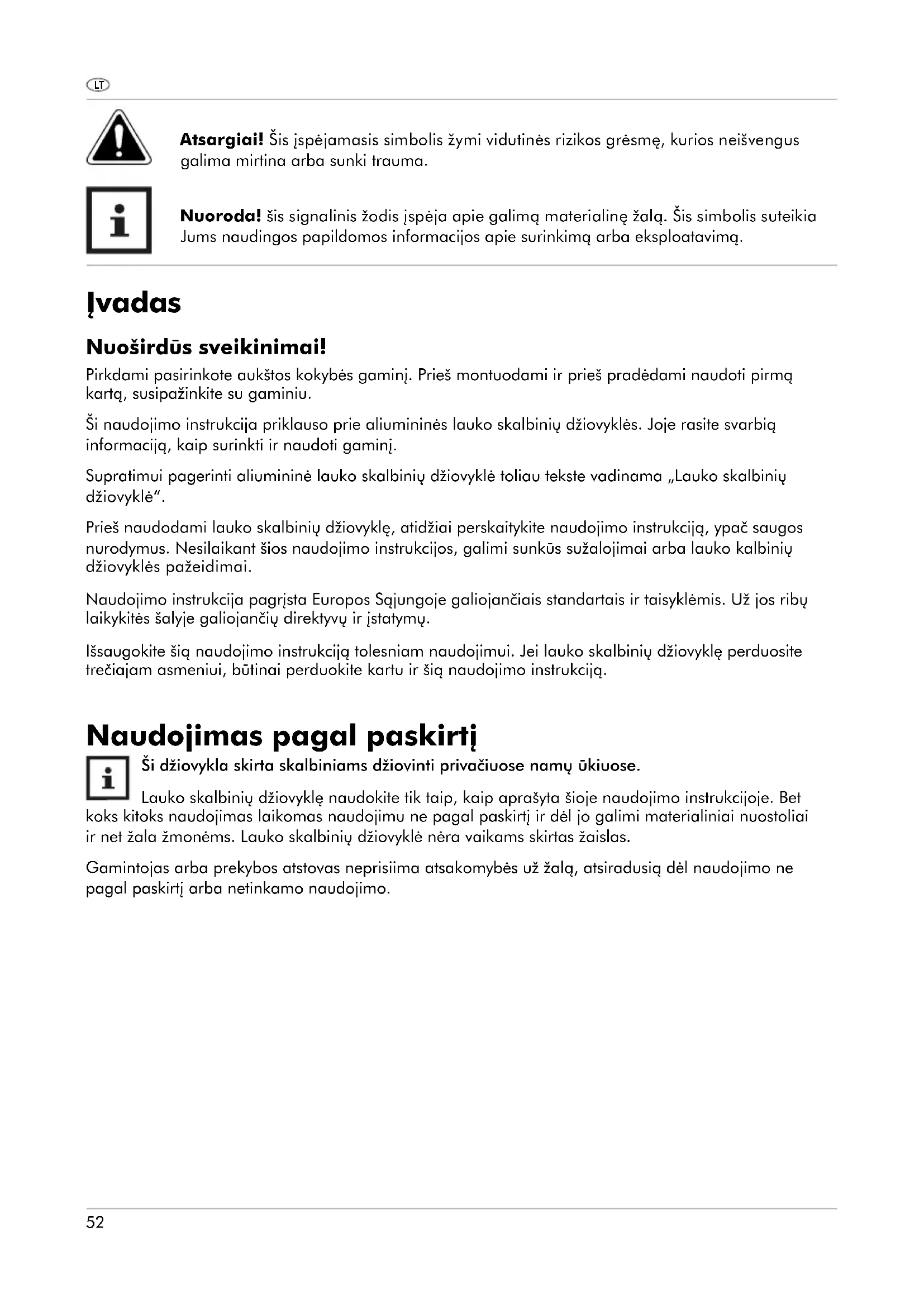 Ši džiovykla skirta skalbiniams džiovinti privačiuose namų ūkiuose. Lauko skalbinių džiovyklę naudokite tik taip, kaip aprašyta šioje naudojimo instrukcijoje. Bet koks kitoks naudojimas laikomas naudojimu ne pagal paskirtį ir dėl jo galimi materialiniai nuostoliai ir net žala žmonėms. Lauko skalbinių džiovyklė nėra vaikams skirtas žaislas. Gamintojas arba prekybos atstovas neprisiima atsakomybės už žalą, atsiradusią dėl naudojimo ne pagal paskirtį arba netinkamo naudojimo. LT53