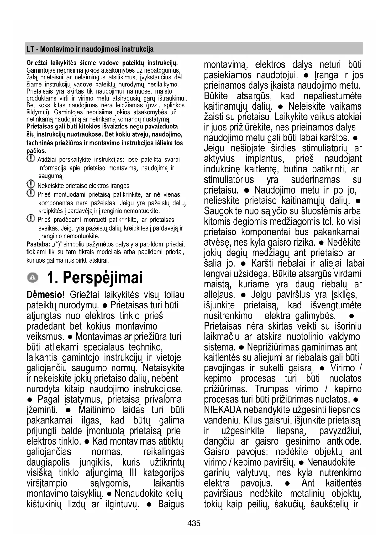 Dėmesio! Griežtai laikykitės visų toliau pateiktų nurodymų. ● Prietaisas turi būti atjungtas nuo elektros tinklo prieš pradedant bet kokius montavimo veiksmus. ● Montavimas ar priežiūra turi būti atliekami specialaus techniko, laikantis gamintojo instrukcijų ir vietoje galiojančių saugumo normų. Netaisykite ir nekeiskite jokių prietaiso dalių, nebent nurodyta kitaip naudojimo instrukcijose. ● Pagal įstatymus, prietaisą privaloma įžeminti. ● Maitinimo laidas turi būti pakankamai ilgas, kad būtų galima prijungti balde įmontuotą prietaisą prie elektros tinklo. ● Kad montavimas atitiktų galiojančias normas, reikalingas daugiapolis jungiklis, kuris užtikrintų visišką tinklo atjungimą III kategorijos viršįtampio sąlygomis, laikantis montavimo taisyklių. ● Nenaudokite kelių kištukinių lizdų ar ilgintuvų. ● Baigus montavimą, elektros dalys neturi būti pasiekiamos naudotojui. ● Įranga ir jos prieinamos dalys įkaista naudojimo metu. Būkite atsargūs, kad nepaliestumėte kaitinamųjų dalių. ● Neleiskite vaikams žaisti su prietaisu. Laikykite vaikus atokiai ir juos prižiūrėkite, nes prieinamos dalys naudojimo metu gali būti labai karštos. ● Jeigu nešiojate širdies stimuliatorių ar aktyvius implantus, prieš naudojant indukcinę kaitlentę, būtina patikrinti, ar stimuliatorius yra suderinamas su prietaisu. ● Naudojimo metu ir po jo, nelieskite prietaiso kaitinamųjų dalių. ● Saugokite nuo sąlyčio su šluostėmis arba kitomis degiomis medžiagomis tol, ko visi prietaiso komponentai bus pakankamai atvėsę, nes kyla gaisro rizika. ● Nedėkite jokių degių medžiagų ant prietaiso ar šalia jo. ● Karšti riebalai ir aliejai labai lengvai užsidega. Būkite atsargūs virdami maistą, kuriame yra daug riebalų ar aliejaus. ● Jeigu paviršius yra įskilęs, išjunkite prietaisą, kad išvengtumėte nusitrenkimo elektra galimybės. ● Prietaisas nėra skirtas veikti su išoriniu laikmačiu ar atskira nuotolinio valdymo sistema. ● Neprižiūrimas gaminimas ant kaitlentės su aliejumi ar riebalais gali būti pavojingas ir sukelti gaisrą. ● Virimo / kepimo procesas turi būti nuolatos prižiūrimas. Trumpas virimo / kepimo procesas turi būti prižiūrimas nuolatos. ● NIEKADA nebandykite užgesinti liepsnos vandeniu. Kilus gaisrui, išjunkite prietaisą ir užgesinkite liepsną, pavyzdžiui, dangčiu ar gaisro gesinimo antklode. Gaisro pavojus: nedėkite objektų ant virimo / kepimo paviršių. ● Nenaudokite garinių valytuvų, nes kyla nutrenkimo elektra pavojus. ● Ant kaitlentės paviršiaus nedėkite metalinių objektų, tokių kaip peilių, šakučių, šaukštelių ir436 dangčių, nes ji gali perkaisti. ● Prieš prijungdami prietaisą prie elektros energijos tinklo: patikrinkite duomenų lentelę (apatinėje prietaiso dalyje), kad įsitikintumėte, jog įtampa ir galia atitinka tinklo įtampą bei galią ir prijungimo lizdas yra tinkamas. Kilus dvejonėms, kreipkitės į kvalifikuotą elektriką. Svarbu. ● Baigę naudotis, išjunkite kaitlentę valdymo įtaisu, o ne remkitės puodų detektoriumi. ● Stenkitės, kad skysčiai neišbėgtų, todėl virdami ar šildydami skysčius sumažinkite karštį. ● Kaitinančiųjų dalių nepalikite įjungtų puodams ar keptuvėms esant tuščioms ir jeigu ant kaitlentės nėra ko šildyti. ● Baigę gaminti valgį, išjunkite naudotą kaitinimo zoną. ● Maistui gaminti niekada nenaudokite aliuminio folijos ir niekada tiesiai nedėkite aliuminiu supakuotų gaminių. Aliuminis prilips ir nepataisomai sugadins jūsų prietaisą. ● Niekada nešildykite skardinių su maistu prieš tai jų neatidarę: jos gali sprogti! Šis perspėjimas taikomas ir visų kitų rūšių kaitlentėms. ● Padidintos galios naudojimas, pavyzdžiui, „Booster“ funkcija, nėra pritaikyta kai kurių skysčių, tokių kaip kepimo aliejus, šildymui. Per didelis karštis gali būti pavojingas. Tokiais atvejais, patariame naudoti mažesnę galią. ● Indai turi būti uždėti tiesiogiai kaitlentės centre. Jokiais būdais nedėkite kokių nors objektų tarp puodo ar keptuvės ir kaitlentės paviršiaus. ● Esant per aukštai temperatūrai, prietaisas automatiškai sumažina kaitinimo zonų galios lygį. ● Prieš kiekvieną valymo arba priežiūros operaciją išjunkite prietaisą iš elektros tinklo, ištraukdami kištuką arba išjungdami kambario pagrindinį jungiklį. ● Visų montavimo ir priežiūros darbų metu mūvėkite darbines pirštines. ● Prietaisą gali naudoti ne mažesni nei 8 metų vaikai ir fizinę, jutiminę arba protinę negalią turintys asmenys arba asmenys, neturintys patirties arba reikalingų žinių, jei jie yra prižiūrimi arba jei jiems buvo pateiktos instrukcijos apie saugų prietaiso naudojimą ir su juo susijusius pavojus. ● Reikia prižiūrėti vaikus, kad jie nežaistų su prietaisu. ● Draudžiama atlikti priežiūrą ir valyti vaikams be priežiūros. ● Jei prietaisas naudojamas vienu metu su kitais dujas arba kitą kurą naudojančiais prietaisais, patalpoje turi būti užtikrinta pakankama ventiliacija. ● Prietaiso vidų ir išorę reikia dažnai nuvalyti (BENT KARTĄ PER MĖNESĮ). Bet kokiu atveju, laikykitės priežiūros instrukcijose nurodytos informacijos. ● Nesilaikant prietaiso valymo bei filtrų keitimo ir valymo taisyklių, kyla gaisro rizika. ● Griežtai draudžiama kepti atviroje liepsnoje. ● Atvira ugnis kenkia filtrams ir gali sukelti gaisrą, todėl jos jokiu būdu negalima naudoti. ● Kepant aliejuje būtina nuolatinė priežiūra, kad perkaitęs aliejus neužsidegtų. -● DĖMESIO: kaitlentei esant įjungtai, prieinamos prietaiso dalys gali įkaisti. ● Dėmesio! Nejunkite prietaiso prie elektros tinklo, kol visiškai jo nesumontuosite. ● Dūmų šalinimui reikia taikyti technines ir saugos priemones, griežtai vadovaujantis vietinėmis kompetentingų institucijų reglamentuose numatytomis nuostatomis