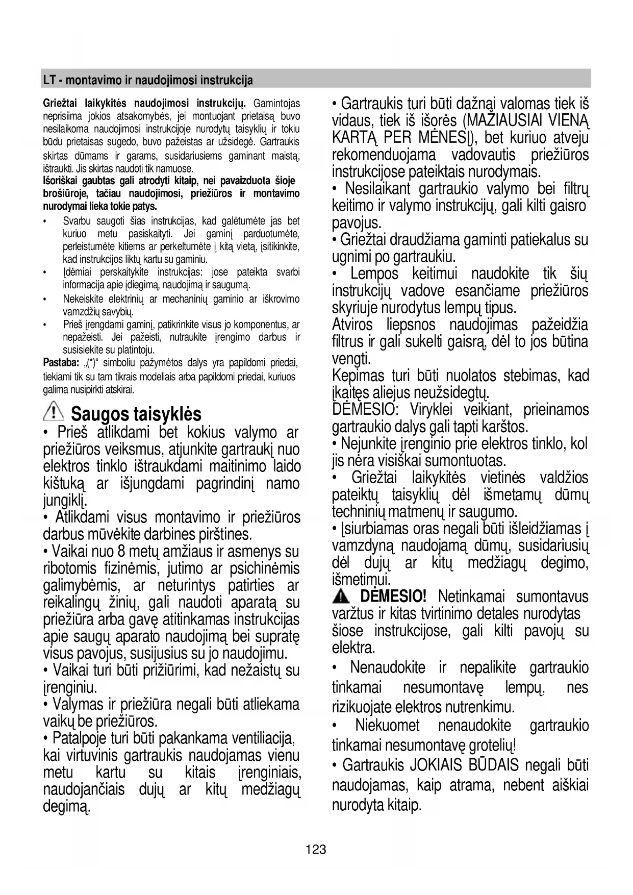 - Filtri eemaldamiseks toimige vastupidises järjekorras. Pirnide vahetamine Õhupuhasti on varustatud LED-valgustitega. LED-lambid tagavad optimaalse valguse kuni kümme korda pikema kestvusega võrreldes tavalampidega ning nende elektrienergia kokkuhoid on 90%. Kasutaja ei saa valgustussüsteemi ise välja vahetada, rikete korral pöörduge müügijärgse teeninduse poole.123 LT - montavimo ir naudojimosi instrukcija Griežtai laikykitės naudojimosi instrukcijų. Gamintojas neprisiima jokios atsakomybės, jei montuojant prietaisą buvo nesilaikoma naudojimosi instrukcijoje nurodytų taisyklių ir tokiu būdu prietaisas sugedo, buvo pažeistas ar užsidegė. Gartraukis skirtas dūmams ir garams, susidariusiems gaminant maistą, ištraukti. Jis skirtas naudoti tik namuose. Išoriškai gaubtas gali atrodyti kitaip, nei pavaizduota šioje brošiūroje, tačiau naudojimosi, priežiūros ir montavimo nurodymai lieka tokie patys.