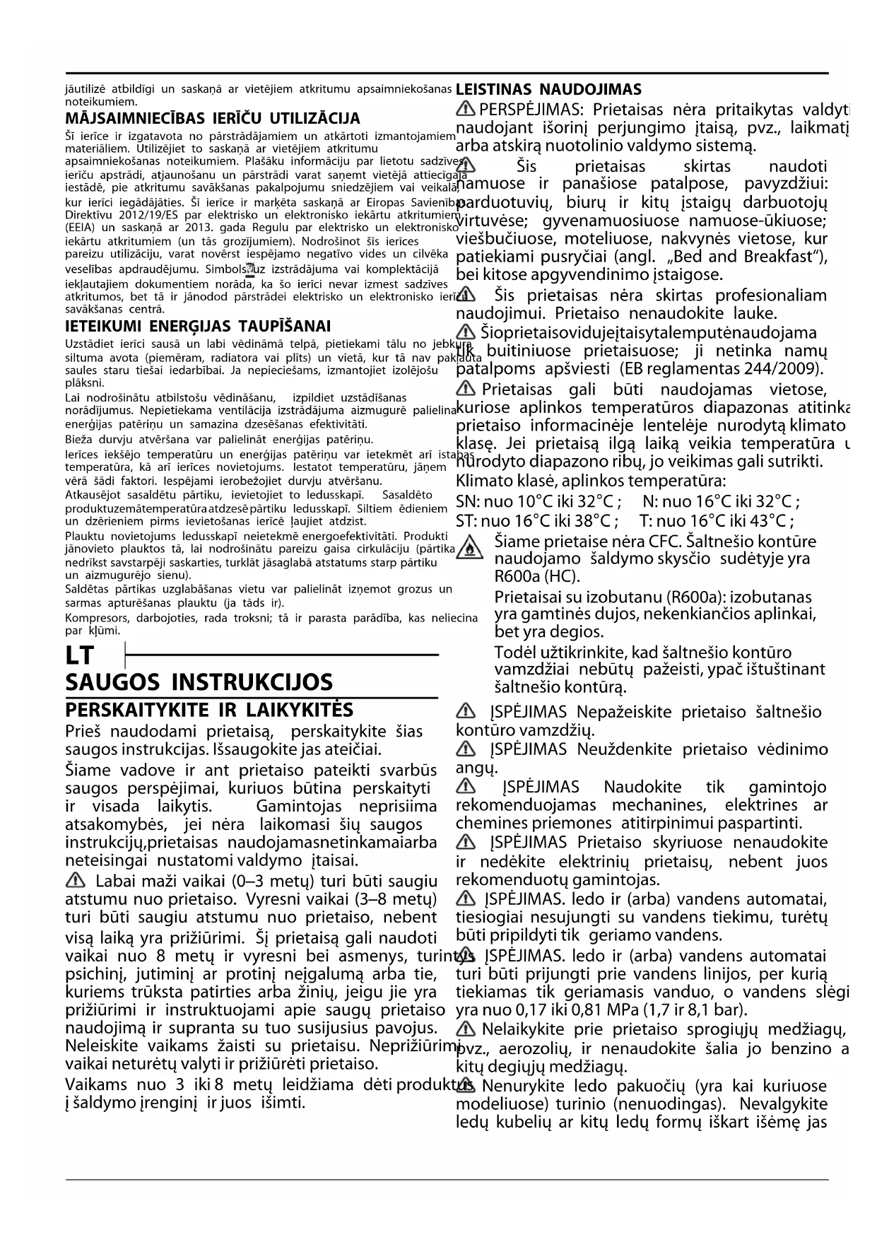 Prieš naudodami prietaisą, perskaitykite šias saugos instrukcijas. Išsaugokite jas ateičiai. Šiame vadove ir ant prietaiso pateikti svarbūs saugos perspėjimai, kuriuos būtina perskaityti ir visada laikytis. Gamintojas neprisiima atsakomybės, jei nėra laikomasi šių saugos instrukcijų,prietaisas naudojamasnetinkamaiarba neteisingai nustatomi valdymo įtaisai. Labai maži vaikai (0–3 metų) turi būti saugiu atstumu nuo prietaiso. Vyresni vaikai (3–8 metų) turi būti saugiu atstumu nuo prietaiso, nebent visą laiką yra prižiūrimi. Šį prietaisą gali naudoti vaikai nuo 8 metų ir vyresni bei asmenys, turintys psichinį, jutiminį ar protinį neįgalumą arba tie, kuriems trūksta patirties arba žinių, jeigu jie yra prižiūrimi ir instruktuojami apie saugų prietaiso naudojimą ir supranta su tuo susijusius pavojus. Neleiskite vaikams žaisti su prietaisu. Neprižiūrimi vaikai neturėtų valyti ir prižiūrėti prietaiso. Vaikams nuo 3 iki 8 metų leidžiama dėti produktus į šaldymo įrenginį ir juos išimti. LEISTINAS NAUDOJIMAS PERSPĖJIMAS: Prietaisas nėra pritaikytas valdyti naudojant išorinį perjungimo įtaisą, pvz., laikmatį, arba atskirą nuotolinio valdymo sistemą. Šis prietaisas skirtas naudoti namuose ir panašiose patalpose, pavyzdžiui: parduotuvių, biurų ir kitų įstaigų darbuotojų virtuvėse; gyvenamuosiuose namuose-ūkiuose; viešbučiuose, moteliuose, nakvynės vietose, kur patiekiami pusryčiai (angl. „Bed and Breakfast“), bei kitose apgyvendinimo įstaigose. Šis prietaisas nėra skirtas profesionaliam naudojimui. Prietaiso nenaudokite lauke. Šioprietaisovidujeįtaisytalemputėnaudojama tik buitiniuose prietaisuose; ji netinka namų patalpoms apšviesti (EB reglamentas 244/2009). Prietaisas gali būti naudojamas vietose, kuriose aplinkos temperatūros diapazonas atitinka prietaiso informacinėje lentelėje nurodytą klimato klasę. Jei prietaisą ilgą laiką veikia temperatūra už nurodyto diapazono ribų, jo veikimas gali sutrikti. Klimato klasė, aplinkos temperatūra: SN: nuo 10°C iki 32°C ; N: nuo 16°C iki 32°C ; ST: nuo 16°C iki 38°C ; T: nuo 16°C iki 43°C ; Šiame prietaise nėra CFC. Šaltnešio kontūre naudojamo šaldymo skysčio sudėtyje yra R600a (HC). Prietaisai su izobutanu (R600a): izobutanas yra gamtinės dujos, nekenkiančios aplinkai, bet yra degios. Todėl užtikrinkite, kad šaltnešio kontūro vamzdžiai nebūtų pažeisti, ypač ištuštinant šaltnešio kontūrą. ĮSPĖJIMAS Nepažeiskite prietaiso šaltnešio kontūro vamzdžių. ĮSPĖJIMAS Neuždenkite prietaiso vėdinimo angų. ĮSPĖJIMAS Naudokite tik gamintojo rekomenduojamas mechanines, elektrines ar chemines priemones atitirpinimui paspartinti. ĮSPĖJIMAS Prietaiso skyriuose nenaudokite ir nedėkite elektrinių prietaisų, nebent juos rekomenduotų gamintojas. ĮSPĖJIMAS. ledo ir (arba) vandens automatai, tiesiogiai nesujungti su vandens tiekimu, turėtų būti pripildyti tik geriamo vandens. ĮSPĖJIMAS. ledo ir (arba) vandens automatai turi būti prijungti prie vandens linijos, per kurią tiekiamas tik geriamasis vanduo, o vandens slėgis yra nuo 0,17 iki 0,81 MPa (1,7 ir 8,1 bar). Nelaikykite prie prietaiso sprogiųjų medžiagų, pvz., aerozolių, ir nenaudokite šalia jo benzino ar kitų degiųjų medžiagų. Nenurykite ledo pakuočių (yra kai kuriuose modeliuose) turinio (nenuodingas). Nevalgykite ledų kubelių ar kitų ledų formų iškart išėmę jasiš šaldymo kameros, nes jie gali sukelti šalčio nudegimus. Gaminiuose, kuriuoseturibūtinaudojamas oro filtras, esantis po ventiliatoriaus gaubtu, veikiant šaldytuvui šis filtras visada turi būti vietoje. Šaldymo kameroje nelaikykite stiklinių talpų su skysčiais, nes jos gali skilti. Neužstatykite ventiliatoriaus (jei yra) maisto produktais. Įdėję maistą patikrinkite, ar tinkamai uždarėte skyrių dureles, ypač šaldiklio dureles. Pažeistus tarpiklius būtina kuo greičiau pakeisti. Šaldytuvąnaudokitetikšviežiammaistuilaikyti, o šaldymo kamera skirta tik šaldytam maistui laikyti, šviežiam maistui šaldyti ir ledo kubeliams daryti. Nelaikykite nesuvynioto maisto šaldytuvo ar šaldiklio skyriuose, kad maistas nekontaktuotų su vidiniais paviršiais. Prietaisai gali turėti specialius skyrius (šviežio maisto skyrių, nulio laipsnių dėžę...). Jei kitaip nenurodytaspecialiame prietaisolankstinuke, juos galima išimti ir tai neturės įtakos veikimui. C pentanas naudojamas kaip porodaris izoliacinėse putose; tai yra degios dujos. Toliau pateikiami tinkamiausi skyriai tam tikro tipo maisto produktams laikyti, atsižvelgiant į skirtingą temperatūrų pasiskirstymą skirtinguose įrenginio skyriuose: - Šaldytuvo skyrius: