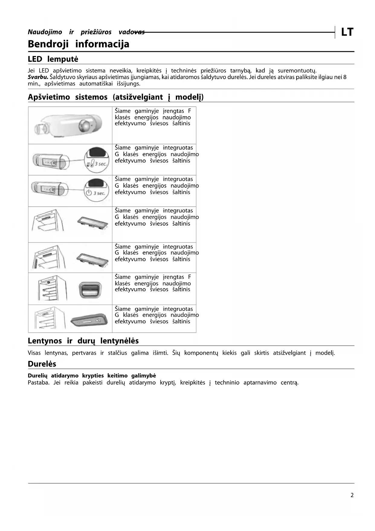 Bendroji informacija LED lemputė Jei LED apšvietimo sistema neveikia, kreipkitės į techninės priežiūros tarnybą, kad ją suremontuotų. Svarbu. Šaldytuvo skyriaus apšvietimas įjungiamas, kai atidaromos šaldytuvo durelės. Jei dureles atviras paliksite ilgiau nei 8 min., apšvietimas automatiškai išsijungs. Apšvietimo sistemos (atsižvelgiant į modelį) Šiame gaminyje įrengtas F klasės energijos naudojimo efektyvumo šviesos šaltinis Šiame gaminyje integruotas G klasės energijos naudojimo efektyvumo šviesos šaltinis Šiame gaminyje integruotas G klasės energijos naudojimo efektyvumo šviesos šaltinis Šiame gaminyje integruotas G klasės energijos naudojimo efektyvumo šviesos šaltinis Šiame gaminyje integruotas G klasės energijos naudojimo efektyvumo šviesos šaltinis Šiame gaminyje įrengtas F klasės energijos naudojimo efektyvumo šviesos šaltinis Šiame gaminyje integruotas G klasės energijos naudojimo efektyvumo šviesos šaltinis Lentynos ir durų lentynėlės Visas lentynas, pertvaras ir stalčius galima išimti. Šių komponentų kiekis gali skirtis atsižvelgiant į modelį. Durelės Durelių atidarymo krypties keitimo galimybė Pastaba. Jei reikia pakeisti durelių atidarymo kryptį, kreipkitės į techninio aptarnavimo centrą.Naudojimo ir priežiūros vadovas