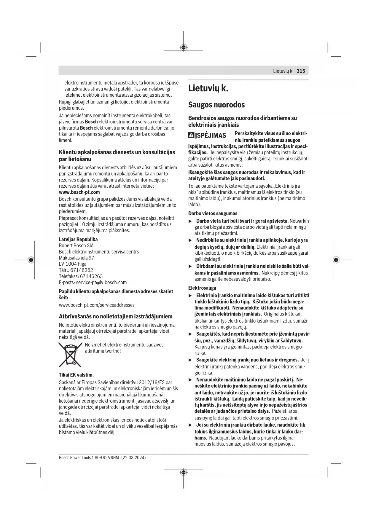 Slēdža modelis ar fiksatoru Lai nodotu ekspluatācijā elektroinstrumentu, vispirms nospiediet ieslēdzēju/izslēdzēju(2) ➊, pēc tam bīdiet uz priekšu➋. Nospiediet un pēc tam turiet nospiestu ➌. Lai fiksētu nospiesto ieslēdzēju/izslēdzēju(2) pabīdiet ieslēdzēju/izslēdzēju(2) vēl uz priekšu ➍. Lai elektroinstrumentu izslēgtu, atlaidiet ieslēdzēju/ izslēdzēju(2) vai īslaicīgi nospiediet un atlaidiet ieslēdzēju/ izslēdzēju(2), ja tas ir fiksēts ieslēgtā stāvoklī. Slēdža modelis bez fiksatora Lai nodotu ekspluatācijā elektroinstrumentu, vispirms nospiediet ieslēdzēju/izslēdzēju(2) ➊, pēc tam bīdiet uz priekšu➋. Nospiediet un pēc tam turiet nospiestu ➌. Lai elektroinstrumentu izslēgtu, atlaidiet ieslēdzēju(2). u Ik reizi pirms lietošanas pārbaudiet slīpēšanas darbinstrumentu. Slīpēšanas darbinstrumentam jābūt pareizi iestiprinātam un jāspēj brīvi griezties. Veiciet slīpēšanas darbinstrumenta pārbaudi, to vismaz 1 minūti ilgi darbinot bez slodzes. Nelietojiet bojātus, neapaļus vai vibrējošus slīpēšanas darbinstrumentus. Bojāti slīpēšanas darbinstrumenti var salūzt un radīt savainojumus. Apkalpošana un apkope Apkalpošana un tīrīšana u Pirms elektroinstrumenta apkopes vai apkalpošanas izvelciet tā elektrokabeļa kontaktdakšu no barojošā elektrotīkla kontaktligzdas. u Lai elektroinstruments darbotos droši un bez atteikumiem, regulāri tīriet tā korpusu un ventilācijas atveres. u Strādājot ekstremālos apstākļos, ja iespējams, lietojiet ārējo putekļu uzsūkšanas ierīci. Pēc iespējas biežāk izpūtiet ventilācijas atveres ar saspiestu gaisu un pievienojiet instrumentu elektrotīklam caur noplūdes strāvas aizsargreleju (PRCD). Izmantojot 1 609 92A 9HM | (22.03.2024) Bosch Power ToolsLietuvių k. | 315 elektroinstrumentu metāla apstrādei, tā korpusa iekšpusē var uzkrāties strāvu vadoši putekļi. Tas var nelabvēlīgi ietekmēt elektroinstrumenta aizsargizolācijas sistēmu. Rūpīgi glabājiet un uzmanīgi lietojiet elektroinstrumenta piederumus. Ja nepieciešams nomainīt instrumenta elektrokabeli, tas jāveic firmas Bosch elektroinstrumentu servisa centrā vai pilnvarotā Bosch elektroinstrumentu remonta darbnīcā, jo tikai tā ir iespējams saglabāt vajadzīgo darba drošības līmeni. Klientu apkalpošanas dienests un konsultācijas par lietošanu Klientu apkalpošanas dienests atbildēs uz Jūsu jautājumiem par izstrādājumu remontu un apkalpošanu, kā arī par to rezerves daļām. Kopsalikuma attēlus un informāciju par rezerves daļām Jūs varat atrast interneta vietnē: www.bosch-pt.com Bosch konsultantu grupa palīdzēs Jums vislabākajā veidā rast atbildes uz jautājumiem par mūsu izstrādājumiem un to piederumiem. Pieprasot konsultācijas un pasūtot rezerves daļas, noteikti paziņojiet 10zīmju izstrādājuma numuru, kas norādīts uz izstrādājuma marķējuma plāksnītes. Latvijas Republika Robert Bosch SIA Bosch elektroinstrumentu servisa centrs Mūkusalas ielā 97 LV-1004 Rīga Tālr.: 67146262 Telefakss: 67146263 E-pasts: service-pt@lv.bosch.com Papildu klientu apkalpošanas dienesta adreses skatiet šeit: www.bosch-pt.com/serviceaddresses Atbrīvošanās no nolietotajiem izstrādājumiem Nolietotie elektroinstrumenti, to piederumi un iesaiņojuma materiāli jāpakļauj otrreizējai pārstrādei apkārtējai videi nekaitīgā veidā. Neizmetiet elektroinstrumentu sadzīves atkritumu tvertnē! Tikai EK valstīm. Saskaņā ar Eiropas Savienības direktīvu 2012/19/ES par nolietotajām elektriskajām un elektroniskajām ierīcēm un šīs direktīvas atspoguļojumiem nacionālajā likumdošanā, lietošanai nederīgie elektroinstrumenti jāsavāc atsevišķi un jānogādā otrreizējai pārstrādei apkārtējai videi nekaitīgā veidā. Ja elektriskās un elektroniskās ierīces netiek atbilstoši utilizētas, tās var kaitēt videi un cilvēku veselībai iespējamās bīstamo vielu klātbūtnes dēļ. Lietuvių k. Saugos nuorodos Bendrosios saugos nuorodos dirbantiems su elektriniais įrankiais ĮSPĖJIMAS Perskaitykite visus su šiuo elektri- niu įrankiu pateikiamus saugos įspėjimus, instrukcijas, peržiūrėkite iliustracijas ir speci- fikacijas. Jei nepaisysite visų žemiau pateiktų instrukcijų, galite patirti elektros smūgį, sukelti gaisrą ir sunkiai susižaloti arba sužaloti kitus asmenis. Išsaugokite šias saugos nuorodas ir reikalavimus, kad ir ateityje galėtumėte jais pasinaudoti. Toliau pateiktame tekste vartojama sąvoka „Elektrinis įra- nkis“ apibūdina įrankius, maitinamus iš elektros tinklo (su maitinimo laidu), ir akumuliatorinius įrankius (be maitinimo laido). Darbo vietos saugumas u Darbo vieta turi būti švari ir gerai apšviesta. Netvarkin- ga arba blogai apšviesta darbo vieta gali tapti nelaimingų atsitikimų priežastimi. u Nedirbkite su elektriniu įrankiu aplinkoje, kurioje yra degių skysčių, dujų ar dulkių. Elektriniai įrankiai gali kibirkščiuoti, o nuo kibirkščių dulkės arba susikaupę garai gali užsidegti. u Dirbdami su elektriniu įrankiu neleiskite šalia būti vai- kams ir pašaliniams asmenims. Nukreipę dėmesį į kitus asmenis galite nebesuvaldyti prietaiso. Elektrosauga u Elektrinio įrankio maitinimo laido kištukas turi atitikti tinklo kištukinio lizdo tipą. Kištuko jokiu būdu nega- lima modifikuoti. Nenaudokite kištuko adapterių su įžemintais elektriniais įrankiais. Originalūs kištukai, tiksliai tinkantys elektros tinklo kištukiniam lizdui, sumaži- na elektros smūgio pavojų. u Saugokitės, kad neprisiliestumėte prie įžemintų pavir- šių, pvz., vamzdžių, šildytuvų, viryklių ar šaldytuvų. Kai jūsų kūnas yra įžemintas, padidėja elektros smūgio rizika. u Saugokite elektrinį įrankį nuo lietaus ir drėgmės. Jei į elektrinį įrankį patenka vandens, padidėja elektros smū- gio rizika. u Nenaudokite maitinimo laido ne pagal paskirtį. 