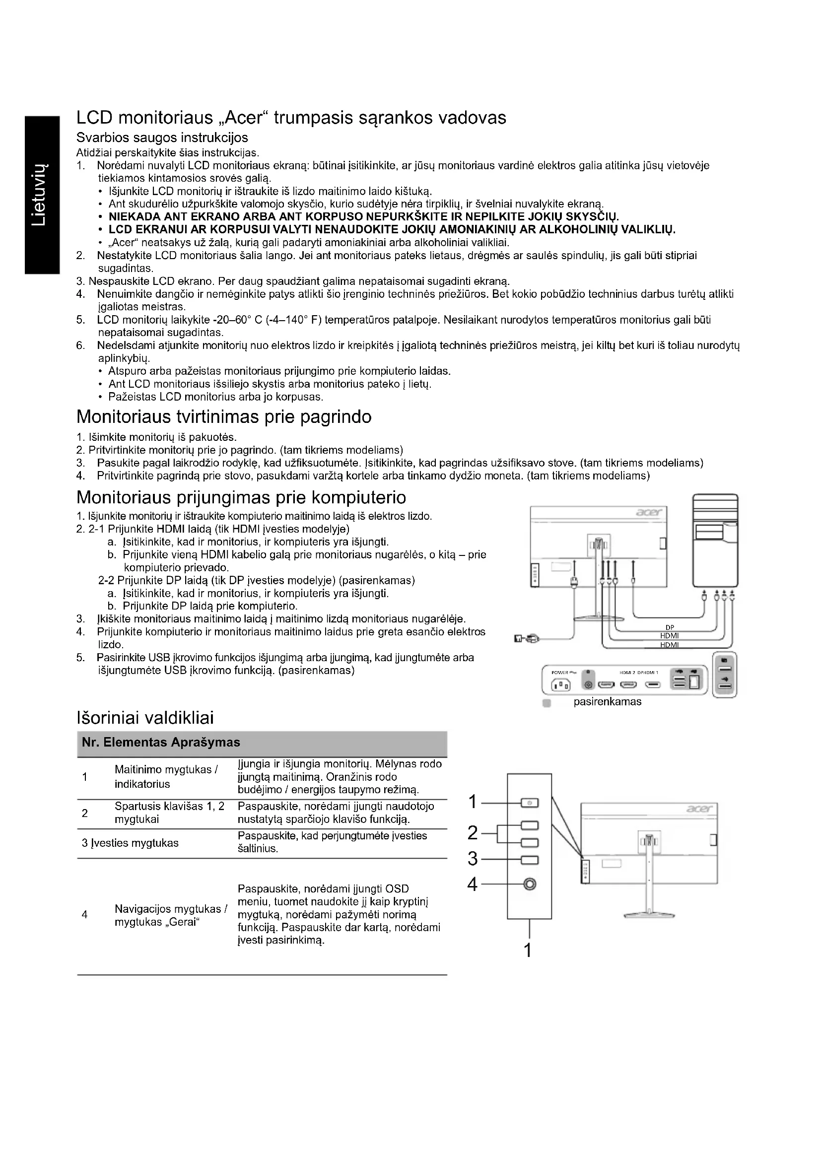 - Energijos sąnaudos per metus 86 (kWh) (HDMI įvesties modeliui) Energijos sąnaudos (esant 200 nitų) Įjungimo režimu 45 W (įprastos) Miego režimu 0,45 W (įprastos) Išjungimo režimu 0,3 W (įprastos) Įvesties jungtis HDMI (tik HDMI įvesties modelyje) / DP (tik DP įvesties modelis) Vaizdo įvesties signalas HDMI (tik HDMI įvesties modelyje) (pasirenkamas) / DP (tik DP įvesties modelis) (pasirenkamas) Garsiakalbiai 2 W x 2 (tik garso įvesties modelis) (pasirenkamas) USB USB 3.0 x 4 (pasirenkamas) Didžiausias ekrano dydis Horizontaliai: 708,4 mm Vertikaliai: 398,5 mm Maitinimo šaltinis: 100-240 V, 50/60 Hz Aplinkos sąlygos Naudojimo temperatūra: 0–40° C Saugojimo temperatūra: -20–60° C Naudojimo drėgmė: 20–80 % Matmenys 727,48 (P) x 479,18 ~ 609,18 (A) x 269 (G) mm Svoris (grynasis) 9,5 kg (grynasis) Mechanizmų techniniai duomenys Pakreipimas: nuo -5° iki +35° (tik aukščiausiame pakėlimo taške galima pakreipti 35 laipsnių kampu) Pasukimas: 360° Aukščio reguliavimas: nuo 0 iki 130 mm Sukimosi ašis: nėra Atkabinamas kojos stovas: taip Išoriniai valdikliai Jungikliai / mygtukai Maitinimo mygtukas Spartusis klavišas 1 Spartusis klavišas 2 Įvestis Meniu/Navigacija/Gerai Funkcijos Ryškumas Kontrastas Mėlyna šviesa Juodos spavos akcentavimas ACM HDR*** Ypatingas ryškumas Gama Spalvinė temperatūra Režimai Spalvų spektras Pilkumo tonų režimas 6 ašių atspalvis 6 ašių grynis Garsumas Nutildyti Greitinimas FreeSync Premium** Atnaujinimo dažnis Itin maža gaištis Taikiklis Kalba Ekrano rodinio skirtasis laikas Skaidrumas OSD užraktas Įvestis Automatinis šaltinis DP formatas Sparčiojo klavišo priskyrimas Platusis režimas PIP/PBP DDC/CI HDMI juodų atspalvių lygis Greitojo paleidimo režimas Didesnis greitis# USB įkrovimo išjungimas Ekrano informacija Nustatyti visas nuostatas iš naujo Išeiti Specifikacijos priklauso nuo modelio ir (arba) regiono.Latviski Acer LCD monitora īsā darba sākšanas rokasgrāmata Svarīgas drošības instrukcijas Lūdzu, uzmanīgi izlasiet tālāk sniegtās instrukcijas. 1. LCD monitora ekrāna tīrīšana. Pārbaudiet, vai monitora elektriskais spriegums ir piemērots ierīces izmantošanai ar jūsu atrašanās vietā esošo maiņstrāvu.• Izslēdziet LCD monitoru un atvienojiet strāvas vadu.