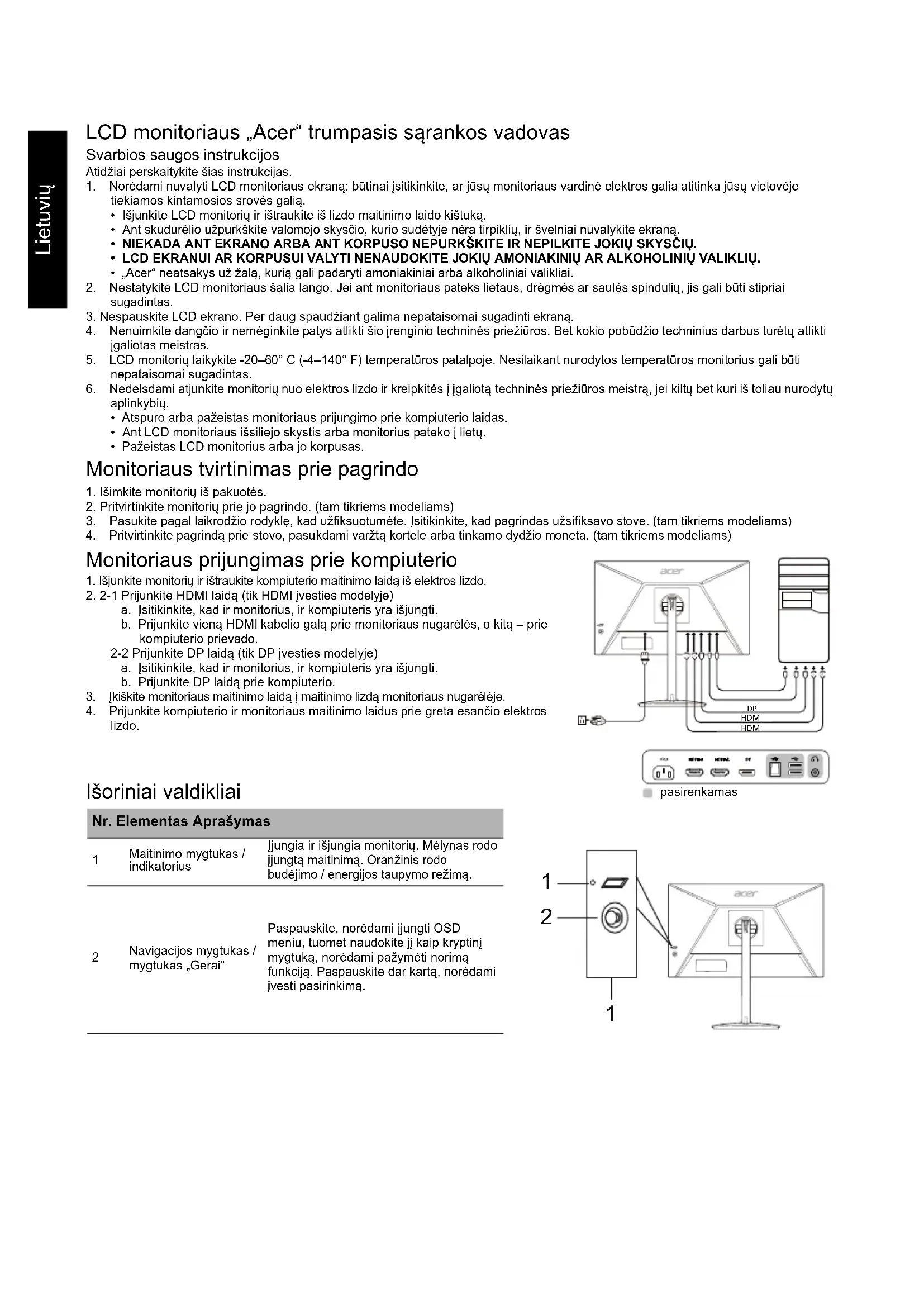 Kontrastas 100000000:1 maks. (ACM) Regimasis kampas 178° (H) 178° (V) (CR=10) Atsako trukmė 1 ms (VRB) Plokštės tipas VA Horizontalusis dažnis HDMI: 31–184 kHz DP: 184–184 kHz Vertikalusis dažnis HDMI: 56–165 Hz DP: 48–165 Hz Ekrano spalvos 16,7 milijonų Taškų dažnis 400 MHz Didžiausia skiriamoji geba 1920 x 1080 esant 165 Hz Funkcija „Plug & Play“ VESA DDCCI/DDC2B Energijos sąnaudos (esant 200 nitų) Įjungimo režimu 21 W Miego režimu 0,5 W Išjungimo režimu 0,3 W Įvesties jungtis HDMI (tik HDMI įvesties modelyje) DP (tik DP įvesties modelis) Vaizdo įvesties signalas HDMI (tik HDMI įvesties modelyje) (pasirenkamas) DP (tik DP įvesties modelis) (pasirenkamas) Garsiakalbiai 2 W x 2 (tik garso įvesties modelis) (pasirenkamas) USB USB 2.0 x 2 (pasirenkamas) Didžiausias ekrano dydis Horizontaliai: 521,395 mm Vertikaliai: 293,284 mm Maitinimo šaltinis: 100–240 V, 50/60 Hz Aplinkos sąlygos Naudojimo temperatūra: 0–40° C Saugojimo temperatūra: -20–60° C Naudojimo drėgmė: 20–80 % Matmenys 535,55 (P) x 383,38 ~ 503,38 (A) x 233,65 (G) mm Svoris (grynasis) 5,05 kg (grynasis) Mechanizmų techniniai duomenys Pakreipimas: nuo -5° iki +25° (tik aukščiausiame pakėlimo taške galima pakreipti 25 laipsnių kampu) Pasukimas: 360° Aukščio reguliavimas: nuo 0 iki 120 mm Sukimosi ašis: nėra Atkabinamas kojos stovas: taip Išoriniai valdikliai Jungikliai / mygtukai Maitinimo mygtukas Meniu/Navigacija/Gerai Funkcijos Ryškumas Kontrastas Mėlyna šviesa Juodos spavos akcentavimas ACM HDR Ypatingas ryškumas Gama Spalvinė temperatūra Režimai Spalvų spektras Pilkumo tonų režimas 6 ašių atspalvis 6 ašių grynis Garsumas Nutildyti Greitinimas FreeSync Premium Atnaujinimo dažnis VRB Itin maža gaištis Taikiklis Kalba Ekrano rodinio skirtasis laikas Skaidrumas OSD užraktas Įvestis Automatinis šaltinis DP formatas Platusis režimas DDC/CI HDMI juodų atspalvių lygis Greitojo paleidimo režimas Ekrano informacija Nustatyti visas nuostatas iš naujo Išeiti Specifikacijos priklauso nuo modelio ir (arba) regiono.Latviski Acer LCD monitora īsā darba sākšanas rokasgrāmata Svarīgas drošības instrukcijas Lūdzu, uzmanīgi izlasiet tālāk sniegtās instrukcijas. 1. LCD monitora ekrāna tīrīšana. Pārbaudiet, vai monitora elektriskais spriegums ir piemērots ierīces izmantošanai ar jūsu atrašanās vietā esošo maiņstrāvu.• Izslēdziet LCD monitoru un atvienojiet strāvas vadu.