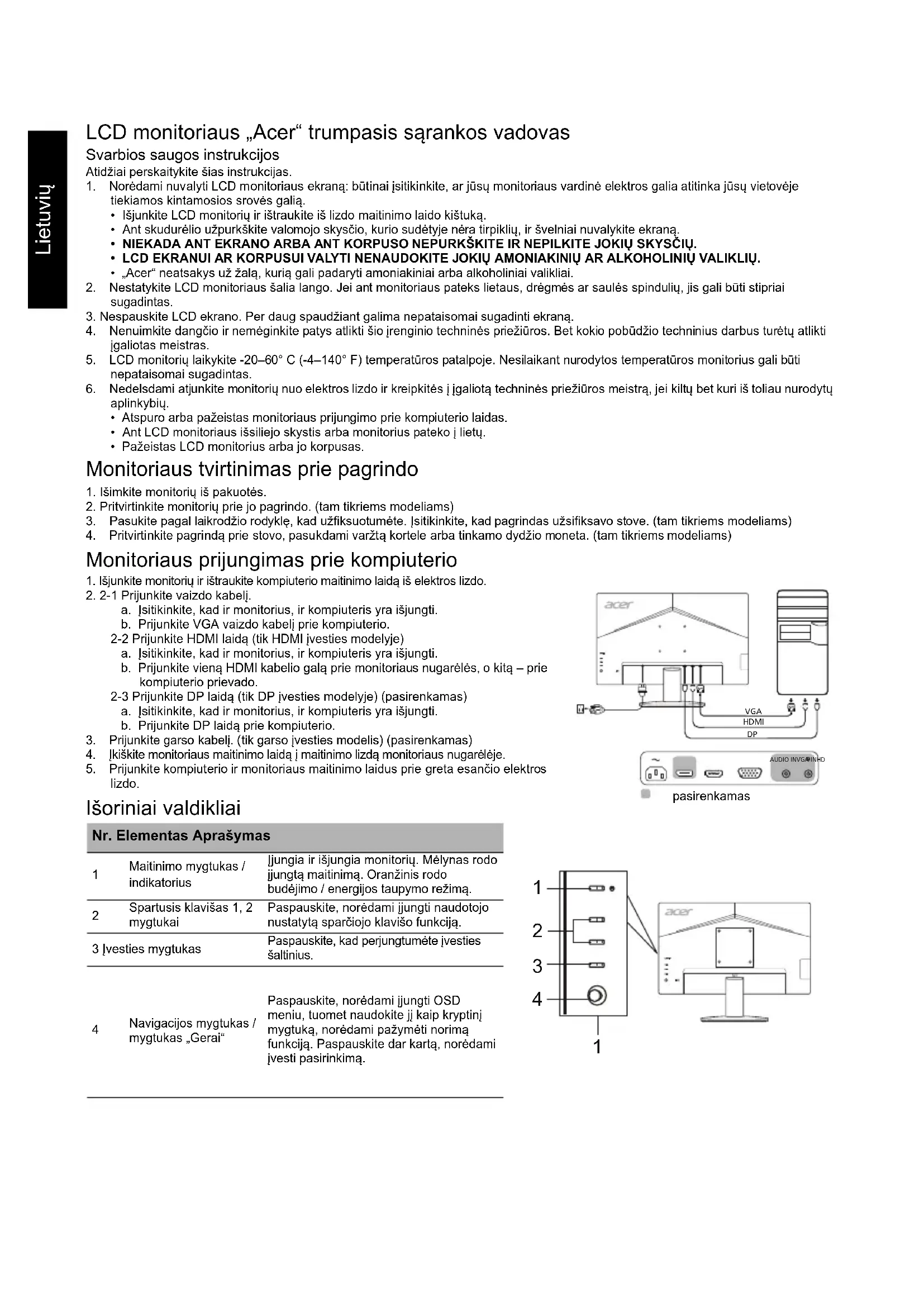 - Energijos sąnaudos per metus 31 (kWh) (HDMI įvesties modeliui) Energijos sąnaudos (esant 200 nitų) Įjungimo režimu 20 W (įprastos) Miego režimu 0,5 W (įprastos) Išjungimo režimu 0,5 W (įprastos) Įvesties jungtis D-Sub HDMI (tik HDMI įvesties modelyje) DP (tik DP įvesties modelis) (pasirenkamas) Vaizdo įvesties signalas Analoginis: 0,7 Vp-p (standartinis), 75 OHM, teigiamas HDMI (tik HDMI įvesties modelyje) (pasirenkamas) DP (tik DP įvesties modelis) (pasirenkamas) Garsiakalbiai 2 W x 2 (tik garso įvesties modelis) (pasirenkamas) Didžiausias ekrano dydis Horizontaliai: 597,88 mm Vertikaliai: 336,31 mm Maitinimo šaltinis: 100–240 V, 50/60 Hz Aplinkos sąlygos Naudojimo temperatūra: 0–40° C Saugojimo temperatūra: -20–60° C Naudojimo drėgmė: 20–80 % Matmenys 612,3 (P) x 453,02 (A) x 200,05 (G) mm Svoris (grynasis) 5,38 kg (grynasis) Mechanizmų techniniai duomenys Pakreipimas: nuo -5° iki +15° Pasukimas: nėra Aukščio reguliavimas: nėra Sukimosi ašis: nėra Atkabinamas kojos stovas: taip Išoriniai valdikliai Jungikliai / mygtukai Maitinimo mygtukas Spartusis klavišas 1 Spartusis klavišas 2 Įvestis Meniu/Navigacija/Gerai Funkcijos Ryškumas Kontrastas Mėlyna šviesa Juodos spavos akcentavimas ACM Ypatingas ryškumas Horizontalioji padėtis (tik analoginės įvesties modelyje) Vertikalioji padėtis (tik analoginės įvesties modelyje) Laikrodis (tik analoginės įvesties modelyje) Fokusavimas (tik analoginės įvesties modelyje) Automatinis konfigūravimas (tik analoginės įvesties modelyje) Gama Spalvinė temperatūra Režimai Režimas sRGB Pilkumo tonų režimas 6 ašių atspalvis 6 ašių grynis Garsumas Nutildyti Greitinimas FreeSync Atnaujinimo dažnis VRB Kalba Ekrano rodinio skirtasis laikas Skaidrumas OSD užraktas Įvestis Automatinis šaltinis Sparčiojo klavišo priskyrimas Platusis režimas DDC/CI HDMI juodų atspalvių lygis Greitojo paleidimo režimas Ekrano informacija Nustatyti visas nuostatas iš naujo Išeiti Specifikacijos priklauso nuo modelio ir (arba) regiono.Latviski Acer LCD monitora īsā darba sākšanas rokasgrāmata Svarīgas drošības instrukcijas Lūdzu, uzmanīgi izlasiet tālāk sniegtās instrukcijas. 1. LCD monitora ekrāna tīrīšana. Pārbaudiet, vai monitora elektriskais spriegums ir piemērots ierīces izmantošanai ar jūsu atrašanās vietā esošo maiņstrāvu.• Izslēdziet LCD monitoru un atvienojiet strāvas vadu.