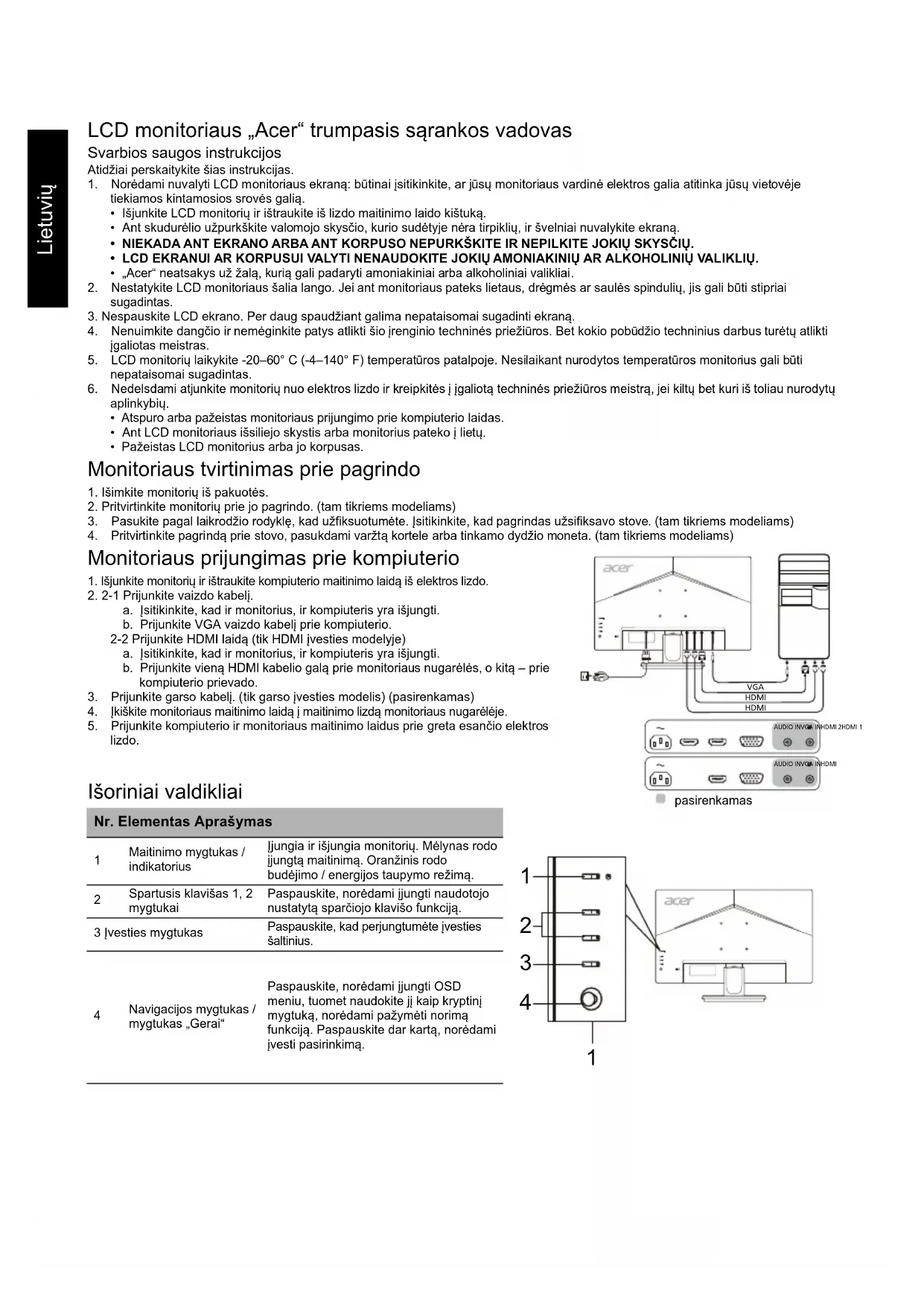 (įprastas) Kontrastas 100000000:1 maks. (ACM) Regimasis kampas 178° (H) 178° (V) (CR=10) Atsako trukmė 1 ms (VRB) Vaizdas R, G, B analoginė sąsaja Plokštės tipas VA Horizontalusis dažnis 30–85 kHz Vertikalusis dažnis 56–76 Hz Ekrano spalvos 16,7 milijonų Taškų dažnis 174,5 MHz Didžiausia skiriamoji geba VGA: 1920 x 1080 esant 75 Hz HDMI: 1920 x 1080 esant 75 Hz Funkcija „Plug & Play“ VESA DDCCI/DDC2B Energijos sąnaudos (esant 200 nitų) Įjungimo režimu 26 W Miego režimu 0,5 W Išjungimo režimu 0,3 W Įvesties jungtis D-Sub HDMI (tik HDMI įvesties modelyje) Vaizdo įvesties signalas Analoginis: 0,7 Vp-p (standartinis), 75 OHM, teigiamas HDMI (tik HDMI įvesties modelyje) (pasirenkamas) Garsiakalbiai 2 W x 2 (tik garso įvesties modelis) (pasirenkamas) Didžiausias ekrano dydis Horizontaliai: 597,6 mm Vertikaliai: 336,1 mm Maitinimo šaltinis: 100–240 V, 50/60 Hz Aplinkos sąlygos Naudojimo temperatūra: 0–40° C Saugojimo temperatūra: -20–60° C Naudojimo drėgmė: 20–80 % Matmenys 614,3 (P) x 440,62 (A) x 248,98 (G) mm Svoris (grynasis) 5,4 kg (grynasis) Mechanizmų techniniai duomenys Pakreipimas: nuo -5° iki +20° Pasukimas: nėra Aukščio reguliavimas: nėra Sukimosi ašis: nėra Atkabinamas kojos stovas: taip Išoriniai valdikliai Jungikliai / mygtukai Maitinimo mygtukas Spartusis klavišas 1 Spartusis klavišas 2 Įvestis Meniu/Navigacija/Gerai Funkcijos Ryškumas Kontrastas Mėlyna šviesa Juodos spavos akcentavimas ACM Ypatingas ryškumas Horizontalioji padėtis (tik analoginės įvesties modelyje) Vertikalioji padėtis (tik analoginės įvesties modelyje) Laikrodis (tik analoginės įvesties modelyje) Fokusavimas (tik analoginės įvesties modelyje) Automatinis konfigūravimas (tik analoginės įvesties modelyje) Gama Spalvinė temperatūra Režimai Režimas sRGB Pilkumo tonų režimas 6 ašių atspalvis 6 ašių grynis Garsumas Nutildyti Greitinimas FreeSync Atnaujinimo dažnis VRB Kalba Ekrano rodinio skirtasis laikas Skaidrumas OSD užraktas Įvestis Automatinis šaltinis Sparčiojo klavišo priskyrimas Platusis režimas DDC/CI HDMI juodų atspalvių lygis Greitojo paleidimo režimas Ekrano informacija Nustatyti visas nuostatas iš naujo Išeiti Specifikacijos priklauso nuo modelio ir (arba) regiono.Latviski Acer LCD monitora īsā darba sākšanas rokasgrāmata Svarīgas drošības instrukcijas Lūdzu, uzmanīgi izlasiet tālāk sniegtās instrukcijas. 1. LCD monitora ekrāna tīrīšana. Pārbaudiet, vai monitora elektriskais spriegums ir piemērots ierīces izmantošanai ar jūsu atrašanās vietā esošo maiņstrāvu.• Izslēdziet LCD monitoru un atvienojiet strāvas vadu.
