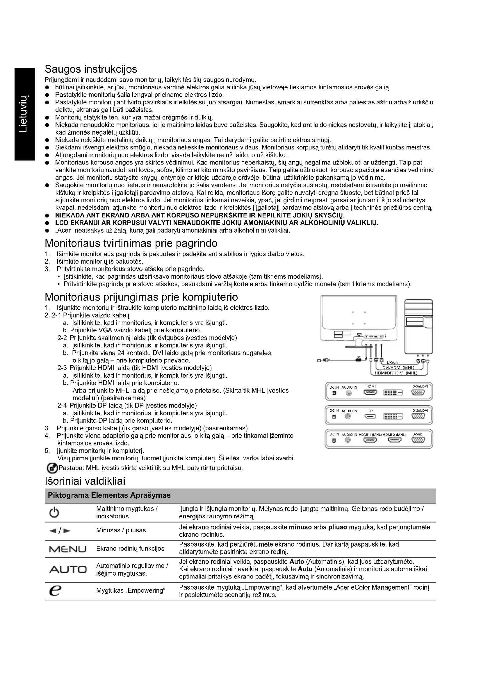 Visų pirma įjunkite monitorių, tuomet įjunkite kompiuterį. Ši eilės tvarka labai svarbi. Pastaba: MHL įvestis skirta veikti tik su MHL patvirtintu prietaisu. Išoriniai valdikliai Piktograma Elementas Aprašymas Maitinimo mygtukas / indikatorius Įjungia ir išjungia monitorių. Mėlynas rodo įjungtą maitinimą. Geltonas rodo budėjimo / energijos taupymo režimą. Minusas / pliusas Jei ekrano rodiniai veikia, paspauskite minuso arba pliuso mygtuką, kad perjungtumėte ekrano rodinius. Ekrano rodinių funkcijos Paspauskite, kad peržiūrėtumėte ekrano rodinius. Dar kartą paspauskite, kad atidarytumėte pasirinktą ekrano rodinį. Automatinio reguliavimo / išėjimo mygtukas. Jei ekrano rodiniai veikia, paspauskite Auto (Automatinis), kad juos uždarytumėte. Kai ekrano rodiniai neveikia, paspauskite Auto (Automatinis) ir monitorius automatiškai optimaliai pritaikys ekrano padėtį, fokusavimą ir sinchronizavimą. Mygtukas „Empowering“ Paspauskite mygtuką „Empowering“, kad atvertumėte „Acer eColor Management“ rodinį ir pasiektumėte scenarijų režimus.