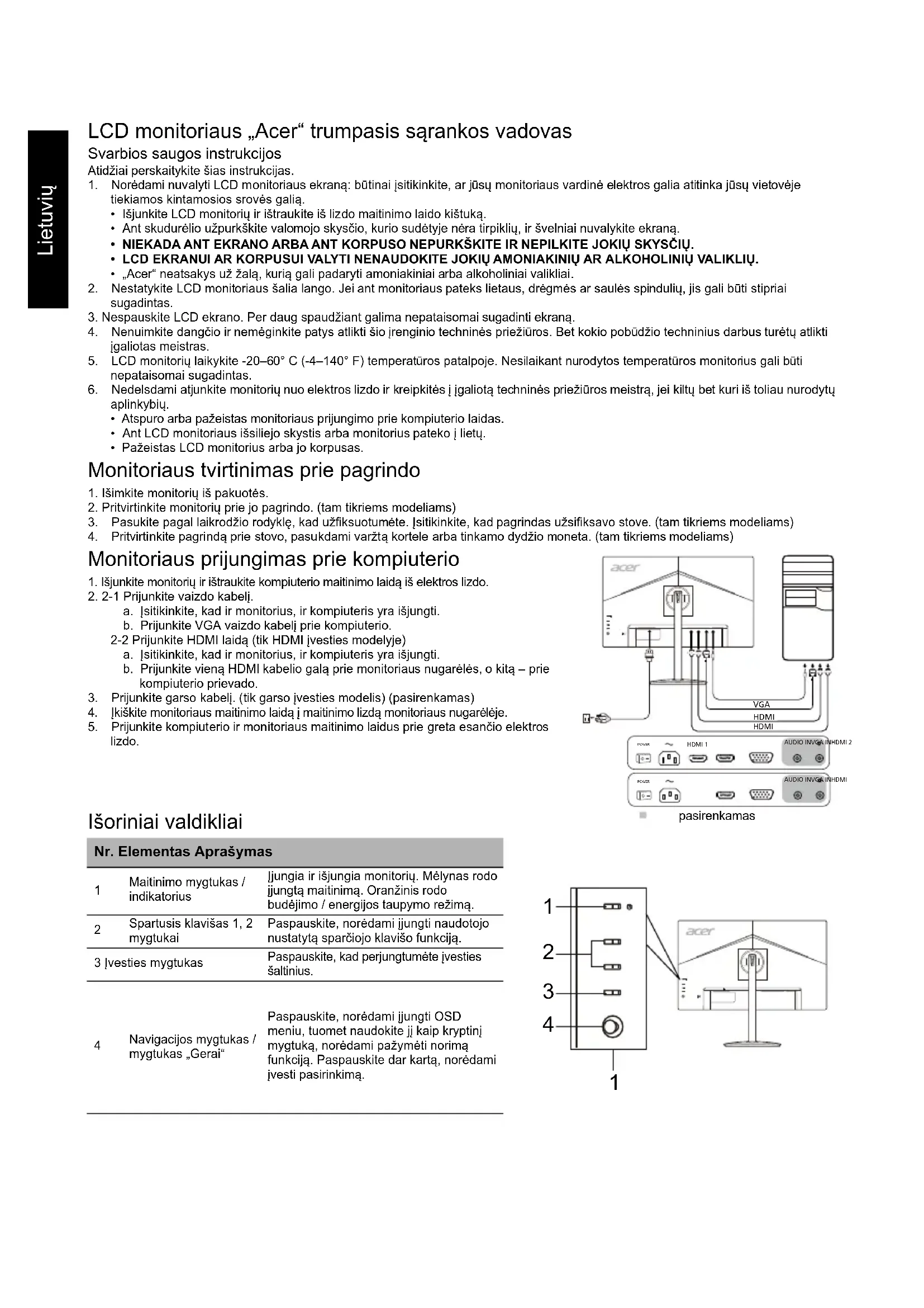(įprastas) Kontrastas 100000000:1 maks. (ACM) Regimasis kampas 178° (H) 178° (V) (CR=10) Atsako trukmė 1 ms (VRB) Vaizdas R, G, B analoginė sąsaja Plokštės tipas VA Horizontalusis dažnis 30–85 kHz Vertikalusis dažnis 56–76 Hz Ekrano spalvos 16,7 milijonų Taškų dažnis VGA: 174,5 MHz HDMI: 174,5 MHz Didžiausia skiriamoji geba VGA: 1920 x 1080 esant 75 Hz HDMI: 1920 x 1080 esant 75 Hz Funkcija „Plug & Play“ VESA DDCCI/DDC2B Energijos sąnaudos (esant 200 nitų) Įjungimo režimu 22 W Miego režimu 0,5 W Išjungimo režimu 0,3 W Įvesties jungtis D-Sub HDMI (tik HDMI įvesties modelyje) Vaizdo įvesties signalas Analoginis: 0,7 Vp-p (standartinis), 75 OHM, teigiamas HDMI (tik HDMI įvesties modelyje) (pasirenkamas) Garsiakalbiai 2 W x 2 (tik garso įvesties modelis) (pasirenkamas) Didžiausias ekrano dydis Horizontaliai: 527,04 mm Vertikaliai: 296,46 mm Maitinimo šaltinis: 100–240 V, 50/60 Hz Aplinkos sąlygos Naudojimo temperatūra: 0–40° C Saugojimo temperatūra: -20–60° C Naudojimo drėgmė: 20–80 % Matmenys 540,2 (P) x 377,71 ~ 497,71 (A) x 233,65 (G) mm Svoris (grynasis) 4,91 kg (grynasis) Mechanizmų techniniai duomenys Pakreipimas: nuo -5° iki +20° (tik aukščiausiame pakėlimo taške galima pakreipti 20 laipsnių kampu) Pasukimas: 360° Aukščio reguliavimas: nuo 0 iki 120 mm Sukimosi ašis: nuo -90° iki +90° Atkabinamas kojos stovas: taip Išoriniai valdikliai Jungikliai / mygtukai Maitinimo mygtukas Spartusis klavišas 1 Spartusis klavišas 2 Įvestis Meniu/Navigacija/Gerai Funkcijos Ryškumas Kontrastas Mėlyna šviesa Juodos spavos akcentavimas ACM Ypatingas ryškumas Horizontalioji padėtis (tik analoginės įvesties modelyje) Vertikalioji padėtis (tik analoginės įvesties modelyje) Laikrodis (tik analoginės įvesties modelyje) Fokusavimas (tik analoginės įvesties modelyje) Automatinis konfigūravimas (tik analoginės įvesties modelyje) Gama Spalvinė temperatūra Režimai Režimas sRGB Pilkumo tonų režimas 6 ašių atspalvis 6 ašių grynis Garsumas Nutildyti Greitinimas FreeSync Atnaujinimo dažnis VRB Kalba Ekrano rodinio skirtasis laikas Skaidrumas OSD užraktas Įvestis Automatinis šaltinis Sparčiojo klavišo priskyrimas Platusis režimas DDC/CI HDMI juodų atspalvių lygis Greitojo paleidimo režimas Ekrano informacija Nustatyti visas nuostatas iš naujo Išeiti Specifikacijos priklauso nuo modelio ir (arba) regiono.Latviski Acer LCD monitora īsā darba sākšanas rokasgrāmata Svarīgas drošības instrukcijas Lūdzu, uzmanīgi izlasiet tālāk sniegtās instrukcijas. 1. LCD monitora ekrāna tīrīšana. Pārbaudiet, vai monitora elektriskais spriegums ir piemērots ierīces izmantošanai ar jūsu atrašanās vietā esošo maiņstrāvu.• Izslēdziet LCD monitoru un atvienojiet strāvas vadu.