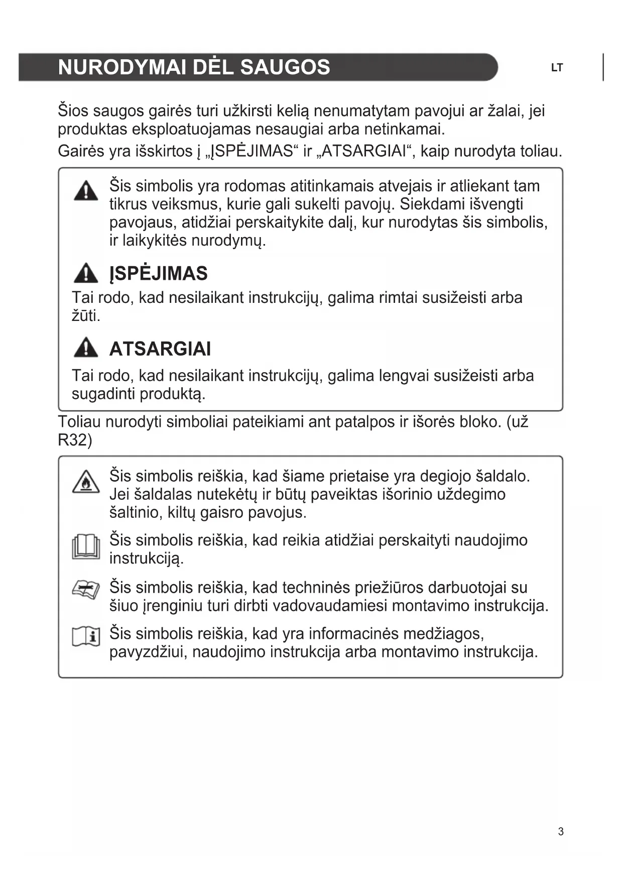 Šios saugos gairės turi užkirsti kelią nenumatytam pavojui ar žalai, jei produktas eksploatuojamas nesaugiai arba netinkamai. Gairės yra išskirtos į „ĮSPĖJIMAS“ ir „ATSARGIAI“, kaip nurodyta toliau. Šis simbolis yra rodomas atitinkamais atvejais ir atliekant tam tikrus veiksmus, kurie gali sukelti pavojų. Siekdami išvengti pavojaus, atidžiai perskaitykite dalį, kur nurodytas šis simbolis, ir laikykitės nurodymų. ĮSPĖJIMAS Tai rodo, kad nesilaikant instrukcijų, galima rimtai susižeisti arba žūti. ATSARGIAI Tai rodo, kad nesilaikant instrukcijų, galima lengvai susižeisti arba sugadinti produktą. Toliau nurodyti simboliai pateikiami ant patalpos ir išorės bloko. (už R32) Šis simbolis reiškia, kad šiame prietaise yra degiojo šaldalo. Jei šaldalas nutekėtų ir būtų paveiktas išorinio uždegimo šaltinio, kiltų gaisro pavojus. Šis simbolis reiškia, kad reikia atidžiai perskaityti naudojimo instrukciją. Šis simbolis reiškia, kad techninės priežiūros darbuotojai su šiuo įrenginiu turi dirbti vadovaudamiesi montavimo instrukcija. Šis simbolis reiškia, kad yra informacinės medžiagos, pavyzdžiui, naudojimo instrukcija arba montavimo instrukcija.4