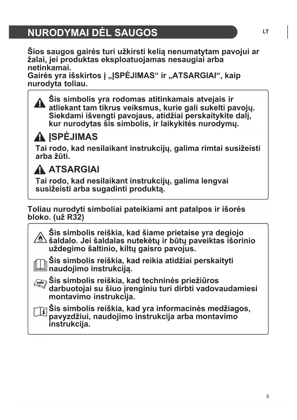 Šios saugos gairės turi užkirsti kelią nenumatytam pavojui ar žalai, jei produktas eksploatuojamas nesaugiai arba netinkamai. Gairės yra išskirtos į „ĮSPĖJIMAS“ ir „ATSARGIAI“, kaip nurodyta toliau. Šis simbolis yra rodomas atitinkamais atvejais ir atliekant tam tikrus veiksmus, kurie gali sukelti pavojų. Siekdami išvengti pavojaus, atidžiai perskaitykite dalį, kur nurodytas šis simbolis, ir laikykitės nurodymų. ĮSPĖJIMAS Tai rodo, kad nesilaikant instrukcijų, galima rimtai susižeisti arba žūti. ATSARGIAI Tai rodo, kad nesilaikant instrukcijų, galima lengvai susižeisti arba sugadinti produktą. Toliau nurodyti simboliai pateikiami ant patalpos ir išorės bloko. (už R32) Šis simbolis reiškia, kad šiame prietaise yra degiojo šaldalo. Jei šaldalas nutekėtų ir būtų paveiktas išorinio uždegimo šaltinio, kiltų gaisro pavojus. Šis simbolis reiškia, kad reikia atidžiai perskaityti naudojimo instrukciją. Šis simbolis reiškia, kad techninės priežiūros darbuotojai su šiuo įrenginiu turi dirbti vadovaudamiesi montavimo instrukcija. Šis simbolis reiškia, kad yra informacinės medžiagos, pavyzdžiui, naudojimo instrukcija arba montavimo instrukcija.4