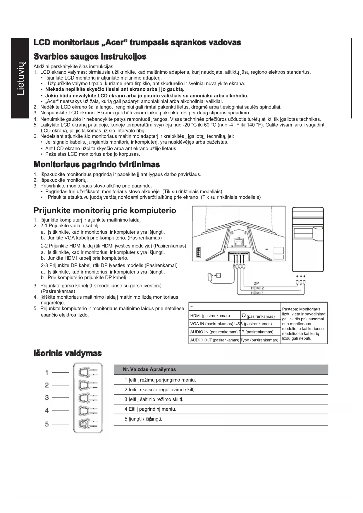 Pastaba: Monitoriaus lizdų vieta ir pavadinimai gali skirtis priklausomai nuo monitoriaus modelio, o kai kuriuose modeliuose kai kurių lizdų gali nebūti. HDMI (pasirenkamas) (pasirenkamas) VGA IN (pasirenkamas) USB (pasirenkamas) AUDIO IN (pasirenkamas) DP (pasirenkamas) AUDIO OUT (pasirenkamas) Type (pasirenkamas) Išorinis valdymas Nr. Vaizdas Aprašymas 1 Įeiti į režimų perjungimo meniu. 2 Įeiti į skaisčio reguliavimo skiltį. 3 Įeiti į šaltinio režimo skiltį. 4 Eiti į pagrindinį meniu. 5 Įjungti / išjungti.Lietuvių Reglamentinės ir saugos nuostatos FCC nuostata Ši įranga buvo išbandyta, kas leido nustatyti, kad pagal FCC taisyklių 15 dalį ji atitinka B klasės skaitmeninio įrenginio ribines vertes. Šie apribojimai sukurti siekiant užtikrinti priimtiną apsaugą nuo žalingų trikdžių, kai įranga sumontuojama gyvenamojoje vietoje. Ši įranga kuria, naudoja ir gali skleisti energiją radijo dažniais, o jei ji nėra sumontuota ir naudojama pagal instrukcijas, gali trukdyti radijo ryšio komunikacijoms. Visgi nėra garantijos, kad trukdžių nebus konkrečiu montavimo atveju. Jei įrenginys trukdo radijo ir televizijos perdavimui (tai galima nustatyti perjungimo įtaisu), rekomenduojama, kad naudotojas imtųsi vieno arba kelių iš šių veiksmų norėdamas trukdžius pašalinti: