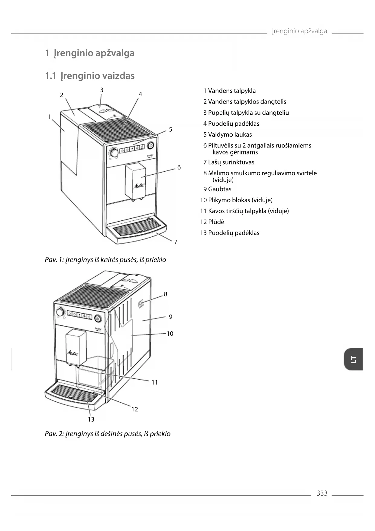 Pav. 2: Įrenginys iš dešinės pusės, iš priekio 1 Vandens talpykla 2 Vandens talpyklos dangtelis 3 Pupelių talpykla su dangteliu 4 Puodelių padėklas 5 Valdymo laukas 6 Piltuvėlis su 2 antgaliais ruošiamiems kavos gėrimams 7 Lašų surinktuvas 8 Malimo smulkumo reguliavimo svirtelė (viduje) 9 Gaubtas 10 Plikymo blokas (viduje) 11 Kavos tirščių talpykla (viduje) 12 Plūdė 13 Puodelių padėklasĮrenginio apžvalga