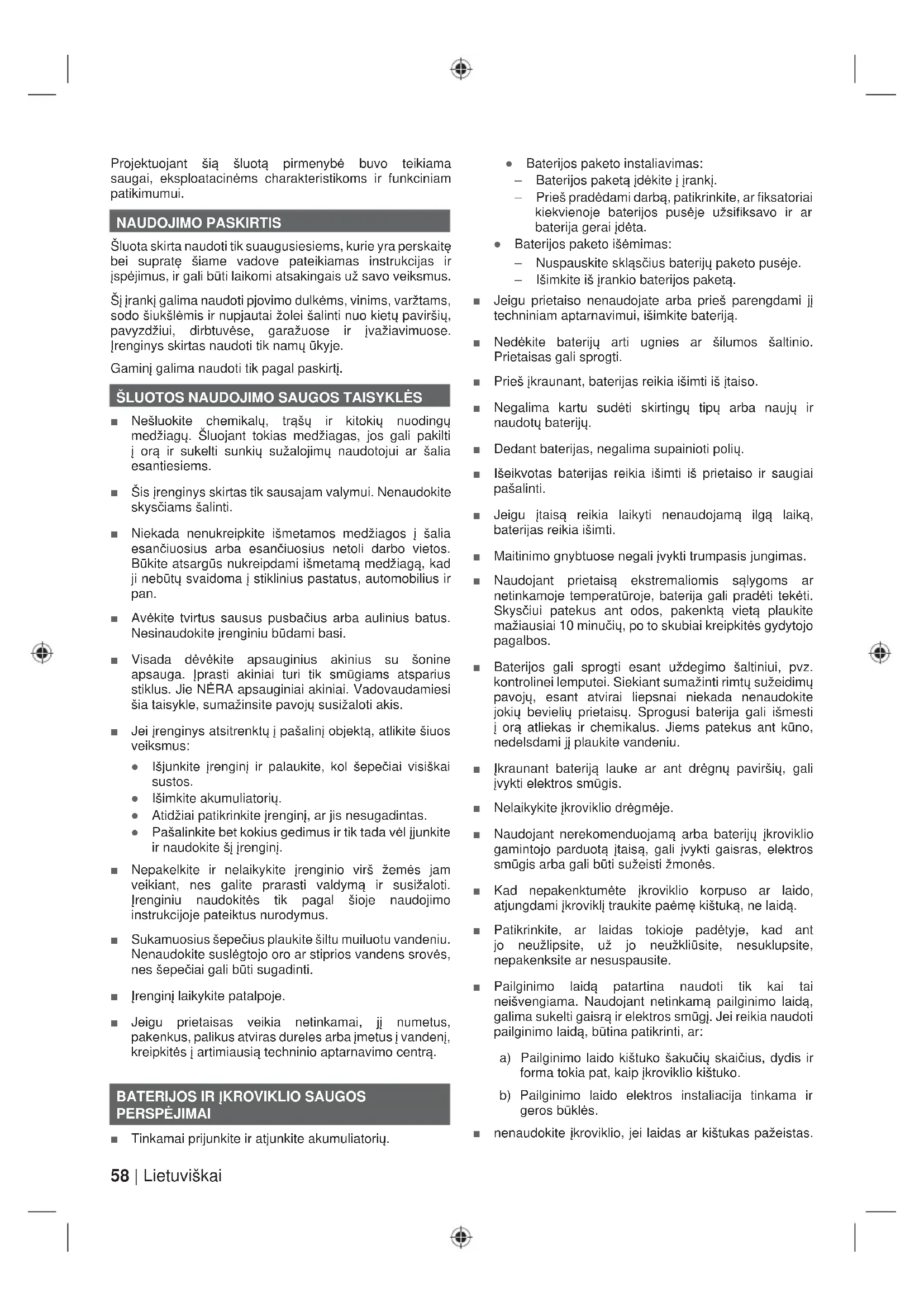 PERSPƠJIMAI Ŷ Tinkamai prijunkite ir atjunkite akumuliatoriǐ. Ɣ Baterijos paketo instaliavimas: – Baterijos paketą Ƴdơkite Ƴ ƳrankƳ. – Prieš pradơdami darbą, patikrinkite, ar fiksatoriai kiekvienoje baterijos pusơje užsifiksavo ir ar baterija gerai Ƴdơta. Ɣ Baterijos paketo išơmimas: – Nuspauskite skląsþius baterijǐ paketo pusơje. – Išimkite iš Ƴrankio baterijos paketą. Ŷ Jeigu prietaiso nenaudojate arba prieš parengdami jƳ techniniam aptarnavimui, išimkite bateriją. Ŷ Nedơkite baterijǐ arti ugnies ar šilumos šaltinio. Prietaisas gali sprogti. Ŷ Prieš Ƴkraunant, baterijas reikia išimti iš Ƴtaiso. Ŷ Negalima kartu sudơti skirtingǐ tipǐ arba naujǐ ir naudotǐ baterijǐ. Ŷ Dedant baterijas, negalima supainioti poliǐ. Ŷ Išeikvotas baterijas reikia išimti iš prietaiso ir saugiai pašalinti. Ŷ Jeigu Ƴtaisą reikia laikyti nenaudojamą ilgą laiką, baterijas reikia išimti. Ŷ Maitinimo gnybtuose negali Ƴvykti trumpasis jungimas. Ŷ Naudojant prietaisą ekstremaliomis sąlygoms ar netinkamoje temperatnjroje, baterija gali pradơti tekơti. Skysþiui patekus ant odos, pakenktą vietą plaukite mažiausiai 10 minuþiǐ, po to skubiai kreipkitơs gydytojo pagalbos. Ŷ Baterijos gali sprogti esant uždegimo šaltiniui, pvz. kontrolinei lemputei. Siekiant sumažinti rimtǐ sužeidimǐ pavojǐ, esant atvirai liepsnai niekada nenaudokite jokiǐ bevieliǐ prietaisǐ. Sprogusi baterija gali išmesti Ƴ orą atliekas ir chemikalus. Jiems patekus ant knjno, nedelsdami jƳ plaukite vandeniu. Ŷ Ʋkraunant bateriją lauke ar ant drơgnǐ paviršiǐ, gali Ƴvykti elektros smnjgis. Ŷ Nelaikykite Ƴkroviklio drơgmơje. Ŷ Naudojant nerekomenduojamą arba baterijǐ Ƴkroviklio gamintojo parduotą Ƴtaisą, gali Ƴvykti gaisras, elektros smnjgis arba gali bnjti sužeisti žmonơs. Ŷ Kad nepakenktumơte Ƴkroviklio korpuso ar laido, atjungdami ƳkroviklƳ traukite paơmĊ kištuką, ne laidą. Ŷ Patikrinkite, ar laidas tokioje padơtyje, kad ant jo neužlipsite, už jo neužklinjsite, nesuklupsite, nepakenksite ar nesuspausite. Ŷ Pailginimo laidą patartina naudoti tik kai tai neišvengiama. Naudojant netinkamą pailginimo laidą, galima sukelti gaisrą ir elektros smnjgƳ. Jei reikia naudoti pailginimo laidą, bnjtina patikrinti, ar: a) Pailginimo laido kištuko šakuþiǐ skaiþius, dydis ir forma tokia pat, kaip Ƴkroviklio kištuko. b) Pailginimo laido elektros instaliacija tinkama ir geros bnjklơs. Ŷ nenaudokite Ƴkroviklio, jei laidas ar kištukas pažeistas. 58 | LietuviškaiPažeistą laidą ar kištuką privalo nedelsiant pataisyti kvalifikuotas technikas. Ŷ Nenaudokite Ƴkroviklio, jeigu jis perdegĊs, buvo numestas ar kitaip pakenktas; duokite jƳ pataisyti kvalifikuotam technikui. Ŷ Neardykite Ƴkroviklio; prireikus, duokite jƳ apžinjrơti ar pataisyti kvalifikuotam technikui. Netinkamai surinkus išardytą ƳkroviklƳ, galima sukelti elektros smnjgƳ arba gaisrą. Ŷ Kad sumažintumơte elektros smnjgio pavojǐ, prieš pradơdami priežinjros ar valymo darbus, išjunkite ƳkroviklƳ iš išvado. Ʋjungus valdiklƳ, šƳ pavojǐ galima sumažinti. Ŷ Nenaudojamą ƳkroviklƳ reikia atjungti iš maitinimo. Ŷ Elektros smnjgio pavojus. Nelieskite neizoliuotos išvado jungties ar baterijos gnybtǐ.