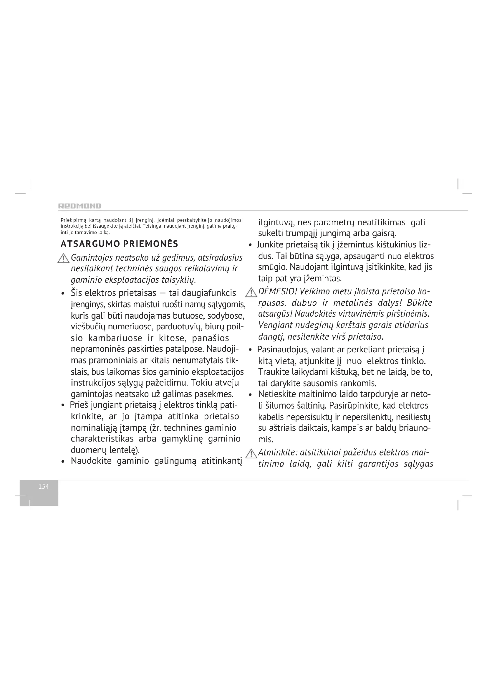 Šis elektros prietaisas — tai daugiafunkcis įrenginys, skirtas maistui ruošti namų sąlygomis, kuris gali būti naudojamas butuose, sodybose, viešbučių numeriuose, parduotuvių, biurų poil- sio kambariuose ir kitose, panašios nepramoninės paskirties patalpose. Naudoji- mas pramoniniais ar kitais nenumatytais tik- slais, bus laikomas šios gaminio eksploatacijos instrukcijos sąlygų pažeidimu. Tokiu atveju gamintojas neatsako už galimas pasekmes.