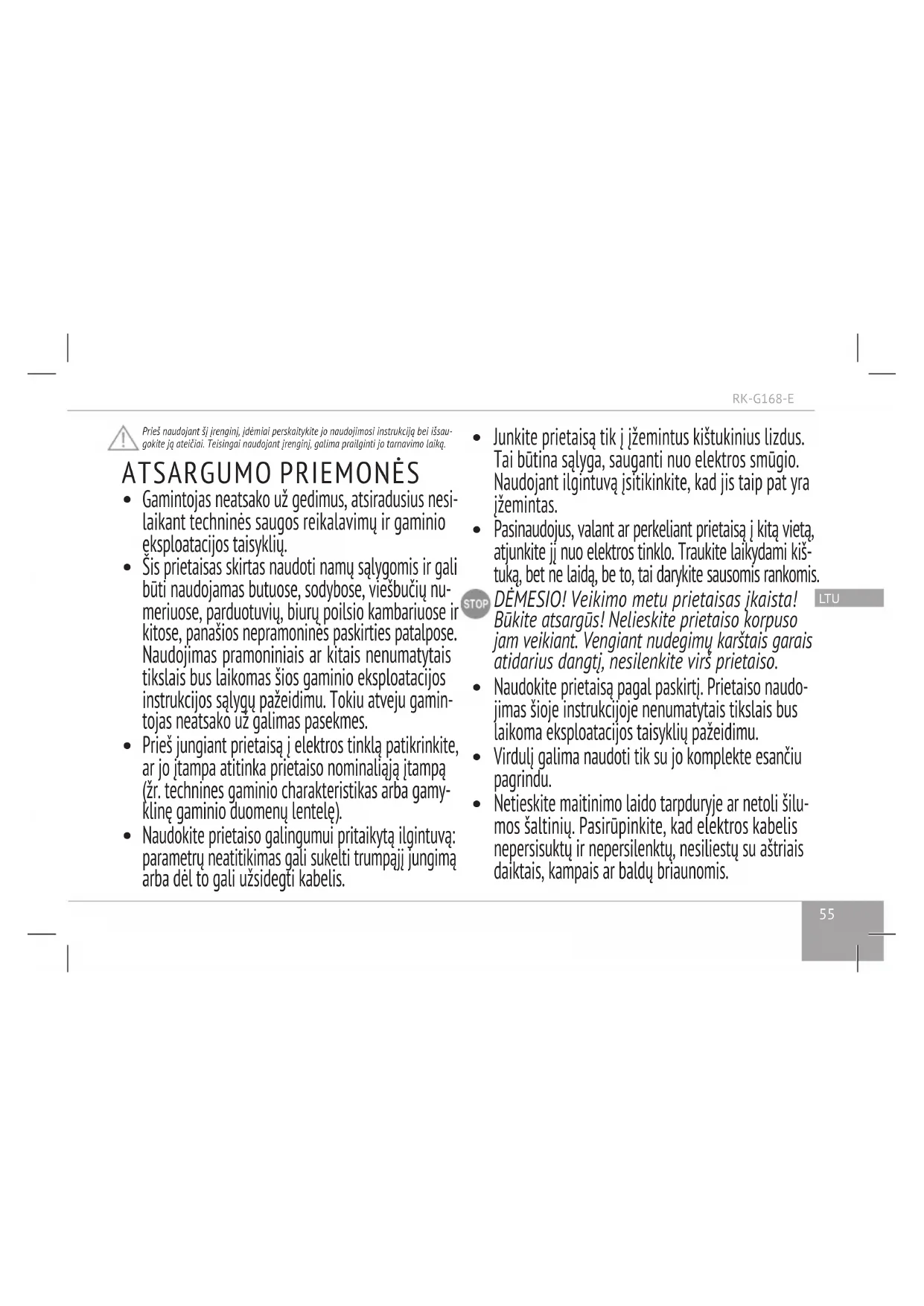 Šiam gaminiui teikiama 2 metai garantija nuo pirkimo datos. Garantiniu laikotaroiu gamin- tojas įsipareigoja taisymo, detalių keitimo arba viso gaminio keitimo būdu pašalinti bet kokius gamybos defektus, atsiradusius dėl nepakankamos medžiagų ar surinkimo kokybės. Garan- tija įsigalioja tik tuo atveju, jeigu pirkimo data patvirtinta parduotuvės antspaudu ir parda- vėjo parašu originaliame garantojos talone. Ši garantija pripažįstama tik tuo atveju, jeigu gaminys buvo naudojamas pagal eksploatavimo instrukciją, nebuvo remontuotas, išardytas ir nebuvo pažeistas dėl netinkamo naudojimo, taip patišsaugotas pilnas gaminio komplektas. Ši garantija netaikoma natūraliam gaminio susidėvėjimui ir naudojamoms medžiagoms (ltrams, lemputėms, keraminėms ir teoninėms dangoms, sandarinimo gumoms ir kt.). Gaminio veikimo trukmė ir garantinių įsipareigojimų terminas skaičiuojami nuo parda- vimo dienos arba nuo gaminio pagaminimo datos (tuo atveju, kai pardavimo datos negalima nustatyti). Prietaiso pagaminimo datą rasite serijos numeryje, kuris nurodytas identikaciniame lipduke ant gaminio korpuso. Serijos numeris yra iš 13 ženklų. 6-asis ir 7-asis ženklas reiškia mėnesį, 8-asis – įrenginio pagaminimo metus. Nustatytas gaminio eksploatavimo terminas yra 3 metai nuo jo įsigijimo datos su sąly- ga, kad gaminys eksploatuojamas vadovaujantis šia instrukcija ir techniniais standartais. Ekologiškai nekenksminga utilizacija (elektroninės ir elektros įrangos utilizacija) Pakuotė, naudojimosi instrukcija ir pats prietaisas utilizuojami laikantis ati- tinkamų vietos antrinių žaliavų perdirbimo programų. Pasirūpinkite aplinko- sauga: neišmeskite tokių gaminių kartu su įprastinėmis buitinėmis atliekomis. Negalima išmesti panaudotos (senos) įrangos kartu su buitinėmis atliekomis. Juos reikia išmesti atskirai. Senos įrangos savininkai privalo atnešti nebe- naudojamus prietaisus į specialius surinkimo punktus arba priduoti atitinkamoms or- ganizacijoms. Tokiu būdu jūs prisidėsite prie vertingos žaliavos perdirbimo ir valymo nuo kenksmingų medžiagų programos. Šis prietaisas pažymėtas pagal Europos direktyvos 2012/19/ES, reguliuojančios elektros ir elektronikos įrangos utilizavimą, reikalavimus. Ši direktyva nustato pagrindinius elektros ir elektronikos prietaisų atliekų utilizacijos ir perdirbimo reikalavimus, galiojančius visoje Europos Sąjungos teritorijoje.RK-G168-E