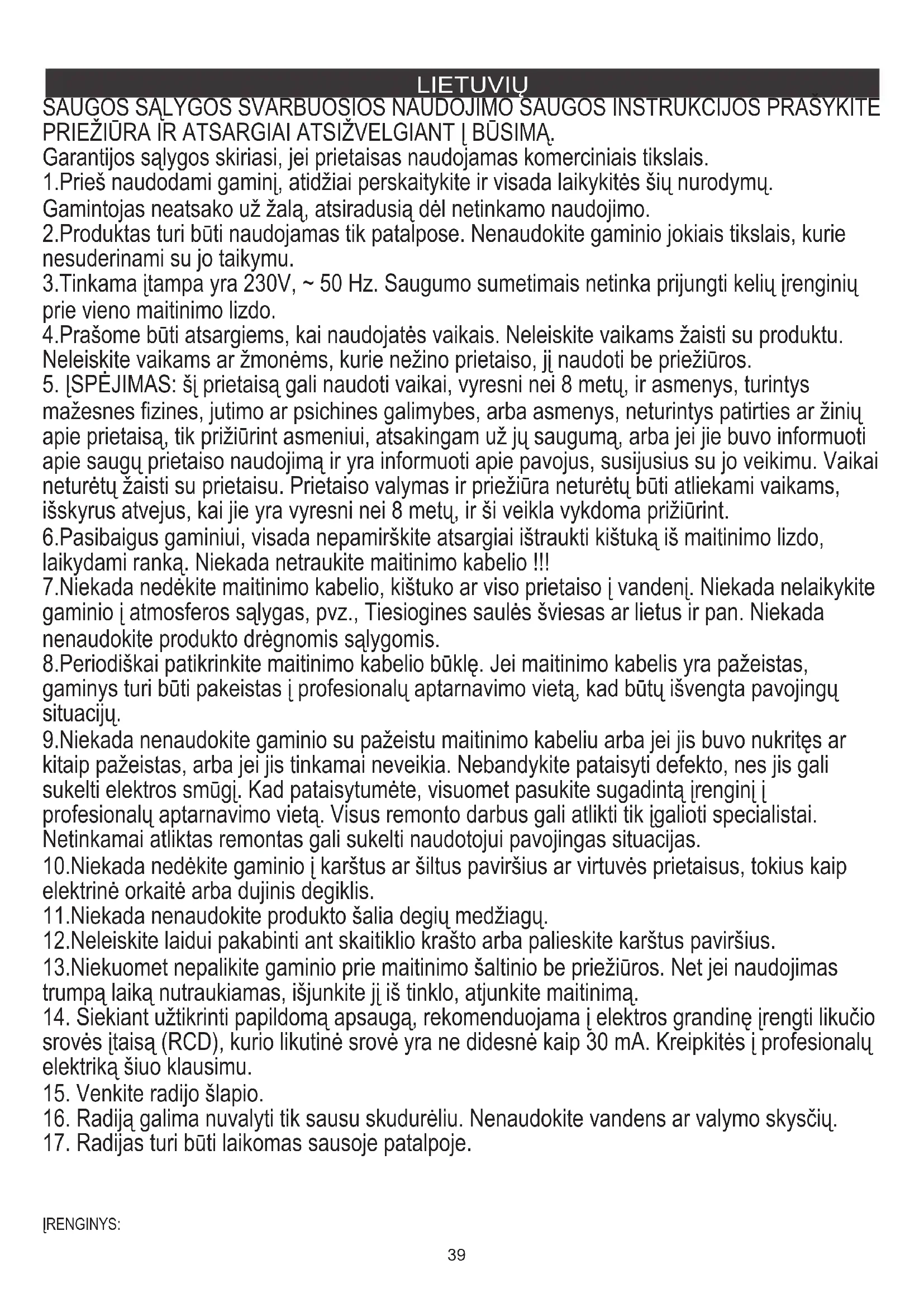 17. Radijas turi būti laikomas sausoje patalpoje.