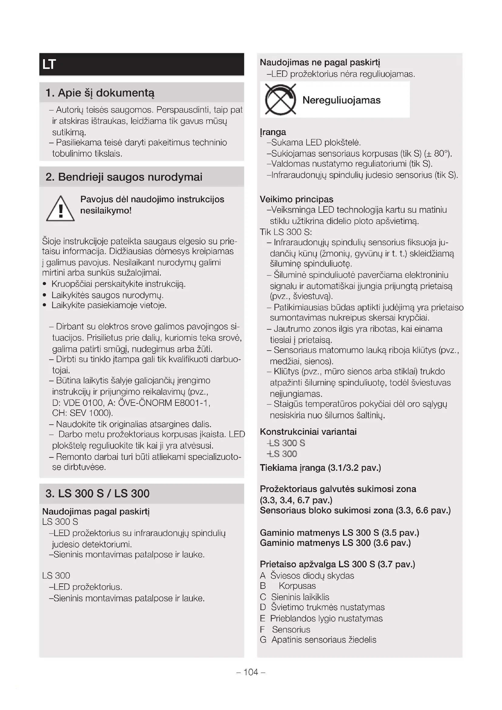 Tiekiama įranga (3.1/3.2 pav.) Prožektoriaus galvutės sukimosi zona (3.3, 3.4, 6.7 pav.) Sensoriaus bloko sukimosi zona (3.3, 6.6 pav.) Gaminio matmenys LS300S (3.5 pav.) Gaminio matmenys LS300 (3.6 pav.) Prietaiso apžvalga LS 300 S (3.7 pav.) A Šviesos diodų skydas B Korpusas C Sieninis laikiklis D Švietimo trukmės nustatymas E Prieblandos lygio nustatymas F Sensorius G Apatinis sensoriaus žiedelis – 104 –LT Prietaiso apžvalga LS 300 S (3.8 pav.) A Šviesos diodų skydas B Korpusas C Sieninis laikiklis Techniniai duomenys – Matmenys (A x P x G): LS 300 S: 241×213×186mm LS 300: 218×213×184mm – Galios suvartojimas („P