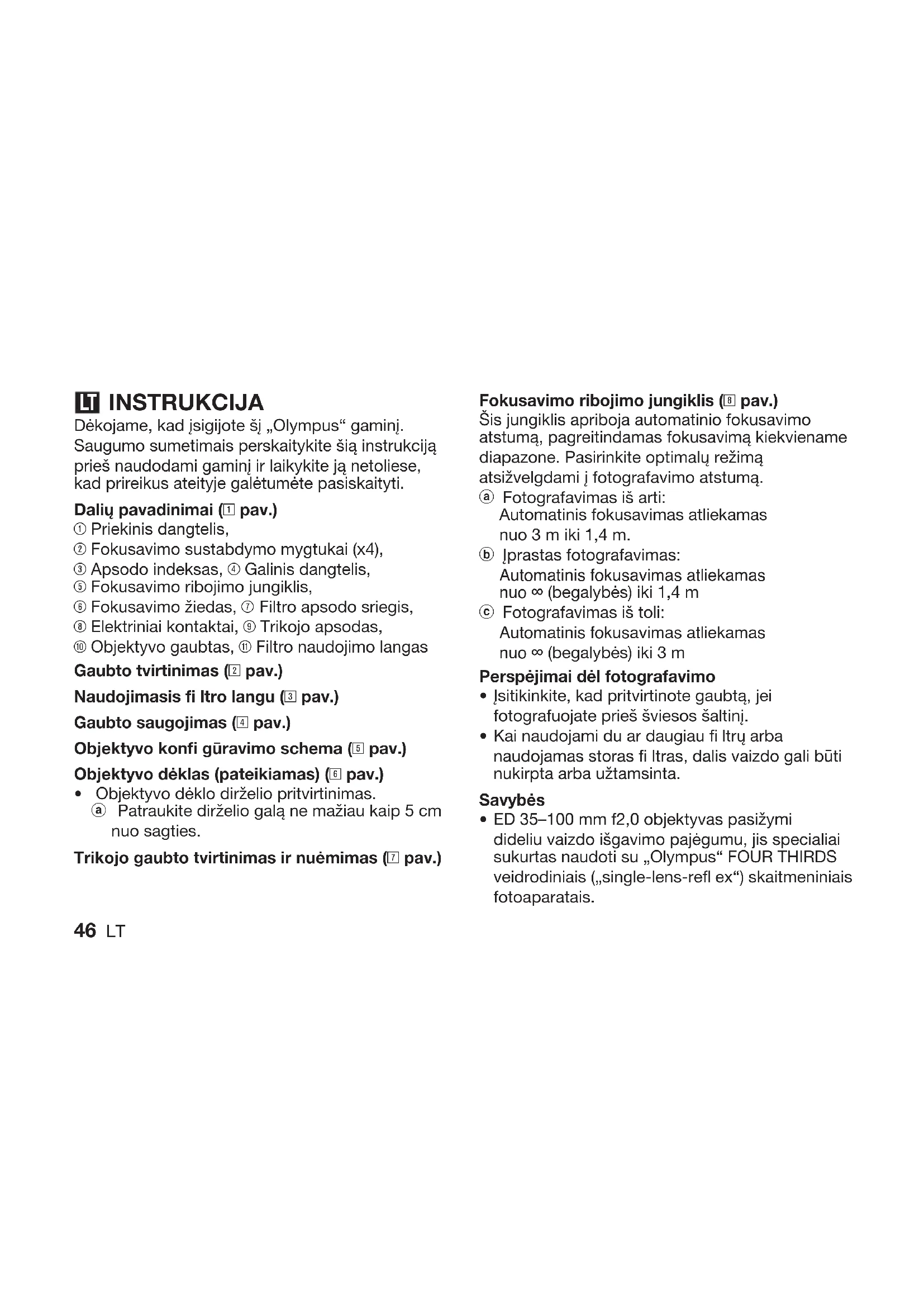 - 46 LT INSTRUKCIJA Dėkojame, kad įsigijote šį „Olympus“ gaminį. Saugumo sumetimais perskaitykite šią instrukciją prieš naudodami gaminį ir laikykite ją netoliese, kad prireikus ateityje galėtumėte pasiskaityti. Dalių pavadinimai (1 pav.) 1 Priekinis dangtelis, 2 Fokusavimo sustabdymo mygtukai (x4), 3 Apsodo indeksas, 4 Galinis dangtelis, 5 Fokusavimo ribojimo jungiklis, 6 Fokusavimo žiedas, 7 Filtro apsodo sriegis, 8 Elektriniai kontaktai, 9 Trikojo apsodas, 0 Objektyvo gaubtas, q Filtro naudojimo langas Gaubto tvirtinimas (2 pav.) Naudojimasis fi ltro langu (3 pav.) Gaubto saugojimas (4 pav.) Objektyvo konfi gūravimo schema (5 pav.) Objektyvo dėklas (pateikiamas) (6 pav.) Objektyvo dėklo dirželio pritvirtinimas.