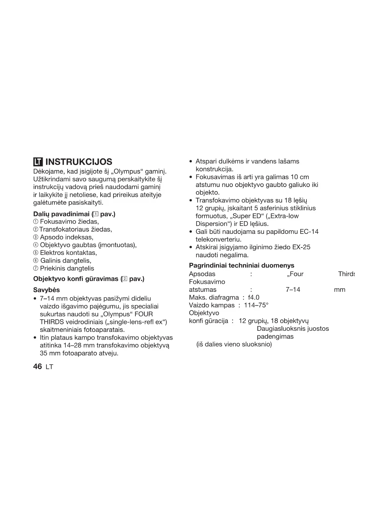 - 46 LT INSTRUKCIJOS Dėkojame, kad įsigijote šį „Olympus“ gaminį. Užtikrindami savo saugumą perskaitykite šį instrukcijų vadovą prieš naudodami gaminį ir laikykite jį netoliese, kad prireikus ateityje galėtumėte pasiskaityti. Dalių pavadinimai (1 pav.) 1 Fokusavimo žiedas, 2 Transfokatoriaus žiedas, 3 Apsodo indeksas, 4 Objektyvo gaubtas (įmontuotas), 5 Elektros kontaktas, 6 Galinis dangtelis, 7 Priekinis dangtelis Objektyvo konfi gūravimas (2 pav.) Savybės 7–14 mm objektyvas pasižymi dideliu vaizdo išgavimo pajėgumu, jis specialiai sukurtas naudoti su „Olympus“ FOUR THIRDS veidrodiniais („single-lens-refl ex“) skaitmeniniais fotoaparatais. Itin plataus kampo transfokavimo objektyvas atitinka 14–28 mm transfokavimo objektyvą 35 mm fotoaparato atveju.