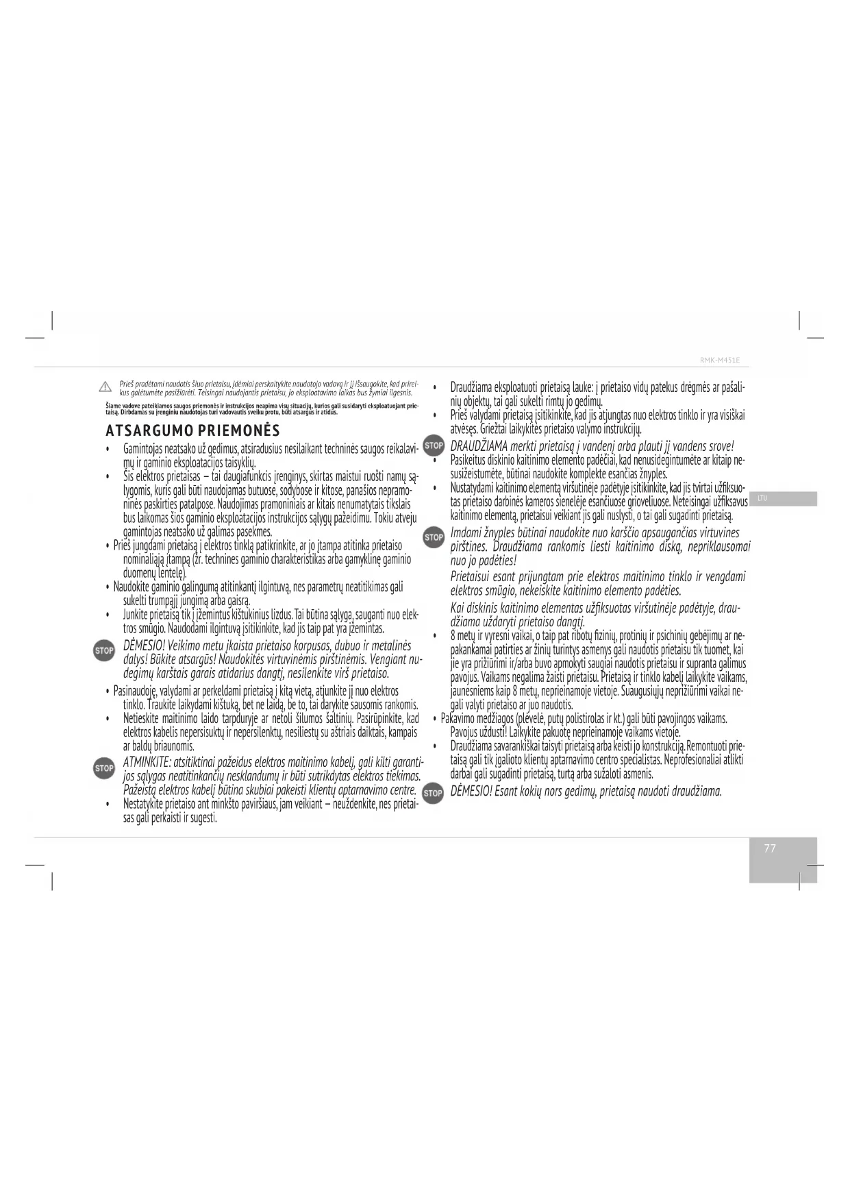 vo dalies ksatorius su atitinkamomis kilpomis, esančiomis vidinėje gaubto pu- sėje ir sujunkite (pasigirs spragtelėjimas). Gerai įstatykite garų vožtuvą į lizdą ant prietaiso dangčio. DĖMESIO! Tam, kad nebūtų deformuota vožtuvo gumelė, nesusukite ir netempkite jos išimant, plaunant ir statant į vietą. Kondensato šalinimas Šiame modelyje kondensatas kaupiasi specialioje talpoje, esančioje aplink dubenį, ant korpuso. Po kiekvieno prietaiso naudojimo aplink dubenį likusį kondensatą nu- šluostykite virtuvine šluoste. Darbinės kameros valymas Griežtai laikantis čia pateiktų nurodymų, tikimybė patekti skysčiams, maisto dalelėms ar nešvarumams į darbinės kameros vidų minimalus. Jeigu vis dėlto nešvarumų pate- ko, nuvalykite darbinės kameros paviršių, kad nebūtų sutrikdytas prietaiso veikimas ir jis nelūžtų. Prieš valant daugiafunkcės virtuvės darbinę kamerą įsitikinkite, kad ji atjungta nuo elektros tinklo ir visiškai atvėso! Šoninės darbinės kameros sienelės, kaitinimo disko paviršius ir centrinio šilumos jutiklio gaubtas (jis yra kaitinimo disko viduje) valomas drėgna (nešlapia!) kempine arba servetėle. Jei naudojate indų ploviklį, būtinai kruopščiai nuskalaukite jo likučius, kad gaminant maistą neatsirastų pašalinis kvapas. Patekus svetimkūnių į aplink centrinį šilumos jutiklį esančią įdubą, atsargiai pašalinkite juos pincetu, nespausdami jutiklio gaubto. Užsiteršus kaitinimo disko paviršiui, galima naudoti vidutinio šiurkštumo drėgną kempinę arba sintetinį šepetėlį. Reguliariai naudojant prietaisą, gali pilnai arba dalinai pakisti kaitinimo disko spalva. Tai nėra prietaiso gedimo požymis ir jis neturi jokios įtakos prietaiso veikimui.81 LT U RMK-M451E