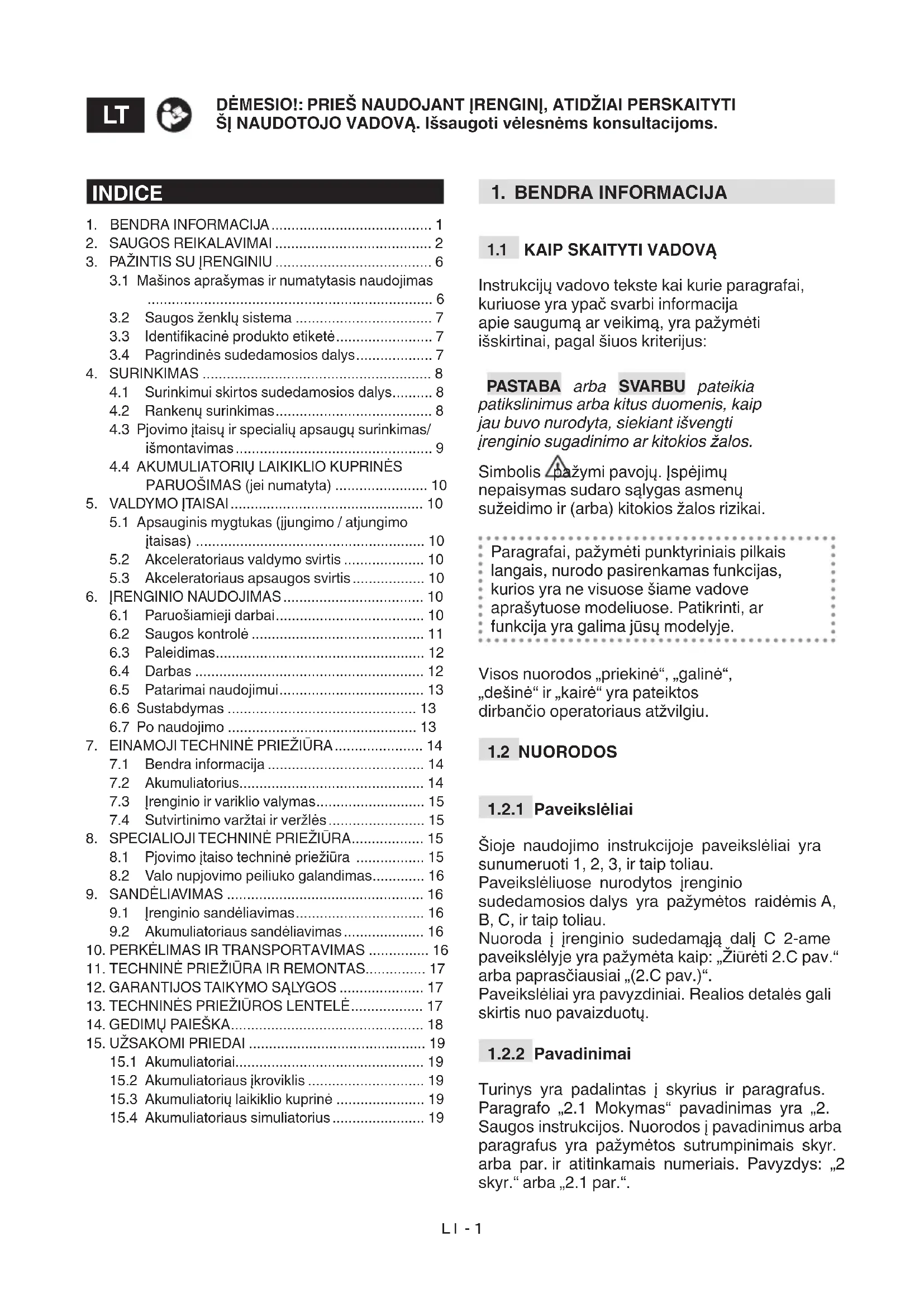 Turinys yra padalintas į skyrius ir paragrafus. Paragrafo „2.1 Mokymas“ pavadinimas yra „2. Saugos instrukcijos. Nuorodos į pavadinimus arba paragrafus yra pažymėtos sutrumpinimais skyr. arba par. ir atitinkamais numeriais. Pavyzdys: „2 skyr.“ arba „2.1 par.“. INDICE