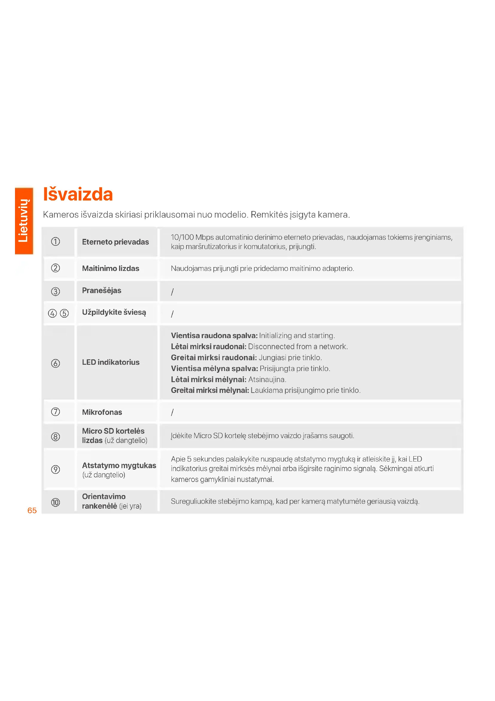 Naudojamas prijungti prie pridedamo maitinimo adapterio. 10/100 Mbps automatinio derinimo eterneto prievadas, naudojamas tokiems įrenginiams, kaip maršrutizatorius ir komutatorius, prijungti. Vientisa raudona spalva: Initializing and starting. Lėtai mirksi raudonai: Disconnected from a network. Greitai mirksi raudonai: Jungiasi prie tinklo. Vientisa mėlyna spalva: Prisijungta prie tinklo. Lėtai mirksi mėlynai: Atsinaujina. Greitai mirksi mėlynai: Laukiama prisijungimo prie tinklo. Įdėkite Micro SD kortelę stebėjimo vaizdo įrašams saugoti. Apie 5 sekundes palaikykite nuspaudę atstatymo mygtuką ir atleiskite jį, kai LED indikatorius greitai mirksės mėlynai arba išgirsite raginimo signalą. Sėkmingai atkurti kameros gamykliniai nustatymai. Sureguliuokite stebėjimo kampą, kad per kamerą matytumėte geriausią vaizdą. Užpildykite šviesą LED indikatorius Mikrofonas Pranešėjas