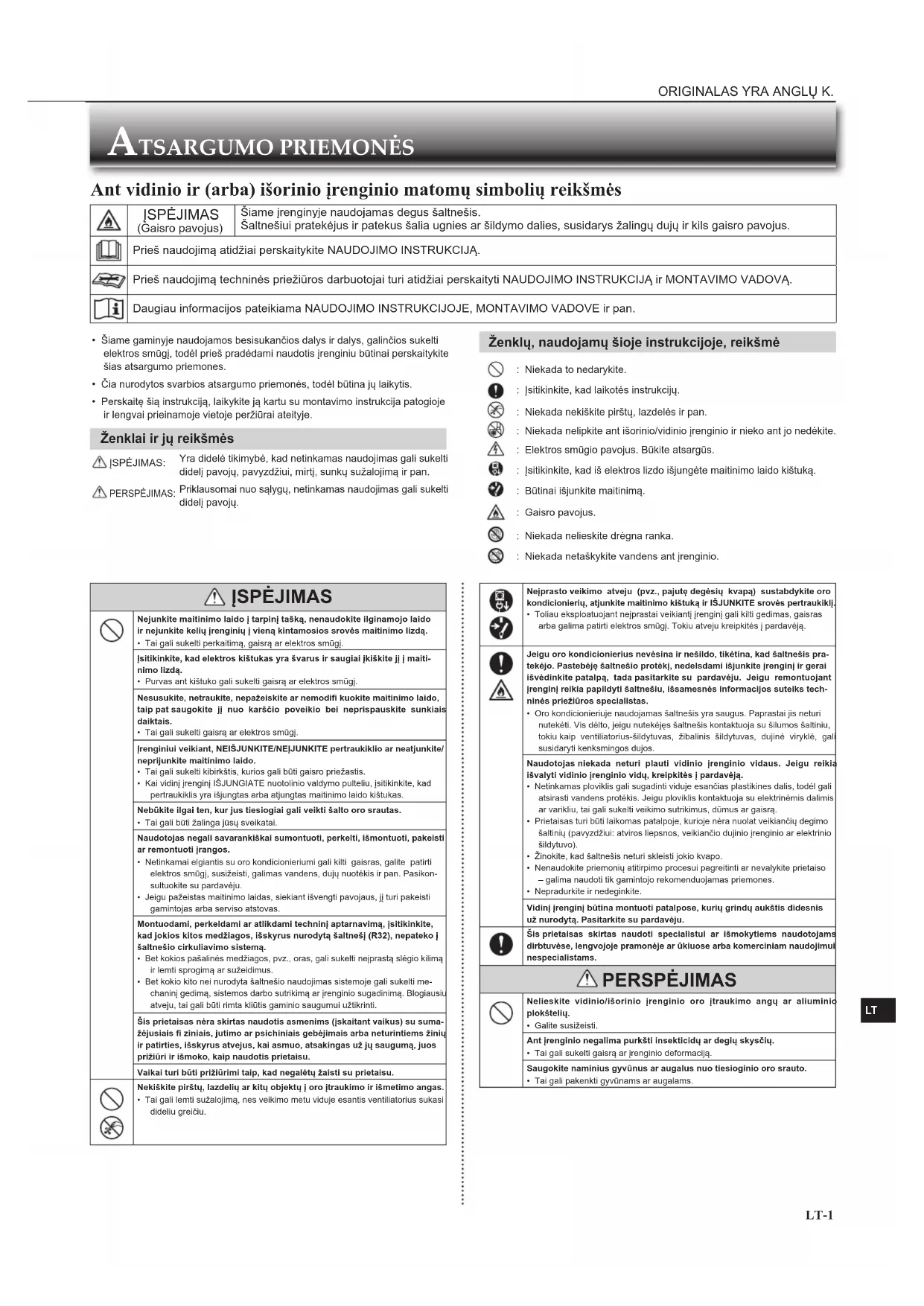Ant vidinio ir (arba) išorinio įrenginio matomų simbolių reikšmės ĮSPĖJIMAS (Gaisro pavojus)Šiame įrenginyje naudojamas degus šaltnešis.Šaltnešiui pratekėjus ir patekus šalia ugnies ar šildymo dalies, susidarys žalingų dujų ir kils gaisro pavojus.Prieš naudojimą atidžiai perskaitykite NAUDOJIMO INSTRUKCIJĄ.Prieš naudojimą techninės priežiūros darbuotojai turi atidžiai perskaityti NAUDOJIMO INSTRUKCIJĄ ir MONTAVIMO VADOVĄ.Daugiau informacijos pateikiama NAUDOJIMO INSTRUKCIJOJE, MONTAVIMO VADOVE ir pan. JG79Y566L01_22Lt.indd 1 2018-12-27 14:06:37LT-2 Siekiant užtikrinti tinkamą ir saugų naudojimą, prieš pradėdami naudoti įrenginį, atidžiai perskaitykite šią naudojimo instrukciją.