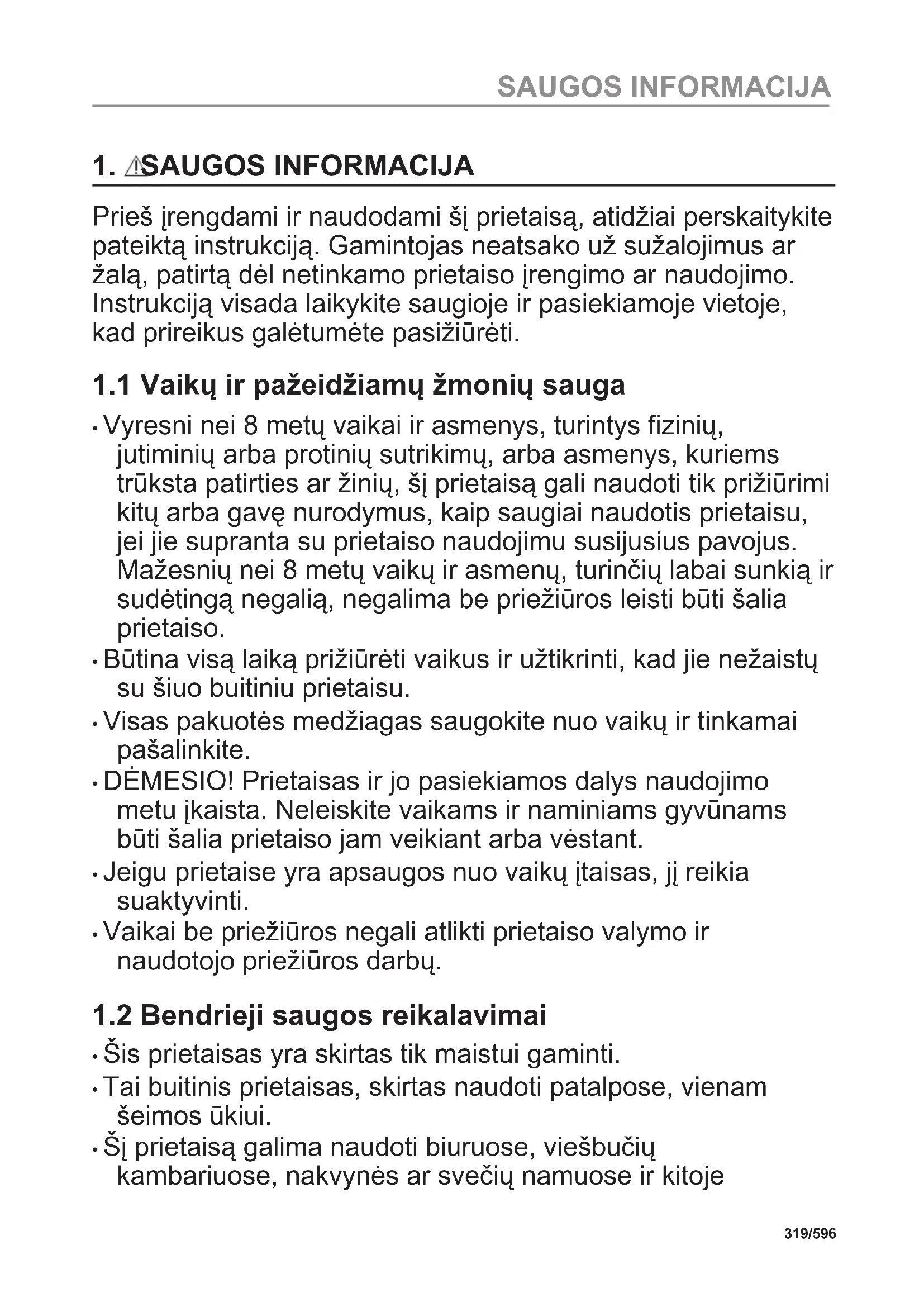 - Prietaisą privaloma įžeminti. 321/596 SAUGOS INSTRUKCIJOS• Įsitikinkite, kad parametrai techninių duomenų plokštelėje atitinka maitinimo tinklo elektros vardinius duomenis.