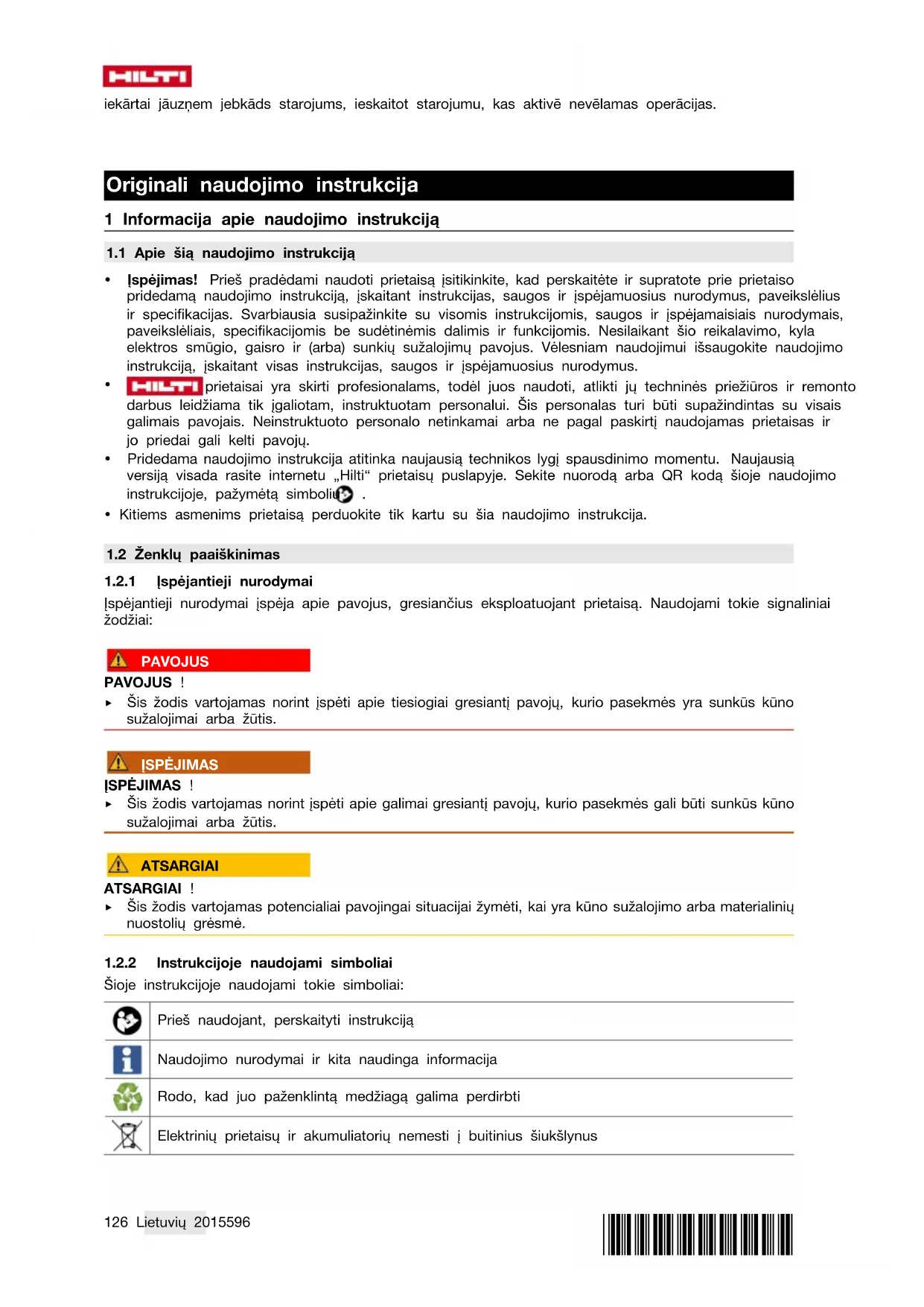 - Pridedama naudojimo instrukcija atitinka naujausią technikos lygį spausdinimo momentu. Naujausią versiją visada rasite internetu „Hilti“ prietaisų puslapyje. Sekite nuorodą arba QR kodą šioje naudojimo instrukcijoje, pažymėtą simboliu .