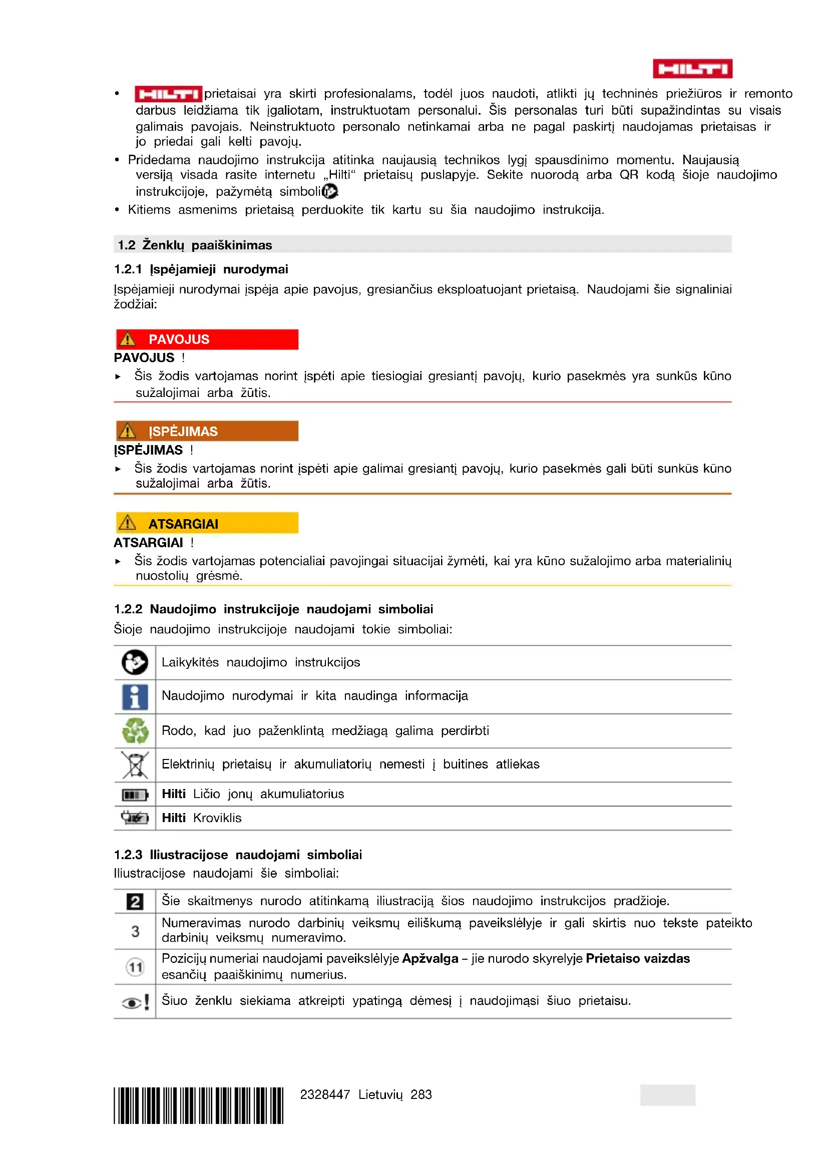 Šioje naudojimo instrukcijoje naudojami tokie simboliai: Laikykitės naudojimo instrukcijos Naudojimo nurodymai ir kita naudinga informacija Rodo, kad juo paženklintą medžiagą galima perdirbti Elektrinių prietaisų ir akumuliatorių nemesti į buitines atliekas Hilti Ličio jonų akumuliatorius Hilti Kroviklis