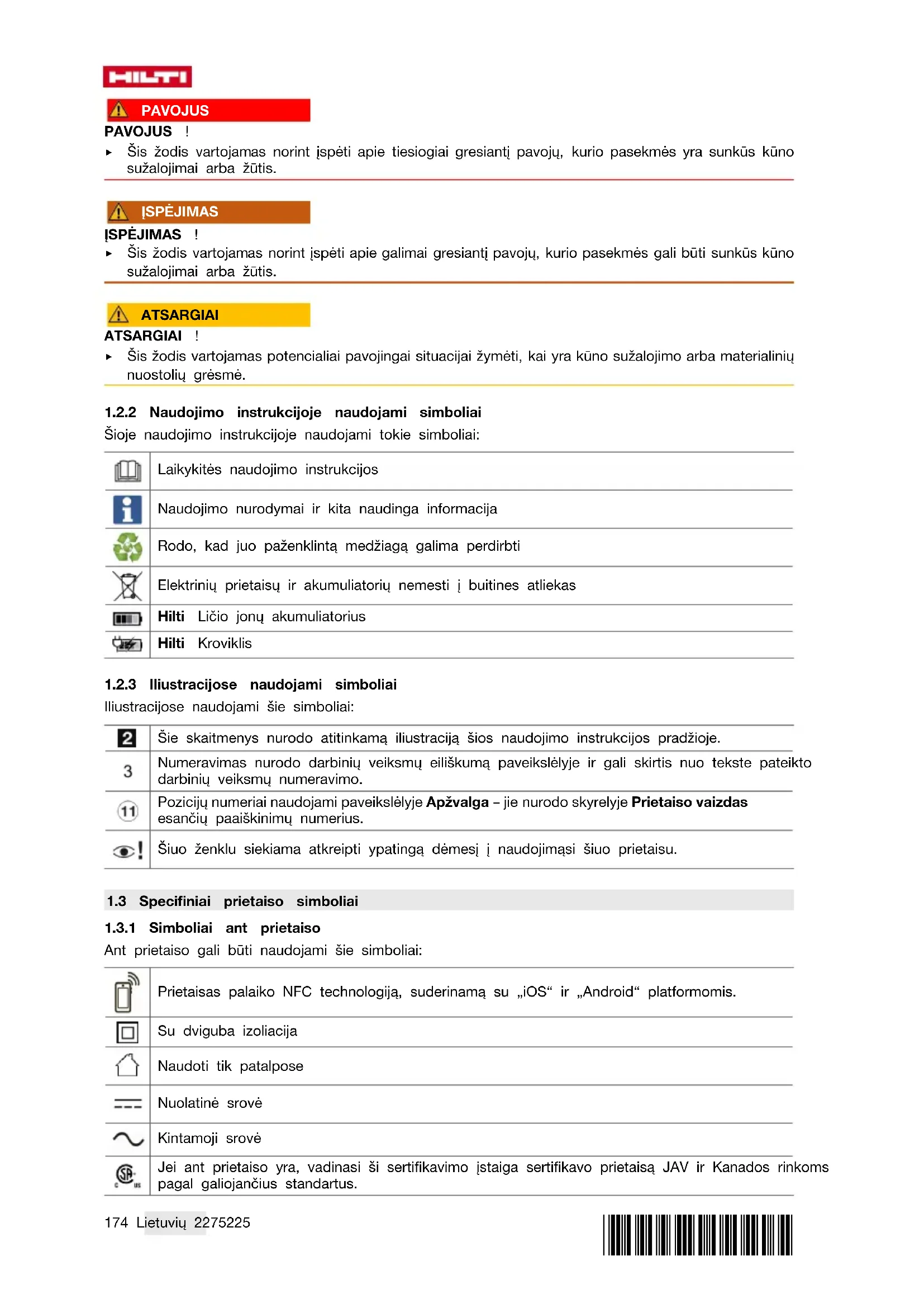 Šioje naudojimo instrukcijoje naudojami tokie simboliai: Laikykitės naudojimo instrukcijos Naudojimo nurodymai ir kita naudinga informacija Rodo, kad juo paženklintą medžiagą galima perdirbti Elektrinių prietaisų ir akumuliatorių nemesti į buitines atliekas Hilti Ličio jonų akumuliatorius Hilti Kroviklis