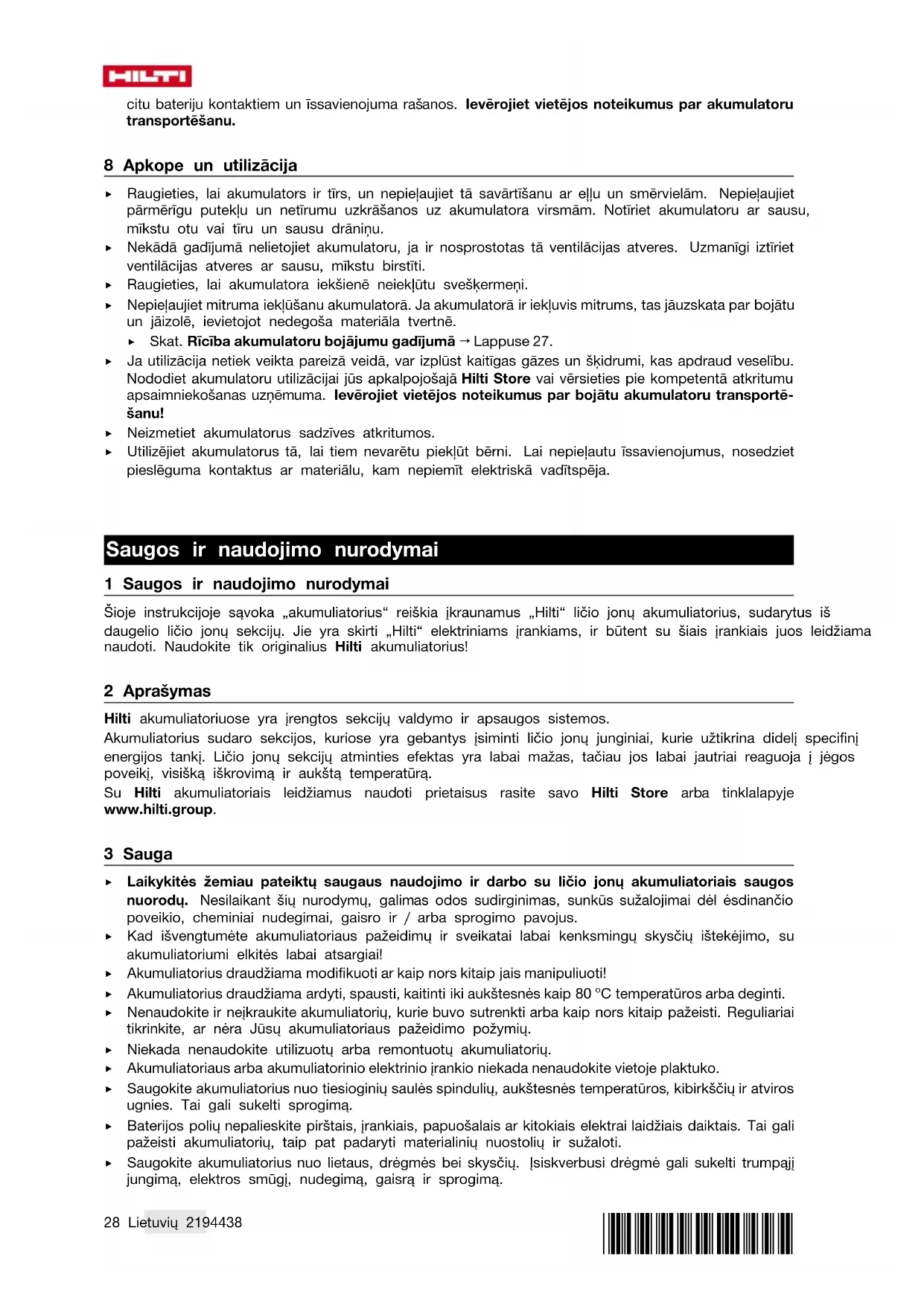 Ja jums šķiet, ka akumulatoram ir radusies iekšēja problēma, sazinieties ar Hilti servisu. ▶ Ja akumulators nedarbojas, to vairs nav iespējams uzlādēt vai no tā izplūst šķidrums, tas ir jāutilizē. Skat. nodaļu Apkope un utilizācija → Lappuse 28. 6 Pasākumi akumulatora aizdegšanās gadījumā BRĪDINĀJUMS! Apdraudējums, ko rada akumulatora aizdegšanās! Akumulatora degšanas laikā izdalās kaitīgi un sprādzienbīstami šķidrumi un tvaiki, kas var izraisīt korozīvas traumas, apdegumus, ugunsgrēku vai eksploziju. ▶ Degoša akumulatora dzēšanas laikā valkājiet individuālo aizsargaprīkojumu. ▶ Nodrošiniet pietiekamu ventilāciju, lai veicinātu bīstamo un eksplozīvo tvaiku aizplūšanu. ▶ Ja intensīvi izplatās dūmi, nekavējoties atstājiet telpu. ▶ Elpceļu kairinājuma gadījumā meklējiet medicīnisko palīdzību. ▶ Pirms sākt dzēšanas mēģinājumu, izsauciet ugunsdzēsējus. ▶ Ja akumulators ir aizdedzies, veiciet dzēšanu tikai ar ūdeni, no iespējami liela attāluma. Pulverveida ugunsdzēšamie līdzekļi un segas litija jonu akumulatoru degšanas gadījumā ir neefektīvi. Apkārtējā ugunsgrēka dzēšanai var izmantot parastos ugunsdzēsības līdzekļus. ▶ Nemēģiniet pārvietot lielu daudzumu degošu akumulatoru. Aizvāciet no tuvākās apkārtnes neskartos materiālus, lai tādējādi izolētu degšanas skartos akumulatorus. Gadījumā, ja akumulators neatdziest, dūmo vai deg: ▶ ar lāpstas palīdzību paceliet to un iemetiet spainī ar ūdeni. Pateicoties ūdens dzesējošajai iedarbībai, no aizdegšanās tiek pasargāti akumulatora elementi, kas vēl nav sasnieguši kritisko temperatūru. ▶ Vismaz uz 24 stundām ievietojiet akumulatoru spainī, līdz tas ir pilnībā atdzisis. ▶ Skat. Rīcība akumulatoru bojājumu gadījumā → Lappuse 27. 7 Informācija par transportēšanu un uzglabāšanu ▶ Apkārtējā temperatūra robežās no -17 °C līdz +60 °C / no 1 °F līdz 140 °F. ▶ Uzglabāšanas temperatūra robežās no -20 °C līdz +40 °C / -4 °F līdz 104 °F. ▶ Neglabājiet akumulatorus uz lādētāja. Pēc uzlādes procesa vienmēr noņemiet akumulatoru no lādētāja. ▶ Ja iespējams, glabājiet akumulatorus vēsā un sausā vietā. Uzglabāšana vēsumā paildzina akumulatora kalpošanas laiku. Akumulatorus nekādā gadījumā nedrīkst glabāt augstā temperatūrā, tiešos saules staros vai aiz stikla. ▶ Akumulatorus nedrīkst sūtīt pa pastu. Ja vēlaties nosūtīt nebojātus akumulatorus, vērsieties sūtījumu piegādes uzņēmumā. ▶ Akumulatorus nekādā gadījumā nedrīkst transportēt nenostiprinātā veidā, sabērtus kaudzēs. Transpor- tēšanas laikā akumulatori jāsargā no triecieniem un vibrācijas, kā arī jāizolē no jebkādiem materiāliem, kam piemīt elektriskā vadītspēja, un citiem akumulatoriem, lai nepieļautu to nonākšanu saskarē ar28 Lietuvių 2194438 *2194438* citu bateriju kontaktiem un īssavienojuma rašanos. Ievērojiet vietējos noteikumus par akumulatoru transportēšanu. 8 Apkope un utilizācija ▶ Raugieties, lai akumulators ir tīrs, un nepieļaujiet tā savārtīšanu ar eļļu un smērvielām. Nepieļaujiet pārmērīgu putekļu un netīrumu uzkrāšanos uz akumulatora virsmām. Notīriet akumulatoru ar sausu, mīkstu otu vai tīru un sausu drāniņu. ▶ Nekādā gadījumā nelietojiet akumulatoru, ja ir nosprostotas tā ventilācijas atveres. Uzmanīgi iztīriet ventilācijas atveres ar sausu, mīkstu birstīti. ▶ Raugieties, lai akumulatora iekšienē neiekļūtu svešķermeņi. ▶ Nepieļaujiet mitruma iekļūšanu akumulatorā. Ja akumulatorā ir iekļuvis mitrums, tas jāuzskata par bojātu un jāizolē, ievietojot nedegoša materiāla tvertnē. ▶ Skat. Rīcība akumulatoru bojājumu gadījumā → Lappuse 27. ▶ Ja utilizācija netiek veikta pareizā veidā, var izplūst kaitīgas gāzes un šķidrumi, kas apdraud veselību. Nododiet akumulatoru utilizācijai jūs apkalpojošajā Hilti Store vai vērsieties pie kompetentā atkritumu apsaimniekošanas uzņēmuma. Ievērojiet vietējos noteikumus par bojātu akumulatoru transportē- šanu! ▶ Neizmetiet akumulatorus sadzīves atkritumos. ▶ Utilizējiet akumulatorus tā, lai tiem nevarētu piekļūt bērni. Lai nepieļautu īssavienojumus, nosedziet pieslēguma kontaktus ar materiālu, kam nepiemīt elektriskā vadītspēja. Saugos ir naudojimo nurodymai 1 Saugos ir naudojimo nurodymai Šioje instrukcijoje sąvoka „akumuliatorius“ reiškia įkraunamus „Hilti“ ličio jonų akumuliatorius, sudarytus iš daugelio ličio jonų sekcijų. Jie yra skirti „Hilti“ elektriniams įrankiams, ir būtent su šiais įrankiais juos leidžiama naudoti. Naudokite tik originalius Hilti akumuliatorius! 2 Aprašymas Hilti akumuliatoriuose yra įrengtos sekcijų valdymo ir apsaugos sistemos. Akumuliatorius sudaro sekcijos, kuriose yra gebantys įsiminti ličio jonų junginiai, kurie užtikrina didelį specifinį energijos tankį. Ličio jonų sekcijų atminties efektas yra labai mažas, tačiau jos labai jautriai reaguoja į jėgos poveikį, visišką iškrovimą ir aukštą temperatūrą. Su Hilti akumuliatoriais leidžiamus naudoti prietaisus rasite savo Hilti Store arba tinklalapyje www.hilti.group. 3 Sauga ▶ Laikykitės žemiau pateiktų saugaus naudojimo ir darbo su ličio jonų akumuliatoriais saugos nuorodų. Nesilaikant šių nurodymų, galimas odos sudirginimas, sunkūs sužalojimai dėl ėsdinančio poveikio, cheminiai nudegimai, gaisro ir / arba sprogimo pavojus. ▶ Kad išvengtumėte akumuliatoriaus pažeidimų ir sveikatai labai kenksmingų skysčių ištekėjimo, su akumuliatoriumi elkitės labai atsargiai! ▶ Akumuliatorius draudžiama modifikuoti ar kaip nors kitaip jais manipuliuoti! ▶ Akumuliatorius draudžiama ardyti, spausti, kaitinti iki aukštesnės kaip 80 °C temperatūros arba deginti. ▶ Nenaudokite ir neįkraukite akumuliatorių, kurie buvo sutre