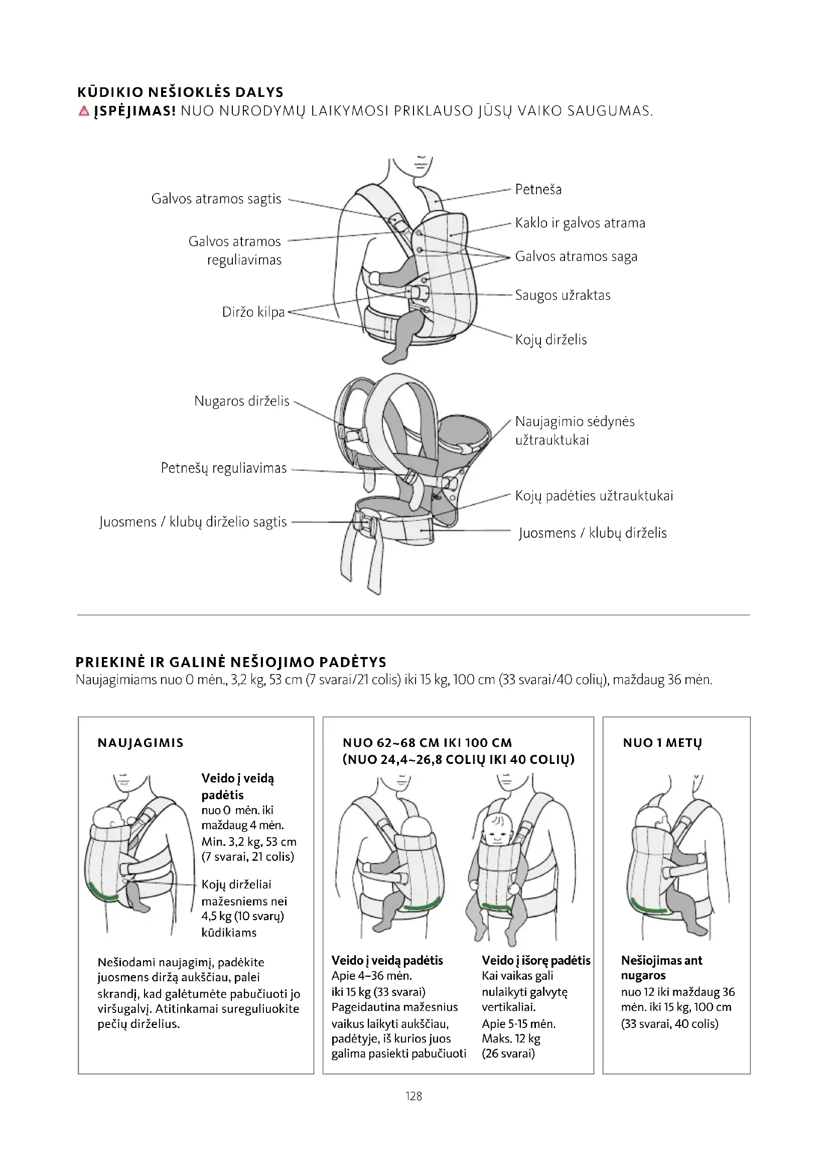 ATEIČIAI ĮSPĖJIMAS! Prieš surinkdami ir naudodami minkštą nešioklę, perskaitykite visas instrukcijas. Prieš naudodami gaminį mažo svorio gimusiems ir sergantiems kūdikiams, pasitarkite su mediku. Prieš kiekvieną naudojimą patikrinkite, ar visos sagtys, spaustukai, diržai yra saugūs, ar įtempimas pakankamas.
