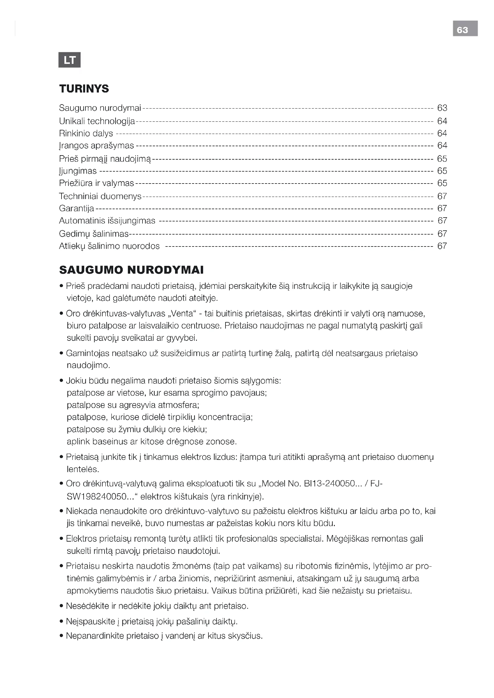 Taikoma tik ES šalims: Senos elektros technikos negalima išmesti su buitinėmis atliekomis. Prašome atiduoti į esamas vietines surinkimo vietas. Taip prisidėsite prie aplinkos bei žmonių sveikatos saugo- jimo. GARANTIJA Dėl aukštos gaminio kokybės „Venta-Luftwäscher GmbH“ garantuoja, kad šis gaminys nesuges, jei bus tinkamai naudojamas. Ši garantija suteikiama dvejiems metams po įsigijimo datos. Jei vis dėl to aptiktumėte medžiagų ar gamybos defektų, susisiekite su „Venta“ techninio aptarnavimo komanda ar vietiniu platintoju. Galioja bendrosios „Venta“ garantijos sąlygos: www.venta-luftwaescher.de/service/garantie/