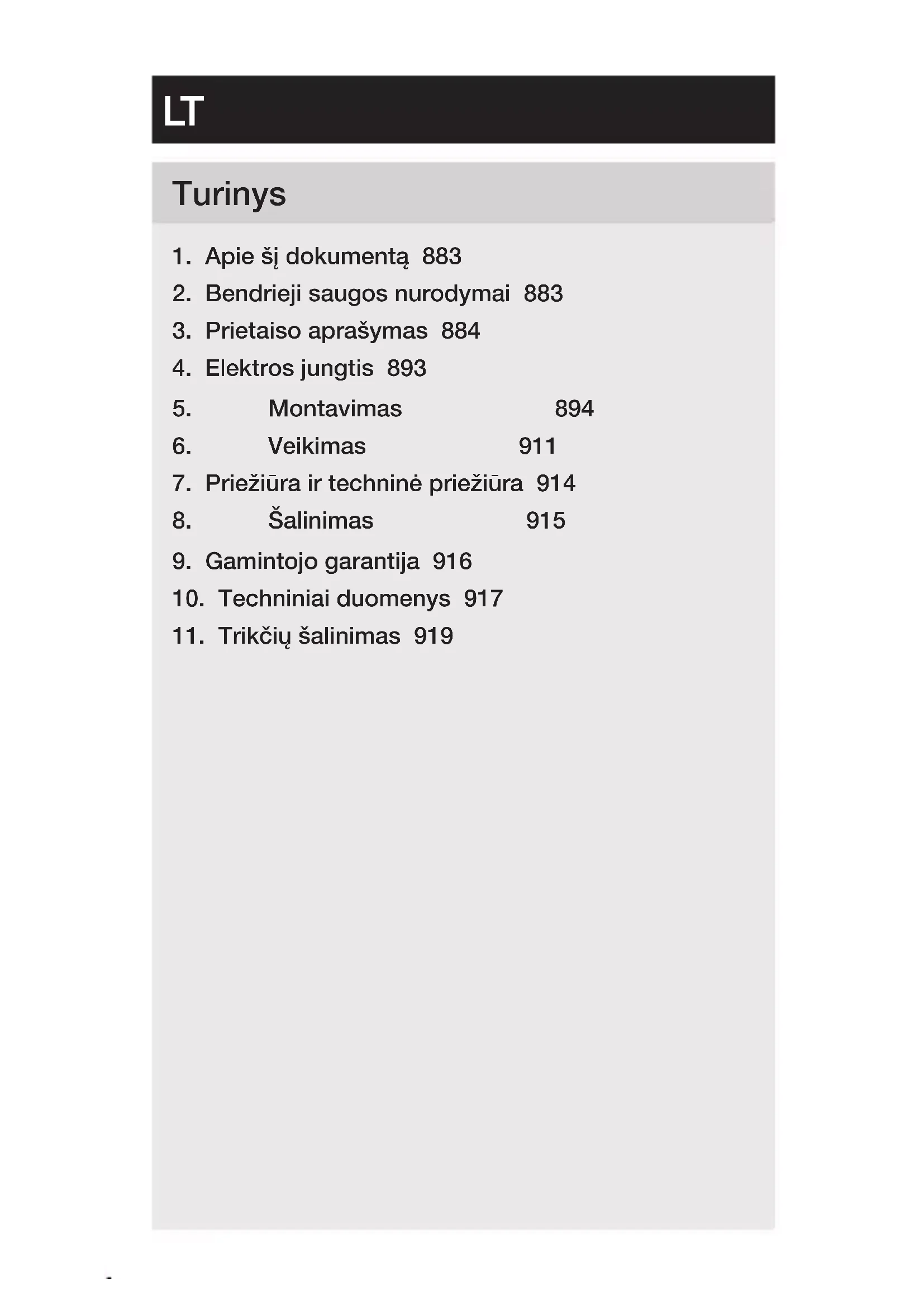 - Laikykite pasiekiamoje vietoje. – Dirbant su elektros srove galimos pavojingos situacijos. Prisilietus prie dalių, kuriomis teka srovė, galima patirti smūgį, nudegimus arba žūti. – Darbus, susijusius su tinklo įtampa, gali atlikti tik kvalifikuoti darbuotojai. – Būtina laikytis šalyje galiojančių įrengimo instrukcijų ir prijungimo reikalavimų (pvz., D: VDE 0100, A: ÖVE- ÖNORM E8001-1, CH: SEV 1000). – Naudokite tik originalias atsargines dalis. – Remontą gali atlikti tik specializuotos įmonės.– 838 – Turinys