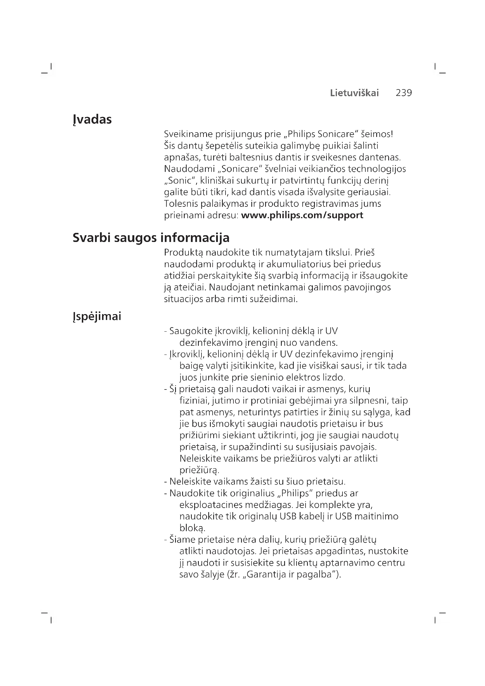 Lietuviškai Įvadas Sveikiname prisijungus prie „Philips Sonicare“ šeimos! Šis dantų šepetėlis suteikia galimybę puikiai šalinti apnašas, turėti baltesnius dantis ir sveikesnes dantenas. Naudodami „Sonicare“ švelniai veikiančios technologijos „Sonic“, kliniškai sukurtų ir patvirtintų funkcijų derinį galite būti tikri, kad dantis visada išvalysite geriausiai. Tolesnis palaikymas ir produkto registravimas jums prieinami adresu: www.philips.com/support Svarbi saugos informacija Produktą naudokite tik numatytajam tikslui. Prieš naudodami produktą ir akumuliatorius bei priedus atidžiai perskaitykite šią svarbią informaciją ir išsaugokite ją ateičiai. Naudojant netinkamai galimos pavojingos situacijos arba rimti sužeidimai. Įspėjimai - Saugokite įkroviklį, kelioninį dėklą ir UV dezinfekavimo įrenginį nuo vandens. - Įkroviklį, kelioninį dėklą ir UV dezinfekavimo įrenginį baigę valyti įsitikinkite, kad jie visiškai sausi, ir tik tada juos junkite prie sieninio elektros lizdo. - Šį prietaisą gali naudoti vaikai ir asmenys, kurių fiziniai, jutimo ir protiniai gebėjimai yra silpnesni, taip pat asmenys, neturintys patirties ir žinių su sąlyga, kad jie bus išmokyti saugiai naudotis prietaisu ir bus prižiūrimi siekiant užtikrinti, jog jie saugiai naudotų prietaisą, ir supažindinti su susijusiais pavojais. Neleiskite vaikams be priežiūros valyti ar atlikti priežiūrą. - Neleiskite vaikams žaisti su šiuo prietaisu. - Naudokite tik originalius „Philips“ priedus ar eksploatacines medžiagas. Jei komplekte yra, naudokite tik originalų USB kabelį ir USB maitinimo bloką. - Šiame prietaise nėra dalių, kurių priežiūrą galėtų atlikti naudotojas. Jei prietaisas apgadintas, nustokite jį naudoti ir susisiekite su klientų aptarnavimo centru savo šalyje (žr. „Garantija ir pagalba”).240 Lietuviškai - Jei USB kabelis arba USB maitinimo blokas pažeisti, jais nebesinaudokite. - Įkroviklio, kelioninio dėklo ir (arba) UV dezinfekavimo įrenginio nenaudokite lauke ar šalia įkaitusių paviršių. - Jokių produkto dalių neplaukite indaplovėje. - Šis prietaisas skirtas valyti tik dantis, dantenas ir liežuvį. - UV dezinfekavimo įrenginį visada laikykite vaikams nepasiekiamoje vietoje. - Jei atidarius UV dezinfekavimo įrenginio dureles nuolat šviečia UV šviesos diodas/ lemputė, UV dezinfekavimo įrenginiu nebesinaudokite. UV šviesa gali būti pavojinga žmonių akims ir odai. - Dezinfekavimo įrenginį naudokite tik uždėję apsauginį skydelį. - Nelieskite UV nukenksminimo įrenginio UV šviesos lemputės, kai ji karšta. - Nebenaudokite šepetėlio galvutės, jei jos šereliai suspausti ar sulinkę. Šepetėlio galvutę keiskite kas 3 mėnesius arba dažniau, jei atsiranda susidėvėjimo požymių. - Venkite tiesioginio kontakto su produktais, kuriuose yra eterinių aliejų arba kokosų aliejaus. Kontaktas gali lemti šerių atsiskyrimą. - Galima naudoti daugiausia 4500 metrų aukštyje.
