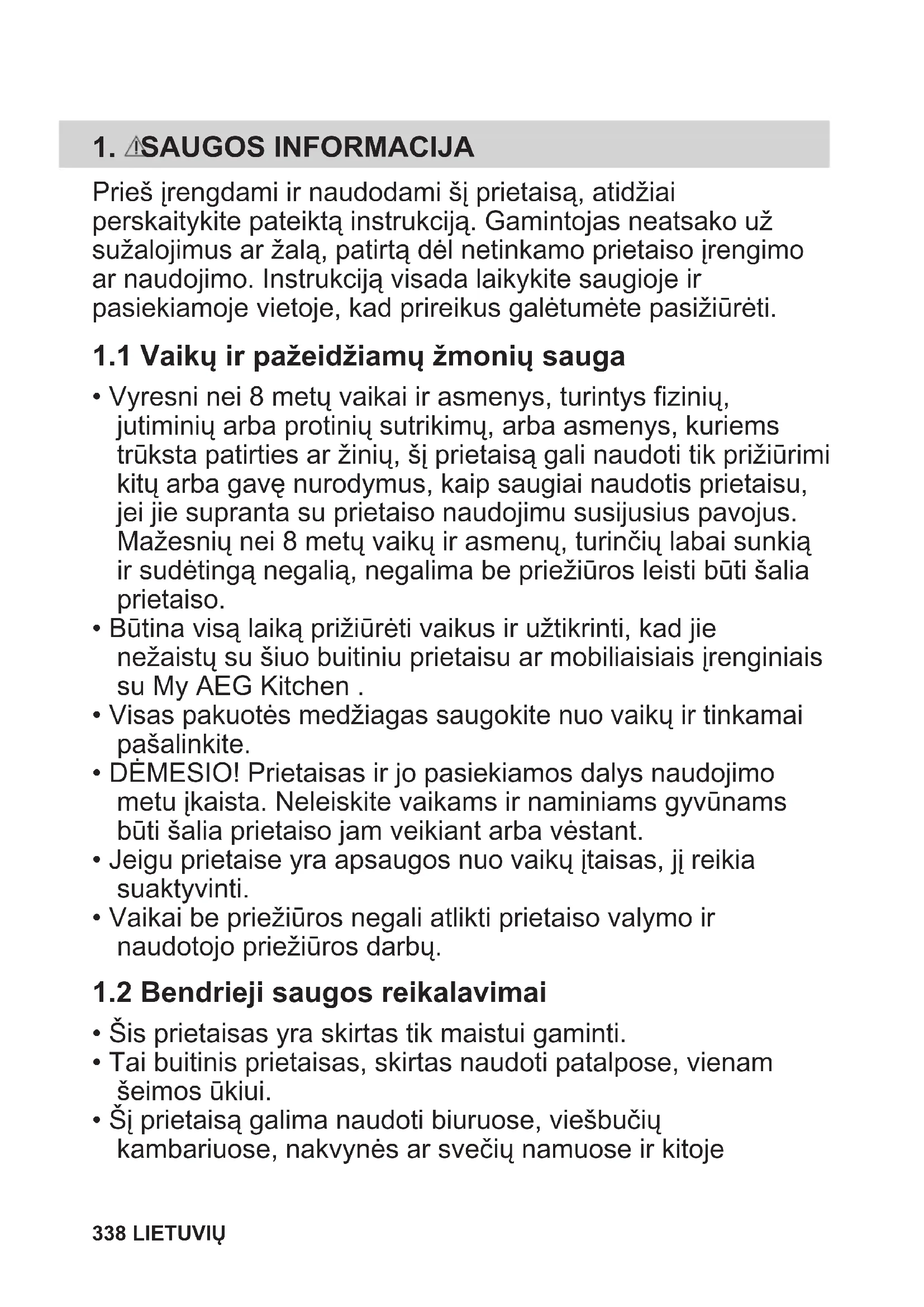- Būtina visą laiką prižiūrėti vaikus ir užtikrinti, kad jie nežaistų su šiuo buitiniu prietaisu ar mobiliaisiais įrenginiais su My AEG Kitchen .