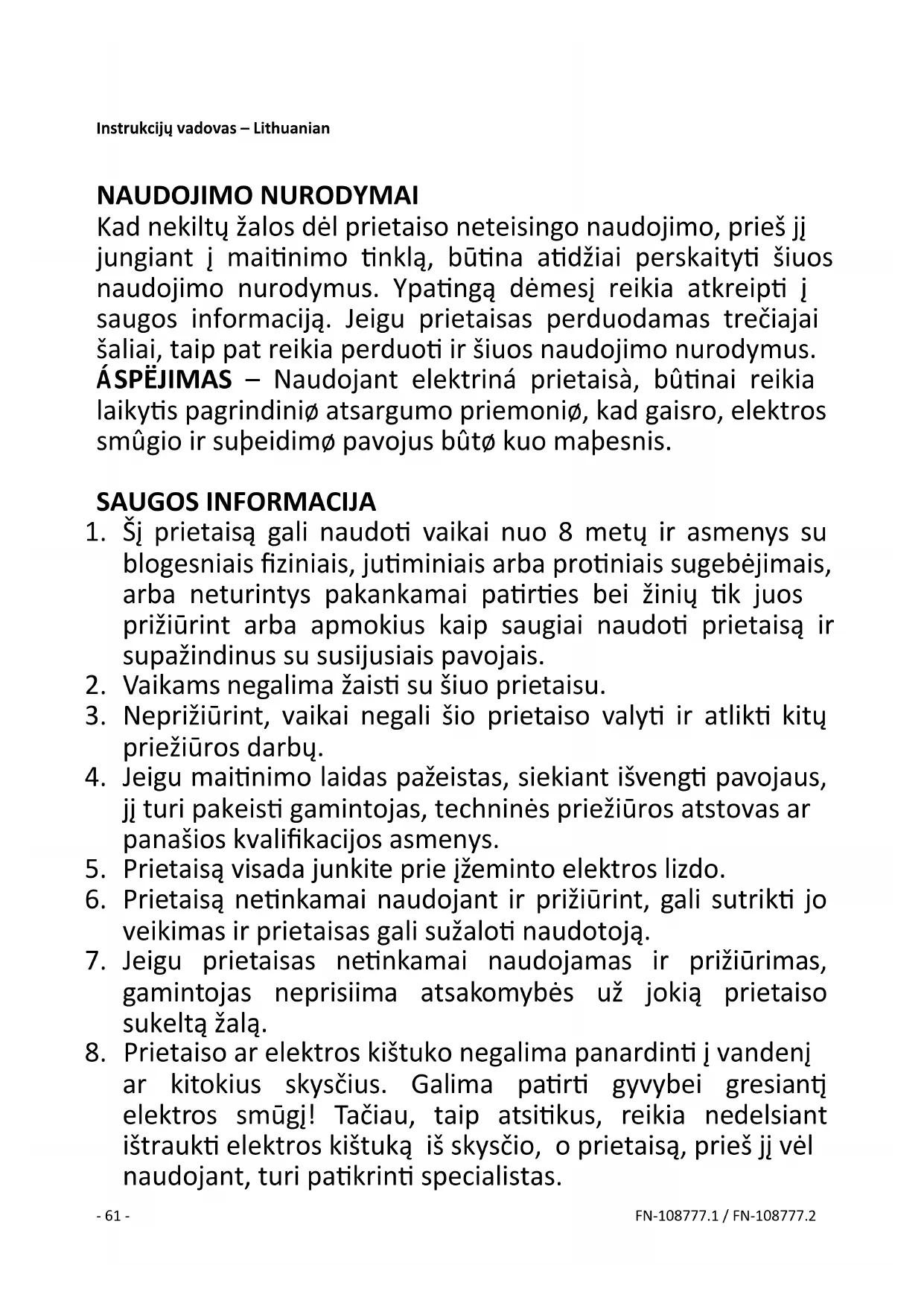 ar kitokius skysčius. Galima patirti gyvybei gresiantį elektros smūgį! Tačiau, taip atsitikus, reikia nedelsiant ištraukti elektros kištuką iš skysčio, o prietaisą, prieš jį vėl naudojant, turi patikrinti specialistas.- 62 - FN-108777.1 / FN-108777.2
