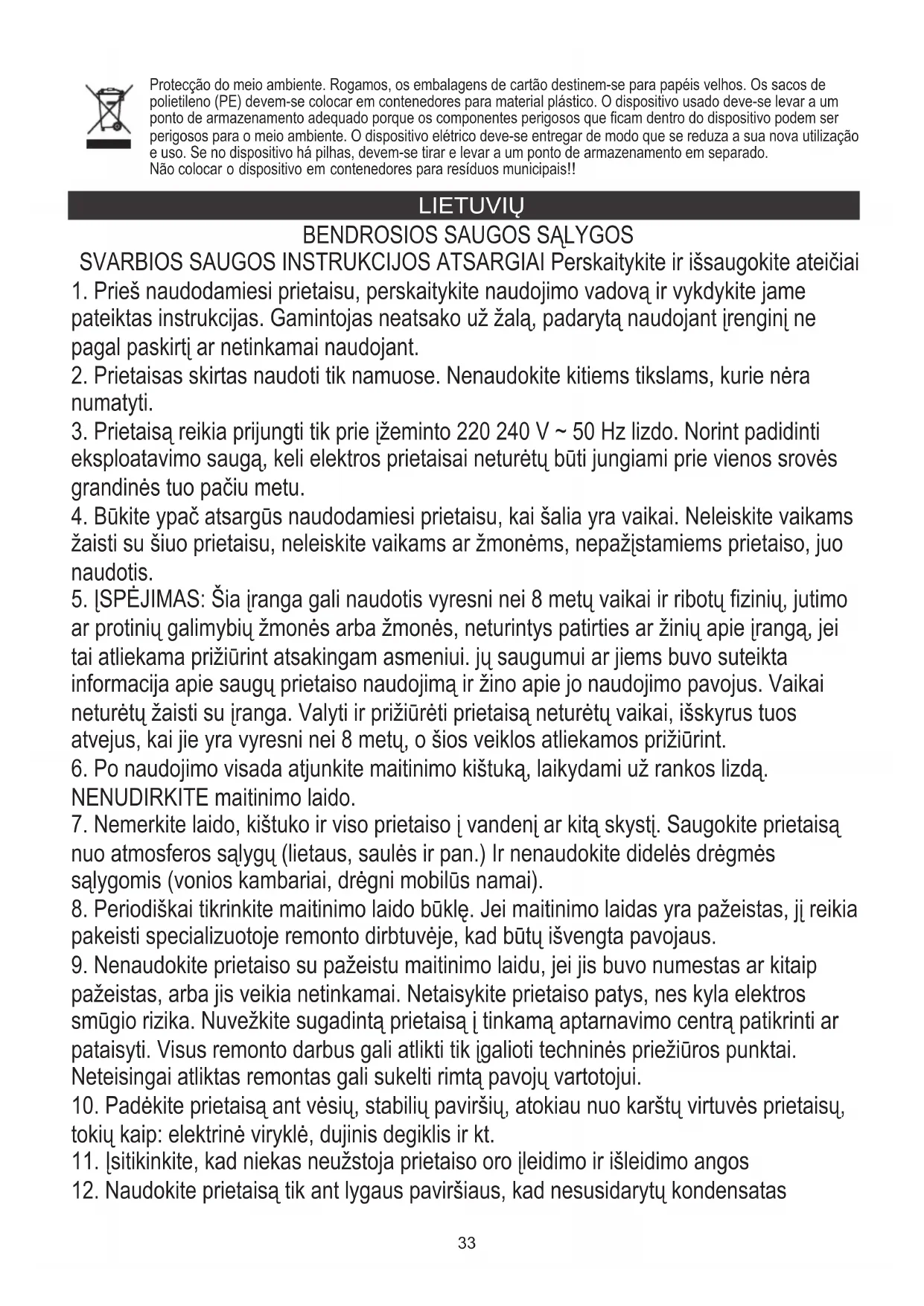 ar protinių galimybių žmonės arba žmonės, neturintys patirties ar žinių apie įrangą, jei tai atliekama prižiūrint atsakingam asmeniui. jų saugumui ar jiems buvo suteikta informacija apie saugų prietaiso naudojimą ir žino apie jo naudojimo pavojus. Vaikai neturėtų žaisti su įranga. Valyti ir prižiūrėti prietaisą neturėtų vaikai, išskyrus tuos atvejus, kai jie yra vyresni nei 8 metų, o šios veiklos atliekamos prižiūrint.