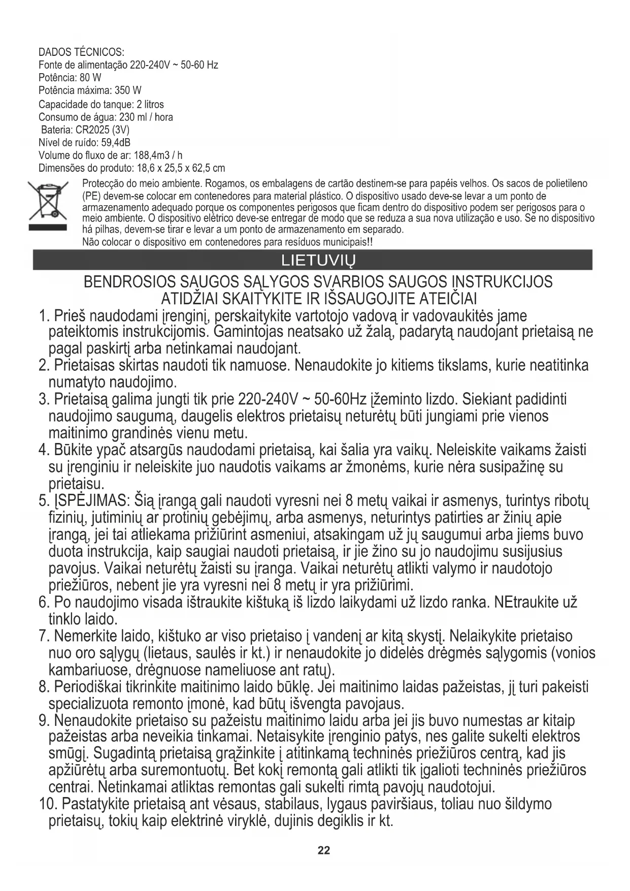 TECHNINIAI DUOMENYS: Maitinimo šaltinis 220-240V ~ 50-60 Hz Galia: 80 W Maksimali galia: 350 W Bako talpa: 2 litrai Vandens suvartojimas: 230 ml / val Baterija: CR2025 (3V) Triukšmo lygis: 59,4 dB Oro srautas: 188,4m3/h Gaminio matmenys: 18,6 x 25,5 x 62,5 cm Rūpinantis aplinka. Kartono pakuotes atiduoti į makulatūrą. Polietileno (PE) maišelius mesti į plastikui skirtą konteinerį. Susidėvėjusį prietaisą atiduoti į atitinkamą atliekų surinkimo vietą, nes prietaise esančios pavojingos medžiagos gali kelti grėsmę aplinkai. Elektrinį prietaisą atiduoti tokį, kad nebūtų galima jo pakartotinai naudoti ir panaudoti. Jeigu prietaise yra baterijos, būtina jas išimti ir atskirai atiduoti į atliekų surinkimo vietą. Nemesti prietaiso į buitinių atliekų konteinerį! LATVIEŠU VISPĀRĒJI DROŠĪBAS NOSACĪJUMI SVARĪGI DROŠĪBAS NORĀDĪJUMI UZMANĪGI IZLASIET UN SAGLABĀJIET NĀKAMAI ATSAUKSMEI