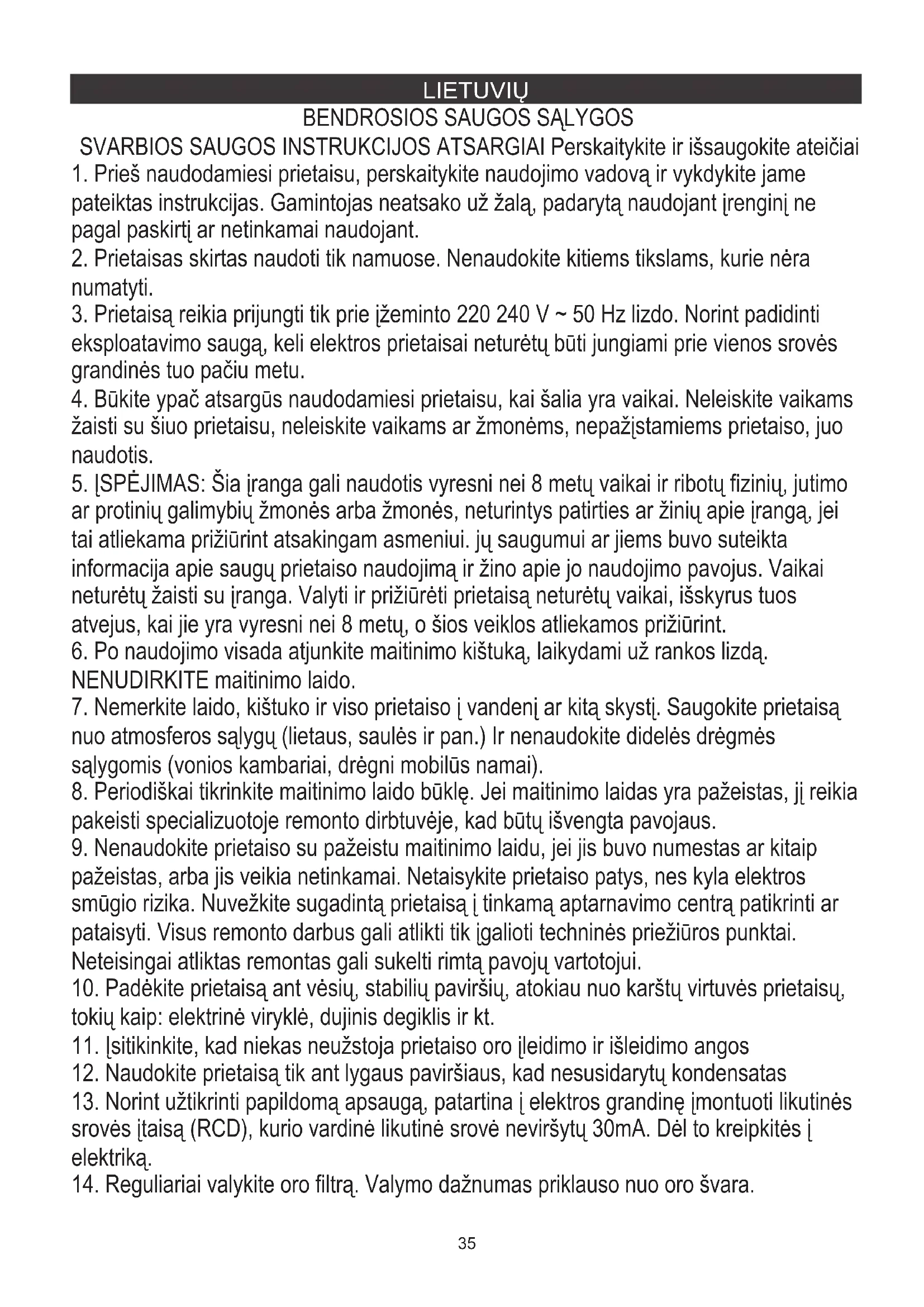 SVARBIOS SAUGOS INSTRUKCIJOS ATSARGIAI Perskaitykite ir išsaugokite ateičiai