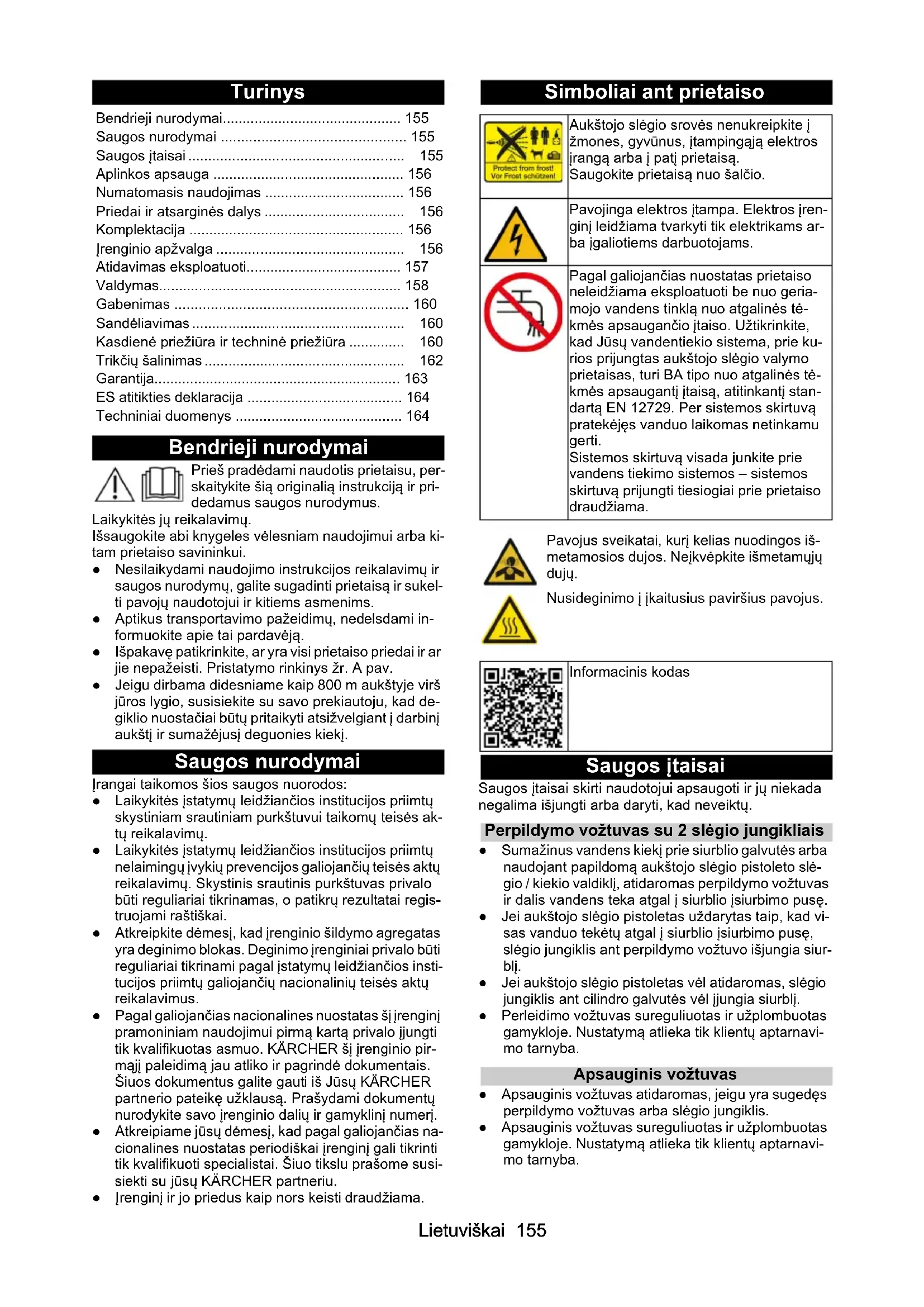 - 0,9 0,8 0,9 1 1Lietuviškai 155 Turinys Bendrieji nurodymai Prieš pradėdami naudotis prietaisu, per- skaitykite šią originalią instrukciją ir pri- dedamus saugos nurodymus. Laikykitės jų reikalavimų. Išsaugokite abi knygeles vėlesniam naudojimui arba ki- tam prietaiso savininkui. ● Nesilaikydami naudojimo instrukcijos reikalavimų ir saugos nurodymų, galite sugadinti prietaisą ir sukel- ti pavojų naudotojui ir kitiems asmenims. ● Aptikus transportavimo pažeidimų, nedelsdami in- formuokite apie tai pardavėją. ● Išpakavę patikrinkite, ar yra visi prietaiso priedai ir ar jie nepažeisti. Pristatymo rinkinys žr. A pav. ● Jeigu dirbama didesniame kaip 800 m aukštyje virš jūros lygio, susisiekite su savo prekiautoju, kad de- giklio nuostačiai būtų pritaikyti atsižvelgiant į darbinį aukštį ir sumažėjusį deguonies kiekį. Saugos nurodymai Įrangai taikomos šios saugos nuorodos: ● Laikykitės įstatymų leidžiančios institucijos priimtų skystiniam srautiniam purkštuvui taikomų teisės ak- tų reikalavimų. ● Laikykitės įstatymų leidžiančios institucijos priimtų nelaimingų įvykių prevencijos galiojančių teisės aktų reikalavimų. Skystinis srautinis purkštuvas privalo būti reguliariai tikrinamas, o patikrų rezultatai regis- truojami raštiškai. ● Atkreipkite dėmesį, kad įrenginio šildymo agregatas yra deginimo blokas. Deginimo įrenginiai privalo būti reguliariai tikrinami pagal įstatymų leidžiančios insti- tucijos priimtų galiojančių nacionalinių teisės aktų reikalavimus. ● Pagal galiojančias nacionalines nuostatas šį įrenginį pramoniniam naudojimui pirmą kartą privalo įjungti tik kvalifikuotas asmuo. KÄRCHER šį įrenginio pir- mąjį paleidimą jau atliko ir pagrindė dokumentais. Šiuos dokumentus galite gauti iš Jūsų KÄRCHER partnerio pateikę užklausą. Prašydami dokumentų nurodykite savo įrenginio dalių ir gamyklinį numerį. ● Atkreipiame jūsų dėmesį, kad pagal galiojančias na- cionalines nuostatas periodiškai įrenginį gali tikrinti tik kvalifikuoti specialistai. Šiuo tikslu prašome susi- siekti su jūsų KÄRCHER partneriu. ●Įrenginį ir jo priedus kaip nors keisti draudžiama. Simboliai ant prietaiso Saugos įtaisai Saugos įtaisai skirti naudotojui apsaugoti ir jų niekada negalima išjungti arba daryti, kad neveiktų. Perpildymo vožtuvas su 2 slėgio jungikliais ● Sumažinus vandens kiekį prie siurblio galvutės arba naudojant papildomą aukštojo slėgio pistoleto slė- gio / kiekio valdiklį, atidaromas perpildymo vožtuvas ir dalis vandens teka atgal į siurblio įsiurbimo pusę. ● Jei aukštojo slėgio pistoletas uždarytas taip, kad vi- sas vanduo tekėtų atgal į siurblio įsiurbimo pusę, slėgio jungiklis ant perpildymo vožtuvo išjungia siur- blį. ● Jei aukštojo slėgio pistoletas vėl atidaromas, slėgio jungiklis ant cilindro galvutės vėl įjungia siurblį. ● Perleidimo vožtuvas sureguliuotas ir užplombuotas gamykloje. Nustatymą atlieka tik klientų aptarnavi- mo tarnyba. Apsauginis vožtuvas ● Apsauginis vožtuvas atidaromas, jeigu yra sugedęs perpildymo vožtuvas arba slėgio jungiklis. ● Apsauginis vožtuvas sureguliuotas ir užplombuotas gamykloje. Nustatymą atlieka tik klientų aptarnavi- mo tarnyba. Bendrieji nurodymai p. 155