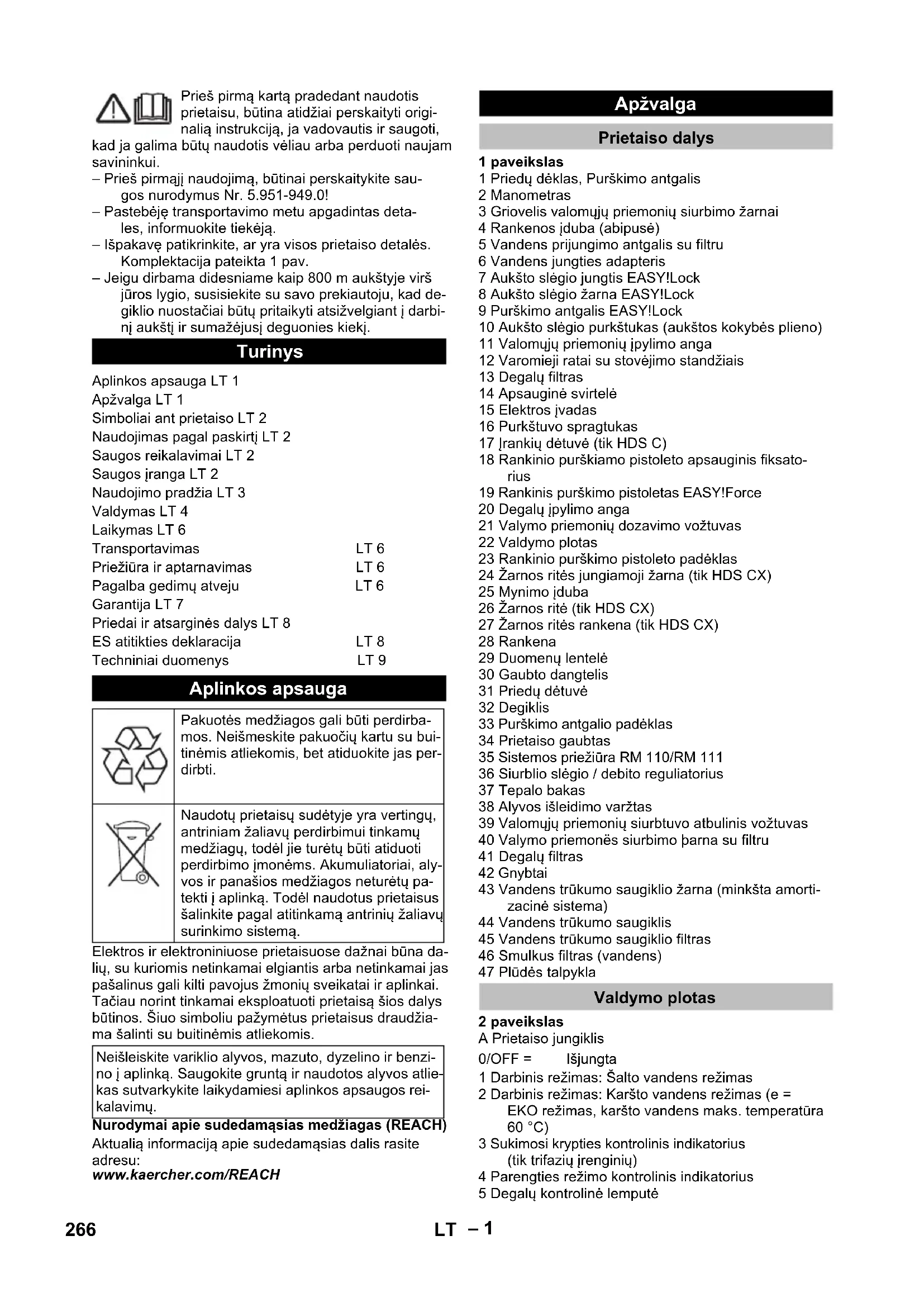 Tipiskā darba masa, C kg 118,1 118,1 121,1 Tipiskā darba masa, CX kg 121 121 124 Degvielas tvertne l 15,5 15,5 15,5 tīrīšanas līdzekļa tvertne l 15,5 15,5 15,5 265LV– 1 Prieš pirmą kartą pradedant naudotis prietaisu, būtina atidžiai perskaityti origi- nalią instrukciją, ja vadovautis ir saugoti, kad ja galima būtų naudotis vėliau arba perduoti naujam savininkui. – Prieš pirmąjį naudojimą, būtinai perskaitykite sau- gos nurodymus Nr. 5.951-949.0! – Pastebėję transportavimo metu apgadintas deta- les, informuokite tiekėją. – Išpakavę patikrinkite, ar yra visos prietaiso detalės. Komplektacija pateikta 1 pav. – Jeigu dirbama didesniame kaip 800 m aukštyje virš jūros lygio, susisiekite su savo prekiautoju, kad de- giklio nuostačiai būtų pritaikyti atsižvelgiant į darbi- nį aukštį ir sumažėjusį deguonies kiekį. Elektros ir elektroniniuose prietaisuose dažnai būna da- lių, su kuriomis netinkamai elgiantis arba netinkamai jas pašalinus gali kilti pavojus žmonių sveikatai ir aplinkai. Tačiau norint tinkamai eksploatuoti prietaisą šios dalys būtinos. Šiuo simboliu pažymėtus prietaisus draudžia- ma šalinti su buitinėmis atliekomis. Nurodymai apie sudedamąsias medžiagas (REACH) Aktualią informaciją apie sudedamąsias dalis rasite adresu: www.kaercher.com/REACH 1 paveikslas 1 Priedų dėklas, Purškimo antgalis 2 Manometras 3 Griovelis valomųjų priemonių siurbimo žarnai 4 Rankenos įduba (abipusė) 5 Vandens prijungimo antgalis su filtru 6 Vandens jungties adapteris 7 Aukšto slėgio jungtis EASY!Lock 8 Aukšto slėgio žarna EASY!Lock 9 Purškimo antgalis EASY!Lock 10 Aukšto slėgio purkštukas (aukštos kokybės plieno) 11 Valomųjų priemonių įpylimo anga 12 Varomieji ratai su stovėjimo standžiais 13 Degalų filtras 14 Apsauginė svirtelė 15 Elektros įvadas 16 Purkštuvo spragtukas 17 Įrankių dėtuvė (tik HDS C) 18 Rankinio purškiamo pistoleto apsauginis fiksato- rius 19 Rankinis purškimo pistoletas EASY!Force 20 Degalų įpylimo anga 21 Valymo priemonių dozavimo vožtuvas 22 Valdymo plotas 23 Rankinio purškimo pistoleto padėklas 24 Žarnos ritės jungiamoji žarna (tik HDS CX) 25 Mynimo įduba 26 Žarnos ritė (tik HDS CX) 27 Žarnos ritės rankena (tik HDS CX) 28 Rankena 29 Duomenų lentelė 30 Gaubto dangtelis 31 Priedų dėtuvė 32 Degiklis 33 Purškimo antgalio padėklas 34 Prietaiso gaubtas 35 Sistemos priežiūra RM 110/RM 111 36 Siurblio slėgio / debito reguliatorius 37 Tepalo bakas 38 Alyvos išleidimo varžtas 39 Valomųjų priemonių siurbtuvo atbulinis vožtuvas 40 Valymo priemonës siurbimo þarna su filtru 41 Degalų filtras 42 Gnybtai 43 Vandens trūkumo saugiklio žarna (minkšta amorti- zacinė sistema) 44 Vandens trūkumo saugiklis 45 Vandens trūkumo saugiklio filtras 46 Smulkus filtras (vandens) 47 Plūdės talpykla 2 paveikslas A Prietaiso jungiklis 1 Darbinis režimas: Šalto vandens režimas 2 Darbinis režimas: Karšto vandens režimas (e = EKO režimas, karšto vandens maks. temperatūra 60 °C) 3 Sukimosi krypties kontrolinis indikatorius (tik trifazių įrenginių) 4 Parengties režimo kontrolinis indikatorius 5 Degalų kontrolinė lemputė Turinys Aplinkos apsauga LT 1 Apžvalga LT 1 Simboliai ant prietaiso LT 2 Naudojimas pagal paskirtį LT 2 Saugos reikalavimai LT 2 Saugos įranga LT 2 Naudojimo pradžia LT 3 Valdymas LT 4 Laikymas LT 6 Transportavimas LT 6 Priežiūra ir aptarnavimas LT 6 Pagalba gedimų atveju LT 6 Garantija LT 7 Priedai ir atsarginės dalys LT 8 ES atitikties deklaracija LT 8 Techniniai duomenys LT 9 Aplinkos apsauga Pakuotės medžiagos gali būti perdirba- mos. Neišmeskite pakuočių kartu su bui- tinėmis atliekomis, bet atiduokite jas per- dirbti. Naudotų prietaisų sudėtyje yra vertingų, antriniam žaliavų perdirbimui tinkamų medžiagų, todėl jie turėtų būti atiduoti perdirbimo įmonėms. Akumuliatoriai, aly- vos ir panašios medžiagos neturėtų pa- tekti į aplinką. Todėl naudotus prietaisus šalinkite pagal atitinkamą antrinių žaliavų surinkimo sistemą. Neišleiskite variklio alyvos, mazuto, dyzelino ir benzi- no į aplinką. Saugokite gruntą ir naudotos alyvos atlie- kas sutvarkykite laikydamiesi aplinkos apsaugos rei- kalavimų. Apžvalga Prietaiso dalys Valdymo plotas 0/OFF = Išjungta 266 LT– 2 6 Serviso kontrolinis indikatorius 7 Valymo priemonių kontrolinis indikatorius 8 Sisteminės priežiūros priemonės kontrolinis indika- torius – Valymo proceso valdymo elementai yra geltonos spalvos. – Techninės priežiūros valdymo elementai yra švie- siai pilkos spalvos. Netinkamai naudojama aukšto slėgio sro- vė kelia pavojų. Draudžiama srovę nu- kreipti į asmenis, gyvūnus, veikiančią elektros įrangą arba patį prietaisą. Skirtas valyti: mašinoms, automobiliams, statiniams, įrankiams, fasadams, terasoms, sodo prietaisams ir t.t. PAVOJUS Sužalojimų pavojus! Naudodami degalinėse ir kitose pavojingose vietose, laikykitės reikiamų saugos reikala- vimų. Reikalavimai vandens kokybei: DĖMESIO Kaip aukšto slėgio terpė gali būti naudojamas tik švarus vanduo. Užterštas prietaisas ir priedas greičiau susidėvi arba dėl to gali atsirasti nuosėdų. Jei naudojamas perdirbtas vanduo, negali būti viršytos šios ribinės reikšmės. – Laikykitės nacionalinių teisės normų dėl skysčių purkštuvų