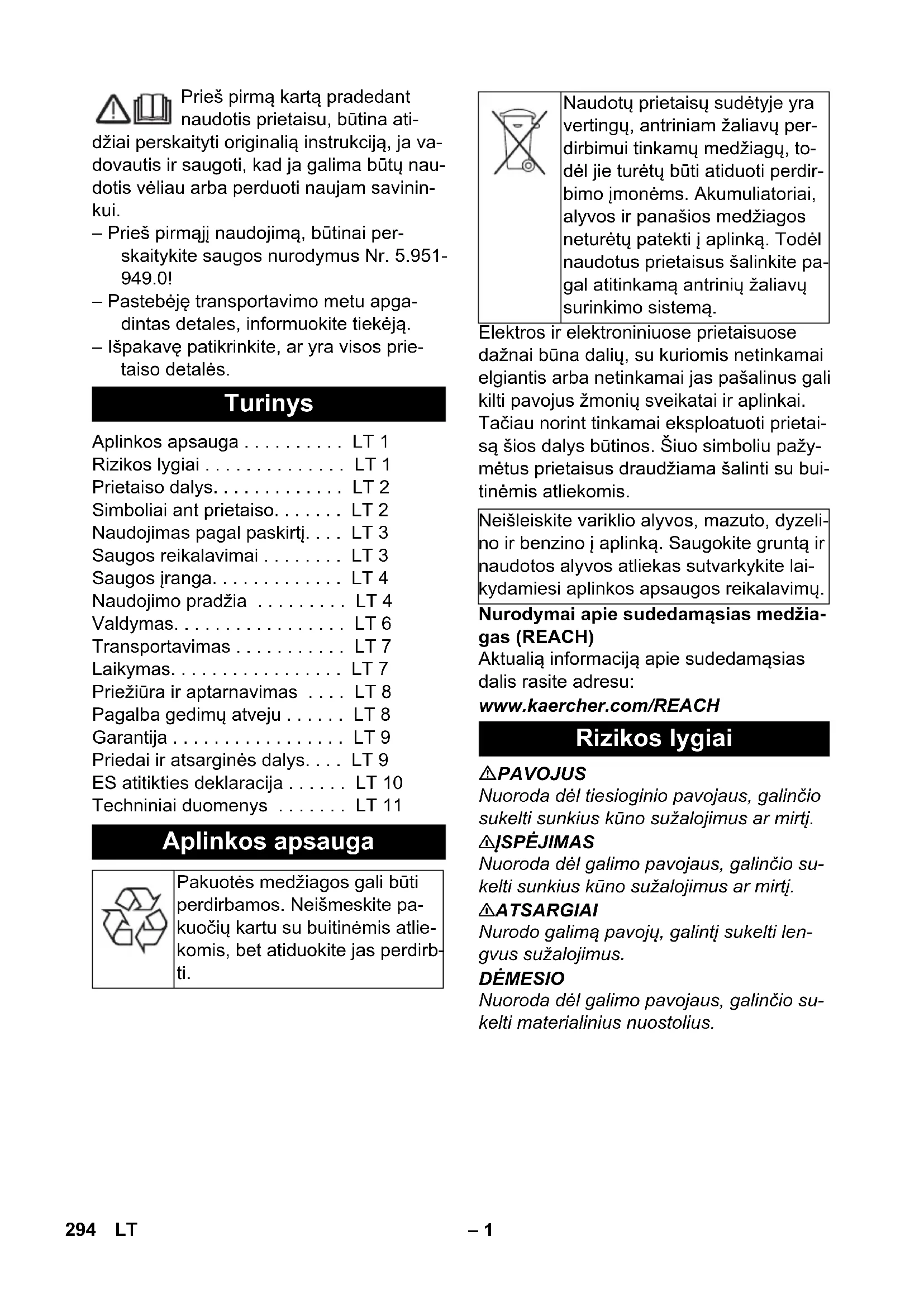 0,6 0,7 293LV– 1 Prieš pirmą kartą pradedant naudotis prietaisu, būtina ati- džiai perskaityti originalią instrukciją, ja va- dovautis ir saugoti, kad ja galima būtų nau- dotis vėliau arba perduoti naujam savinin- kui. – Prieš pirmąjį naudojimą, būtinai per- skaitykite saugos nurodymus Nr. 5.951- 949.0! – Pastebėję transportavimo metu apga- dintas detales, informuokite tiekėją. – Išpakavę patikrinkite, ar yra visos prie- taiso detalės. Elektros ir elektroniniuose prietaisuose dažnai būna dalių, su kuriomis netinkamai elgiantis arba netinkamai jas pašalinus gali kilti pavojus žmonių sveikatai ir aplinkai. Tačiau norint tinkamai eksploatuoti prietai- są šios dalys būtinos. Šiuo simboliu pažy- mėtus prietaisus draudžiama šalinti su bui- tinėmis atliekomis. Nurodymai apie sudedamąsias medžia- gas (REACH) Aktualią informaciją apie sudedamąsias dalis rasite adresu: www.kaercher.com/REACH PAVOJUS Nuoroda dėl tiesioginio pavojaus, galinčio sukelti sunkius kūno sužalojimus ar mirtį. 몇 ĮSPĖJIMAS Nuoroda dėl galimo pavojaus, galinčio su- kelti sunkius kūno sužalojimus ar mirtį. 몇 ATSARGIAI Nurodo galimą pavojų, galintį sukelti len- gvus sužalojimus. DĖMESIO Nuoroda dėl galimo pavojaus, galinčio su- kelti materialinius nuostolius. Turinys Aplinkos apsauga . . . . . . . . . . LT 1 Rizikos lygiai . . . . . . . . . . . . . . LT 1 Prietaiso dalys. . . . . . . . . . . . . LT 2 Simboliai ant prietaiso. . . . . . . LT 2 Naudojimas pagal paskirtį. . . . LT 3 Saugos reikalavimai . . . . . . . . LT 3 Saugos įranga. . . . . . . . . . . . . LT 4 Naudojimo pradžia . . . . . . . . . LT 4 Valdymas. . . . . . . . . . . . . . . . . LT 6 Transportavimas . . . . . . . . . . . LT 7 Laikymas. . . . . . . . . . . . . . . . . LT 7 Priežiūra ir aptarnavimas . . . . LT 8 Pagalba gedimų atveju . . . . . . LT 8 Garantija . . . . . . . . . . . . . . . . . LT 9 Priedai ir atsarginės dalys. . . . LT 9 ES atitikties deklaracija . . . . . . LT 10 Techniniai duomenys . . . . . . . LT 11 Aplinkos apsauga Pakuotės medžiagos gali būti perdirbamos. Neišmeskite pa- kuočių kartu su buitinėmis atlie- komis, bet atiduokite jas perdirb- ti. Naudotų prietaisų sudėtyje yra vertingų, antriniam žaliavų per- dirbimui tinkamų medžiagų, to- dėl jie turėtų būti atiduoti perdir- bimo įmonėms. Akumuliatoriai, alyvos ir panašios medžiagos neturėtų patekti į aplinką. Todėl naudotus prietaisus šalinkite pa- gal atitinkamą antrinių žaliavų surinkimo sistemą. Neišleiskite variklio alyvos, mazuto, dyzeli- no ir benzino į aplinką. Saugokite gruntą ir naudotos alyvos atliekas sutvarkykite lai- kydamiesi aplinkos apsaugos reikalavimų. Rizikos lygiai 294 LT– 2 1 Purkštukų varžtų jungtis 2 Antgalis 3 Purškimo antgalis EASY!Lock 4 Rankinis purškimo pistoletas EA- SY!Force 5 Apsauginis fiksatorius 6 Purkštuvo spragtukas 7 Apsauginė svirtelė 8 Aukšto slėgio žarna EASY!Lock 9 Tepalo bakas 10 Manometras * 11 Degalų čiaupas 12 Rankinis paleidiklis 13 Alyvos išleidimo varžtas (variklio) 14 Purkštuko laikiklis purkštuko laikymui 15 Vandens filtras 16 Valymo priemonės siurbimo žarna turi reguliuojamą filtrą (dozavimo vožtuvas) 17 Vandens prijungimo antgalis 18 Siurblio alyvos išleidimo varžtas 19 Aukšto slėgio jungtis EASY!Lock 20 Alyvos žarnos langelis * 21 Slėgio / kiekio reguliavimas * 22 Krovinio vamzdžio laikiklis 23 Aukšto slėgio siurblys 24 Alyvos lygio matuoklis (variklio) 25 Variklis 26 Variklio jungiklis 27 Degalų bakas 28 Stūmimo rankenos varžtas su rankenėle 29 Rankinio purškimo pistoleto laikiklis 30 Žarnos laikiklis 31 Stūmimo rankena A Kreipiamoji veržlė B Filtro indas C Sandarinamasis žiedas D Filtro kasetė