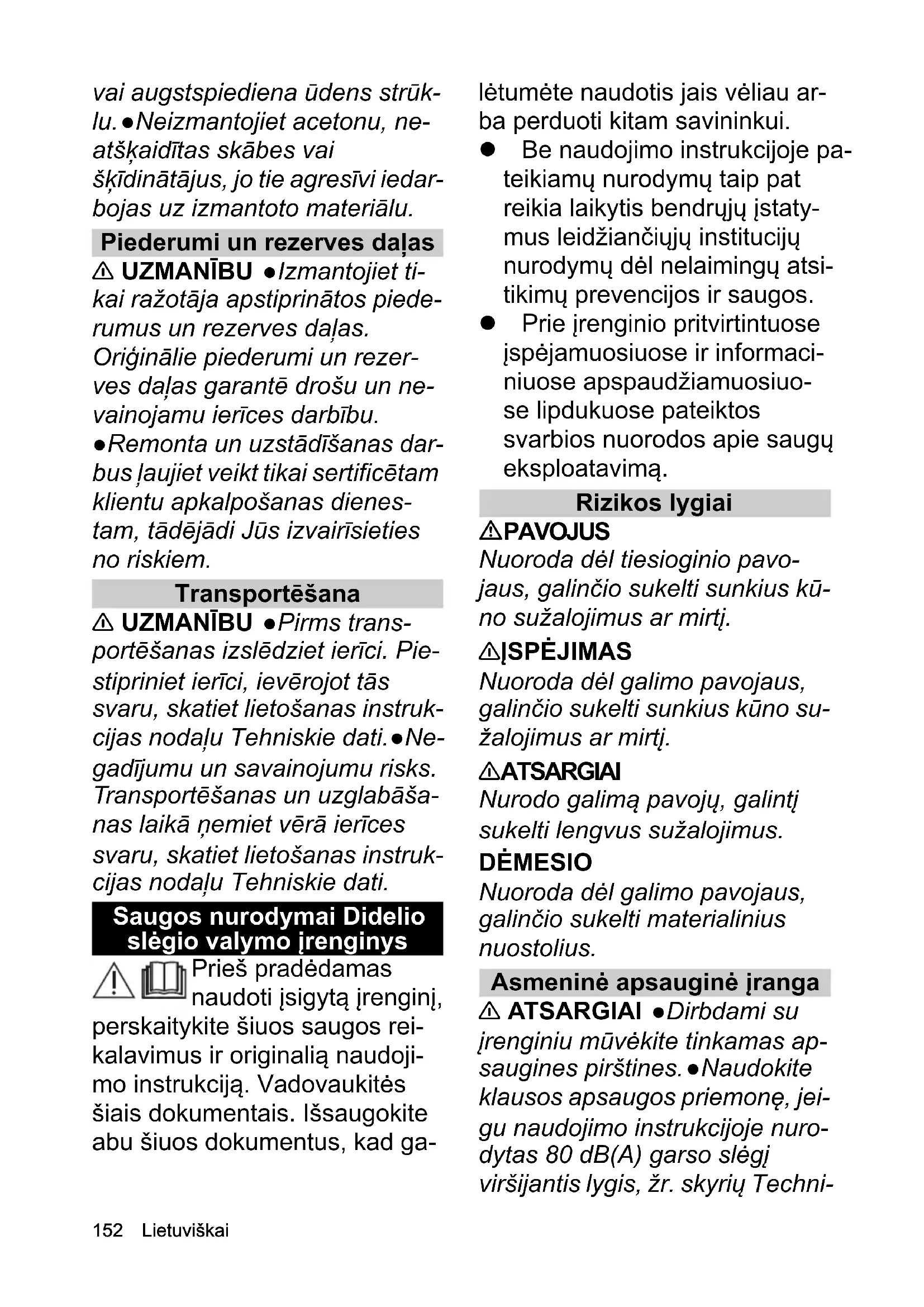 roje kaip 0 °C. ●Variklį valykite tik tose valymo vietose, kuriose yra alyvos separatorius. Eksploatavimas su valikliu 몇 ATSARGIAI ●Pasirūpinkite, kad valiklis nebūtų prieinamas vaikams. ●Naudodami valymo priemonę vadovaukitės valymo priemonės gamintojo saugos duomenų lapu, ypač nurody-156 Lietuviškai mais dėl asmeninių apsaugos priemonių. ●Naudokite tik ga- mintojo pristatytą ar rekomen- duotą valiklį. Naudojant kitas valymo priemones arba chemi- kalus gali sumažėti prietaiso saugumas. ●Nenaudokite reko- menduojamos valymo priemo- nės neskiestos. Produktus naudoti saugu, nes juose nėra jokių rūgščių, šarmų arba aplin- kai žalingų medžiagų. Valymo priemonei susilietus su akimis, nedelsdami plaukite jas dideliu kiekiu vandens ir nedelsdami kreipkitės į gydytoją, taip pat ir priemonės prarijus. Maža vibracija rankas veikiantis prietaisas > 2,5 m/s² (žr.Eksploatavimo instrukcijų skyrių Techniniai duomenys) 몇 ATSARGIAI Su prietaisu dirbant ilgą laiką vi- bracijos poveikis rankoms gali sukelti kraujo apytakos sutriki- mų. Tačiau negalima nustatyti bendrai galiojančios naudojimo trukmės, kadangi tai priklauso nuo daugybės veiksnių: Kiekvienam žmogui būdingo polinkio į kraujo apytakos su- trikimus (dažnai šąlantys ar niežtintys pirštai) Žemos aplinkos temperatū- ros. Rankoms apsaugoti mū- vėkite šiltas pirštines. Stipriai suspausto prietaiso laikymo. Nepertraukiamo naudojimo, kuris daro didesnę žalą negu naudojimas su pertraukomis. Jeigu įtaisas reguliariai ir ilgą lai- ką naudojamas ir šie simptomai (pvz., pirštų niežėjimas arba ša- limas) pasireiškia nuolat, turėtu- mėte kreiptis į gydytoją. Įrenginiai su oro padangomis 몇 ATSARGIAI ●Įrenginiams su priveržtais ratlankiais: Prieš pri- pildydami padangas slėgio, užti- krinkite, kad ratlankio varžtai tvirtai priveržti. ●Prieš pripildyda- mi padangas slėgio, užtikrinkite, kad kompresoriaus slėgio ribo- tuvas nustatytas tinkamai. ●Nie- kada neviršykite maksimalaus leistino padangų slėgio. Tinka- mas padangos slėgis pateiktas ant padangos arba ant ratlankio. Jeigu vertės skiriasi, naudokite mažesnę vertę. Karšto vandens ir benzinu varomi įrenginiai, įrenginiai su vidaus degimo varikliu PAVOJUS ●Sprogimo pavo- jus naudojant netinkamus dega- lus. Visada pilkite tik tuos degalus, kurie nurodyti naudoji- mo instrukcijoje. 몇 ĮSPĖJIMAS ●Išmetamosios dujos nuodingos. Neįkvėpkite iš- metamųjų dujų. Naudodami prietaisą patalpose užtikrinkite pakankamą vėdinimą ir išmeta- mųjų dujų išvedimą. ●PildamiLietuviškai 157 degalus užtikrinkite, kad degalų nepatektų ant įkaitusių paviršių. 몇 ATSARGIAI ●Pavojus apsi- deginti. Nesilenkite virš išmeta- mųjų dujų angos ir jos nelieskite. Veikiant degikliui nelieskite šil- dymo katilo. ●Niekada neužda- rykite išmetamųjų dujų angų. ●Užtikrinkite, kad arti oro įvadų nebūtų jokio išmetamųjų dujų nuotėkio. ●Vadovaukitės saugu- mo nurodymais, pateiktais ben- zinu varomų įrenginių naudojimo instrukcijoje. Techninė priežiūra ir eksploatacinės parengties užtikrinimas 몇 ĮSPĖJIMAS ●Prieš valymą, techninės priežiūros darbus ir prieš keičiant atsargines dalis, įrenginį reikia išjungti, o iš tinklo maitinamus įrenginius reikia atjungti nuo tinklo. ●Prieš bet ko- kius darbus su į renginiu ir jo priedais išleiskite iš aukšto slė- gio sistemos slėgį. 몇 ATSARGIAI ●Remonto dar- bus atlikti gali tik patvirtintos kli- entų aptarnavimo įstaigos arba šios srities specialistai, susipaži- nę su atitinkamomis saugos ins- trukcijomis. DĖMESIO ●Laikykitės saugos patikros nuostatų, taikomos ne- šiojamiems, komercinės paskir- ties naudotiems įrenginiams pagal vietoje galiojančius reika- lavimus ●Trumpieji jungimai ar- ba kiti pažeidimai. Nevalykite įrenginio žarna arba aukšto slė- gio vandens srove. ●Nenaudoki- te acetono, neskiestų rūgščių ir tirpiklių, nes jie gali paveikti prie- taiso medžiagas. Priedai ir atsarginės dalys 몇 ATSARGIAI ●Leidžiama naudoti tik gamintojo patvirtintus priedus ir atsargines dalis. Nau- dokite tik originalius priedus ir originalas atsargines dalis – taip užtikrinsite, kad įrenginys veiktų patikimai ir be trikčių. ●Remonto darbus atlikti ir sumontuoti atsar- gines dalis gali tik patvirtintos kli- entų aptarnavimo įstaigos, taip išvengsite galimo pavojaus. Transportavimas 몇 ATSARGIAI ●Prieš transpor- tavimą įrenginį išjunkite. Pritvir- tinkite įrenginį atsižvelgdami į jo svorį, žr. skyrių Techniniai duo- menys. ●Nelaimingo atsitikimo ir sužeidimo pavojus. Gabendami ir sandėliuodami įtaisą atsižvel- kite į jo masę, žr. skyrių Eksplo- atavimo instrukcijų skyrių Techniniai duomenys.158 Українська Вказівки з техніки безпеки Миючий апарат високого