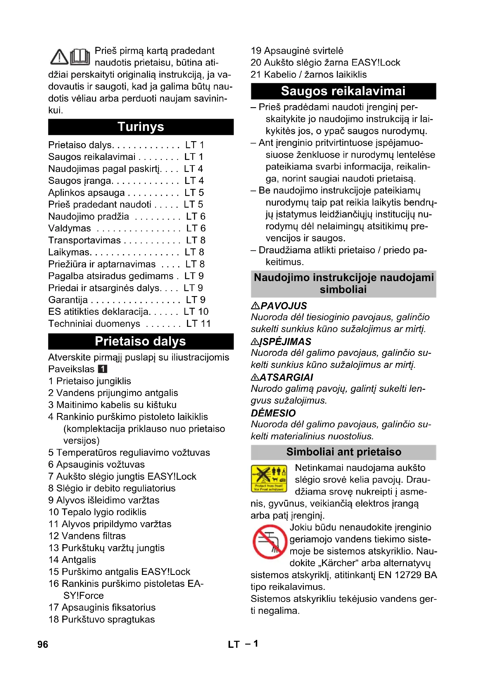 dB(A) 90 Izejmateriāli Eļļas daudzums l 0,4 Eļās veids -- 15W40 Izmēri un svars Garums mm 780 Platums mm 360 Augstums mm 500 Svars, darba gatavībā ar piederumiem kg 56,5 95LV– 1 Prieš pirmą kartą pradedant naudotis prietaisu, būtina ati- džiai perskaityti originalią instrukciją, ja va- dovautis ir saugoti, kad ja galima būtų nau- dotis vėliau arba perduoti naujam savinin- kui. Atverskite pirmąjį puslapį su iliustracijomis Paveikslas 1 Prietaiso jungiklis 2 Vandens prijungimo antgalis 3 Maitinimo kabelis su kištuku 4 Rankinio purškimo pistoleto laikiklis (komplektacija priklauso nuo prietaiso versijos) 5 Temperatūros reguliavimo vožtuvas 6 Apsauginis vožtuvas 7 Aukšto slėgio jungtis EASY!Lock 8 Slėgio ir debito reguliatorius 9 Alyvos išleidimo varžtas 10 Tepalo lygio rodiklis 11 Alyvos pripildymo varžtas 12 Vandens filtras 13 Purkštukų varžtų jungtis 14 Antgalis 15 Purškimo antgalis EASY!Lock 16 Rankinis purškimo pistoletas EA- SY!Force 17 Apsauginis fiksatorius 18 Purkštuvo spragtukas 19 Apsauginė svirtelė 20 Aukšto slėgio žarna EASY!Lock 21 Kabelio / žarnos laikiklis – Prieš pradėdami naudoti įrenginį per- skaitykite jo naudojimo instrukciją ir lai- kykitės jos, o ypač saugos nurodymų. – Ant įrenginio pritvirtintuose įspėjamuo- siuose ženkluose ir nurodymų lentelėse pateikiama svarbi informacija, reikalin- ga, norint saugiai naudoti prietaisą. – Be naudojimo instrukcijoje pateikiamų nurodymų taip pat reikia laikytis bendrų- jų įstatymus leidžiančiųjų institucijų nu- rodymų dėl nelaimingų atsitikimų pre- vencijos ir saugos. – Draudžiama atlikti prietaiso / priedo pa- keitimus. PAVOJUS Nuoroda dėl tiesioginio pavojaus, galinčio sukelti sunkius kūno sužalojimus ar mirtį. 몇 ĮSPĖJIMAS Nuoroda dėl galimo pavojaus, galinčio su- kelti sunkius kūno sužalojimus ar mirtį. 몇 ATSARGIAI Nurodo galimą pavojų, galintį sukelti len- gvus sužalojimus. DĖMESIO Nuoroda dėl galimo pavojaus, galinčio su- kelti materialinius nuostolius. Netinkamai naudojama aukšto slėgio srovė kelia pavojų. Drau- džiama srovę nukreipti į asme- nis, gyvūnus, veikiančią elektros įrangą arba patį įrenginį. Jokiu būdu nenaudokite įrenginio geriamojo vandens tiekimo siste- moje be sistemos atskyriklio. Nau- dokite „Kärcher“ arba alternatyvų sistemos atskyriklį, atitinkantį EN 12729 BA tipo reikalavimus. Sistemos atskyrikliu tekėjusio vandens ger- ti negalima. Turinys Prietaiso dalys. . . . . . . . . . . . . LT 1 Saugos reikalavimai . . . . . . . . LT 1 Naudojimas pagal paskirtį. . . . LT 4 Saugos įranga. . . . . . . . . . . . . LT 4 Aplinkos apsauga . . . . . . . . . . LT 5 Prieš pradedant naudoti . . . . . LT 5 Naudojimo pradžia . . . . . . . . . LT 6 Valdymas . . . . . . . . . . . . . . . . LT 6 Transportavimas . . . . . . . . . . . LT 8 Laikymas. . . . . . . . . . . . . . . . . LT 8 Priežiūra ir aptarnavimas . . . . LT 8 Pagalba atsiradus gedimams . LT 9 Priedai ir atsarginės dalys. . . . LT 9 Garantija . . . . . . . . . . . . . . . . . LT 9 ES atitikties deklaracija. . . . . . LT 10 Techniniai duomenys . . . . . . . LT 11 Prietaiso dalys Saugos reikalavimai Naudojimo instrukcijoje naudojami simboliai Simboliai ant prietaiso 96 LT– 2 Prietaiso dalys įkaista ir prie jų prisilietus galima nusideginti. Elektros srovės smūgio pavojus. Įrenginio korpusą atidaryti gali tik elektrikas. – Įtampa, nurodyta prietaiso modelio len- telėje, turi sutapti su elektros srovės šaltinio įtampa. – Minimalus tinklo lizdo saugiklis (žr. sky- rių „Techniniai duomenys“). – I apsaugos klasė - prietaisus galima jungti tik prie tinkamai įžeminto srovės šaltinio. – Šį prietaisą rekomenduojama jungti tik į kištukinį lizdą su 30 mA apsauginiu au- tomatiniu srovės pertraukikliu. – Reikia naudoti gamintojo tiekiamą mai- tinimo laidą, taip pat ir keičiant laidą. Užsakymo numerį ir modelį rasite nau- dojimo instrukcijoje. – Kiekvieną kartą prieš pradėdami nau- doti prietaisą patikrinkite, ar nepažeisti elektros laidas ir tinklo kištukas. Pažeis- tą elektros laidą nedelsdami pakeiskite oficialioje klientų aptarnavimo tarnyboje ar elektros prietaisų remonto įmonėje. – Prietaisą junkite tik į elektros lizdą,