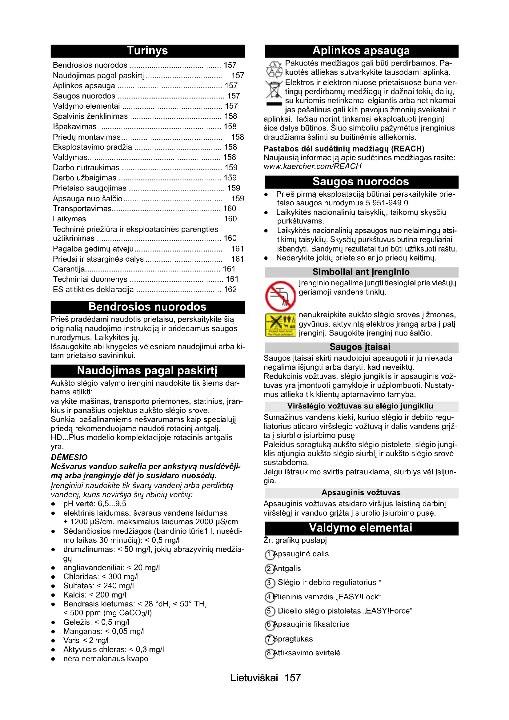 /l) ● Geležis: < 0,5 mg/l ● Manganas: < 0,05 mg/l ● Varis: < 2 mg/l ● Aktyvusis chloras: < 0,3 mg/l ● nėra nemalonaus kvapo Aplinkos apsauga Pakuotės medžiagos gali būti perdirbamos. Pa- kuotės atliekas sutvarkykite tausodami aplinką. Elektros ir elektroniniuose prietaisuose būna ver- tingų perdirbamų medžiagų ir dažnai tokių dalių, su kuriomis netinkamai elgiantis arba netinkamai jas pašalinus gali kilti pavojus žmonių sveikatai ir aplinkai. Tačiau norint tinkamai eksploatuoti įrenginį šios dalys būtinos. Šiuo simboliu pažymėtus įrenginius draudžiama šalinti su buitinėmis atliekomis. Pastabos dėl sudėtinių medžiagų (REACH) Naujausią informaciją apie sudėtines medžiagas rasite: www.kaercher.com/REACH Saugos nuorodos ● Prieš pirmą eksploataciją būtinai perskaitykite prie- taiso saugos nurodymus 5.951-949.0. ● Laikykitės nacionalinių taisyklių, taikomų skysčių purkštuvams.