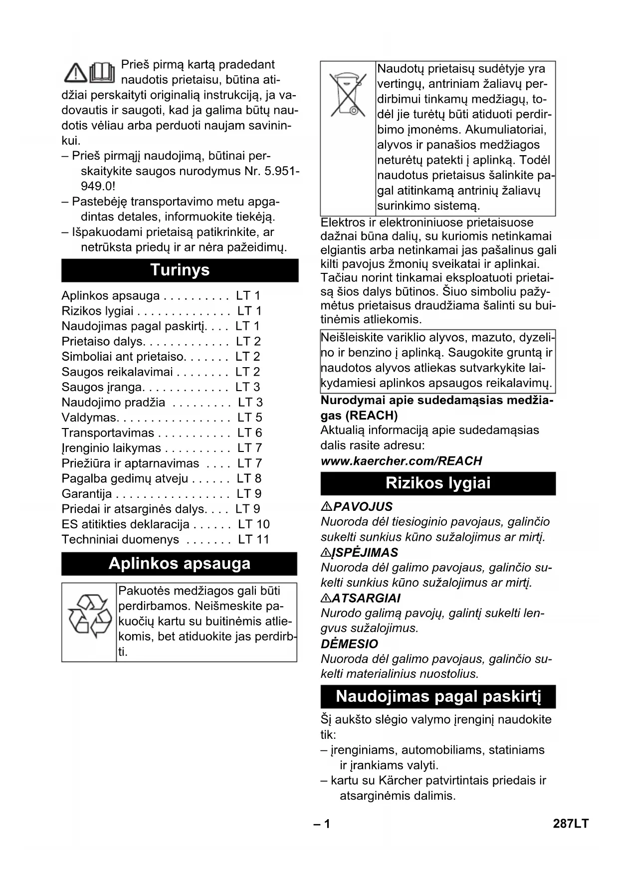Vandens prijungimo antgalis Parametras Vertė pH vertė 6,5...9,5 elektros laidumas max. 2000 μS/cm Angliavandeniai < 0,01 mg/l Chloridas < 250 mg/l Kalcis < 200 mg/l Bendrasis kietumas < 28 °dH Geležis < 0,2 mg/l Manganas < 0,05 mg/l Varis < 0,02 mg/l sulfatas < 240 mg/l aktyvusis chloras < 0,1 mg/l nėra nemalonaus kvapo 290 LT– 5 Jungties dydžius rasite ant prietaiso skyde- lio/techninėje specifikacijoje. Naudokite pakankamai tvirto audinio žarną (netiekiama kartu). Skersmuo - mažiausiai 3/4 colio. Žarną prijunkite prie prietaiso vandens čiaupo. Prijunkite žarną prie vandens čiaupo. PAVOJUS Jokiu būdu nesiurbkite vandens ir geriamo- jo vandens indo. Ši aukšto slėgio valymo mašina su atitinka- mais priedais pritaikyta paviršinio vandens, pvz., lietaus vandens iš rezervuarų arba tvenkinių, siurbimui (maks. siurbimo aukš- tis - 0,5 m). PAVOJUS Jokiu būdu neįsiurbkite tirpiklių sudėtyje tu- rinčių skysčių ar neskiestų rūgščių bei tirpi- klių! Tai taikoma, pavyzdžiui, benzinui, dažų skiedikliui ar skystajam kurui. Purš- kiamas rūkas yra labai degus, sprogus ir nuodingas. Nenaudokite acetono, neskies- tų rūgščių ir tirpiklių, nes jie gali paveikti prietaiso medžiagas. Standartinė vandens sistema nepritai- kyta siurbimui, todėl „Kärcher“ siurbimo žarną (mažiausiai 1 colio skersmens) naudokite su filtru (specialus priedas). Atsukite čiaupą. Nusukite antgalį. Paspauskite rankinio purškimo pistole- to svertą. Įjunkite prietaisą ir palaukite, kol iš purš- kimo antgalio bėgs vanduo be purslų. Išjunkite prietaisą ir vėl priveržkite purkštuką. PAVOJUS – Sužalojimų pavojus! Niekada nenaudo- kite prietaiso, nesumontavę purškimo vamzdžio. Prieš naudodami kiekvieną kartą patikrinkite, ar gerai pritvirtintas purškimo vamzdis. Purškimo vamzdžio sąvarža turi būti priveržta ranka. – Naudodami įrenginį pavojingose zonoje (pvz., degalinėse), laikykitės atitinkamų saugos taisyklių. – Susižalojimo pavojus! Naudojant prie- taisą, pistoleto spragtukas ir apsauginė svirtis neturi būti užspaustos. – Susižalojimo pavojus! Jeigu apsauginė svirtis turi defektų, kreipkitės į klientų aptarnavimo tarnybą. – Pavojus susižaloti naudojant aukšto slėgio srovę. Prieš pradėdami dirbti su įrenginiu rankinio purškimo pistoleto ap- sauginį fiksatorių pastumkite į priekį. 몇 ATSARGIAI Variklius valykite tik atitinkamose vietose su įrengtu alyvos atskyrikliu (dėl aplinkos apsaugos). Atidarykite rankinį purškimo pistoletą: pa- spauskite apsauginę svirtį ir spragtuką. Uždarykite rankinį purkštuvą: atleiskite apsauginę svirtį ir spragtuką. Atsukite čiaupą. Įkiškite elektros laido kištuką. Prietaiso jungiklį nustatykite ties „I“. Atblokuokite rankinį purškimo pistoletą ir pastumkite apsauginį fiksatorių atgal. Atverkite rankinį purškimo pistoletą. Prietaisas turi šiuos antgalius: – Galingas antgalis, 25° purškimo kam- pas – Rotorinis antgalis – Paprasčiausiems valymo darbams – Sukietėjusio purvo plotams Vandens siurbimas iš rezervuarų Prietaiso nuorinimas Valdymas Rankinio purškimo pistoleto atidarymas / uždarymas Prietaiso įjungimas Naudojimas esant aukštam slėgiui Galingas antgalis Rotorinis antgalis 291LT– 6 PAVOJUS Nustatydami slėgio ir debito reguliatorių, at- kreipkite dėmesį į tai, kad neatsilaisvintų purškimo vamzdžio sąvarža. Darbinį slėgį ir debitą galima nustatyti siur- blyje arba rankiniame purkštuve. Sumažinti slėgį arba kiekį vienu metu abiem reguliatoriais negalima. Todėl būti- nai laikykitės tokios darbo tvarkos: Rankiniame purkštuve nustatykite di- džiausią darbinį slėgį ir debitą (+). Darbinį slėgį ir debitą nustatykite siur- blio slėgio ir debito reguliatoriumi. Darbinį slėgį galite išmatuoti manome- tru. Atverkite rankinį purškimo pistoletą. Siurblio reguliatorių pasukite laikrodžio rodyklės kryptimi ir nustatykite didžiau- sią darbinį slėgį ir debitą. Darbinį slėgį ir debitą nustatykite ranki- nio purkštuvo slėgio ir debito reguliato- riumi (+/-). Atverkite rankinį purškimo pistoletą. Uždarykite rankinį purkštuvą. Prietaisas išsijungia po 30 sekundžių. Užfiksuokite rankinį purškimo pistoletą ir pastumkite apsauginį fiksatorių į prie- kį. Rankinį purkštuvą su purškimo antgaliu įstatykite į priedų dėklą. Po pertraukos: Atblokuokite rankinį purškimo pistoletą ir pastumkite apsauginį fiksatorių atgal. Atverkite rankinį purškimo pistoletą. Įrenginys vėl įsijungia. Ilgesnį laiką naudoję prietaisą su sūdytu vandeniu, bent 2 - 3 minutes gerai iš- plaukite prietaisą su atidarytu rankiniu purkštuvu vandentiekio vandeniu. Užsukite čiaupą. Atverkite rankinį purškimo pistoletą. Įjunkite siurblį prietaiso jungikliu ir 5–10 sekundžių palaikykite įjungtą. Uždarykite rankinį purkštuvą. Prietaiso jungiklį nustatykite į padėtį „0/ OFF“. Tik sausomis rankomis ištraukite tinklo kištuką iš lizdo. Atjunkite vandens tiekimą. Įjunkite rankinį purkštuvą, kol prietaiso nebeveiks slėgis. Užfiksuokite rankinį purškimo pistoletą ir pastumkite apsauginį fiksatorių į priekį. Maitinimo kabelį, aukšto slėgio žarną ir kitus prietaisus sudėti ant prietaiso. DĖMESIO Pažeidimo pavojus! Sušalęs vanduo prie- taise gali sugadinti jo dalis. Žiemą prietaisą ištuštinkite arba laikykite nors šiek tiek šildomoje patalpoje. Ilgesnį laiką nenaudojant prietaiso, patariama per- pumpuoti siurbliu antifrizo. Nusukite nuo prietaiso vandens tiekimo ir aukšto slėgio žarnas. Nupūskite prietaisą suslėgtu oru. Pastaba: naudokite paprastai parduodamus antifri- zus automobiliams su glikoliu. Laikykitės antifrizo gamintojo pateikiamų naudojimo instrukcijų. 몇 ATSARGIAI Sužalojimų ir pažeidim ų pavojus! Transpor- tuodami įrenginį, atsižvelkite į jo masę. DĖMESIO Transportuojant spragtukai saugo nuo pa- že